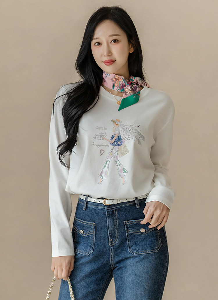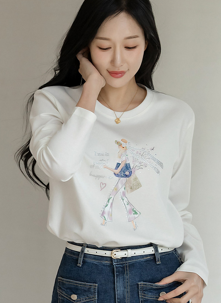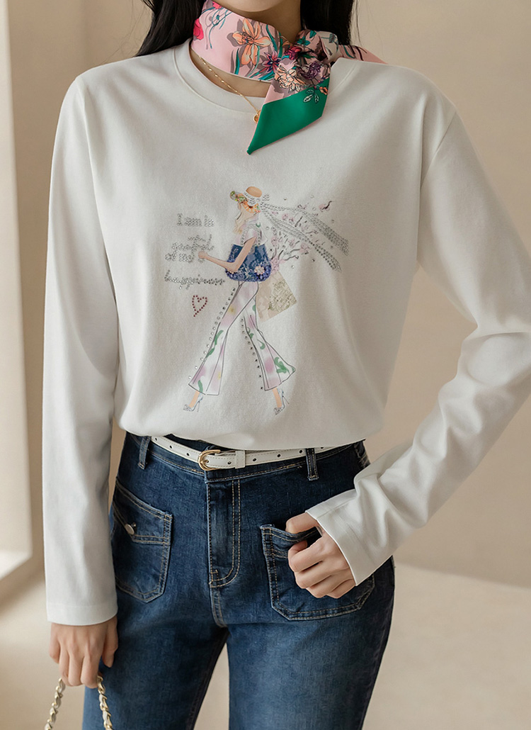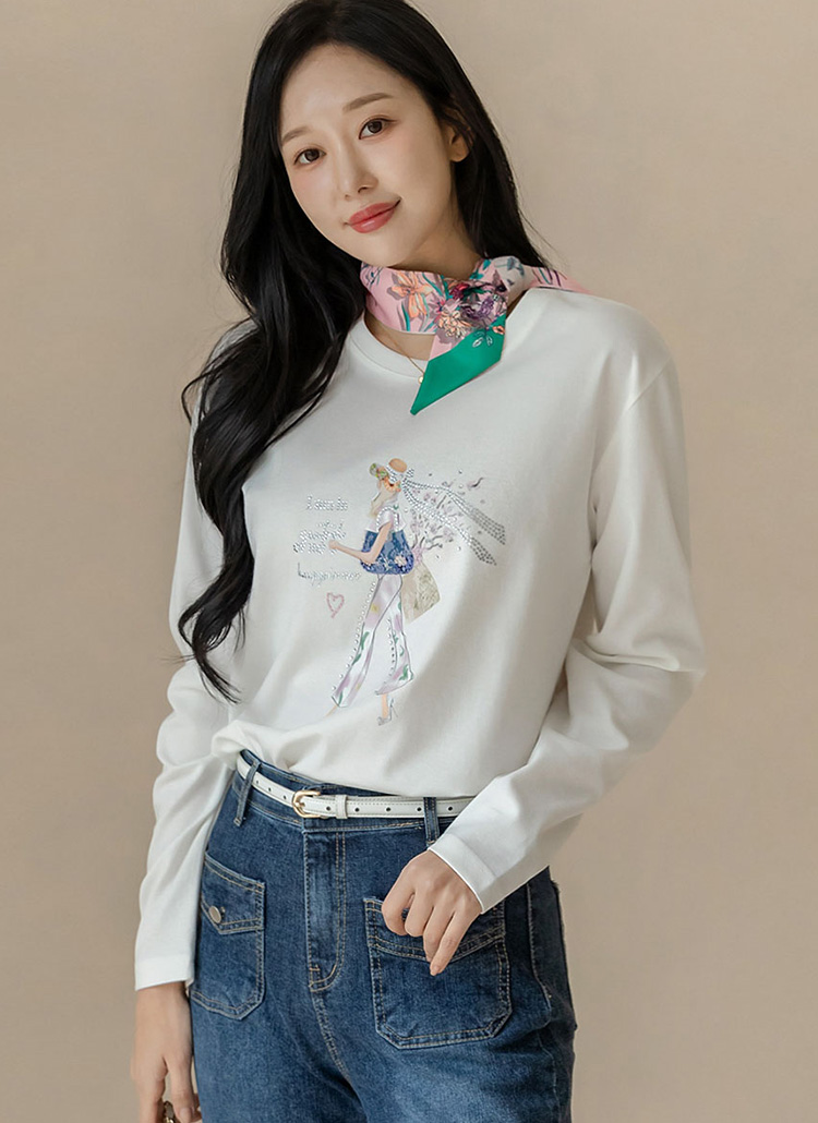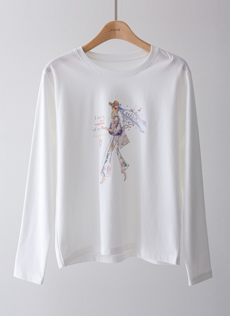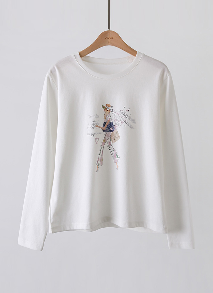 [루이스엔젤] 에나린 스프링 걸 핫픽스 드로잉 프린팅 라운드 긴팔 티셔츠