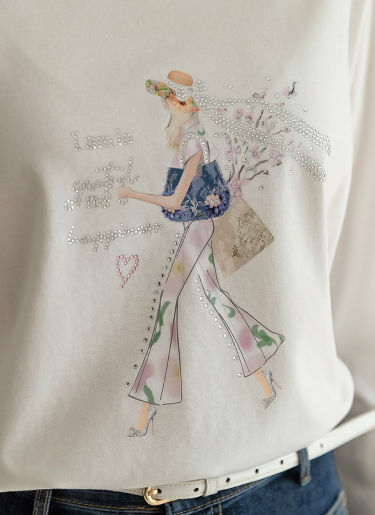 [Soft pastel tones meet a chic illustrated girl print with subtle crystal accents, offering a polished casual tee that brightens everyday spring layering looks.]
