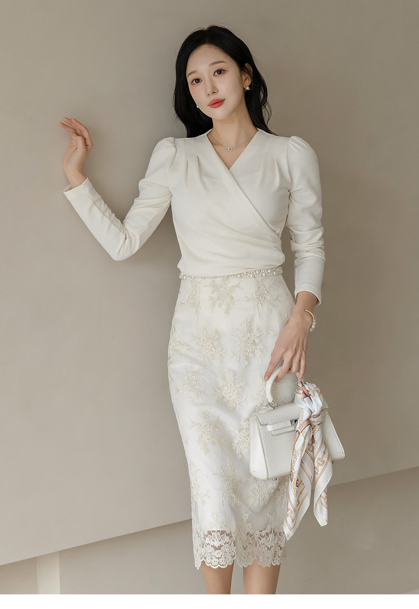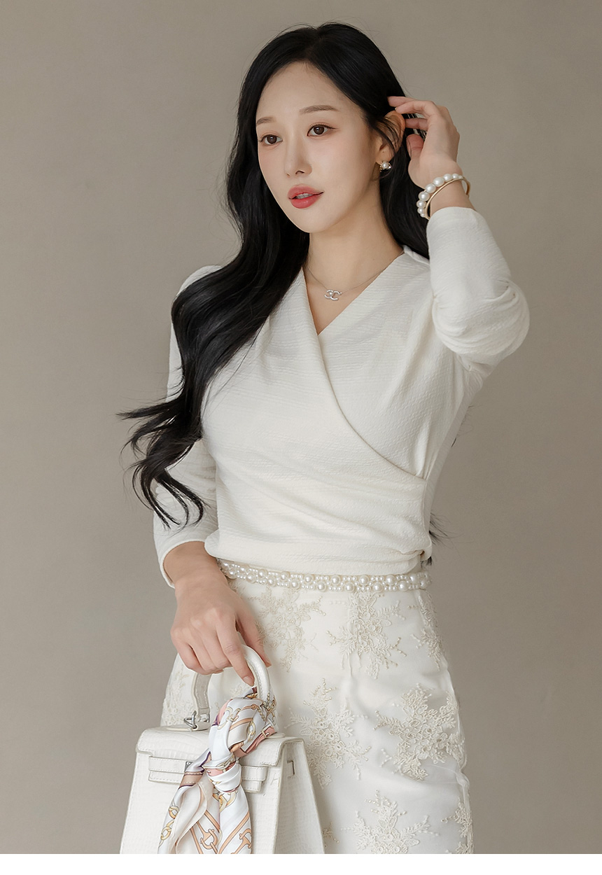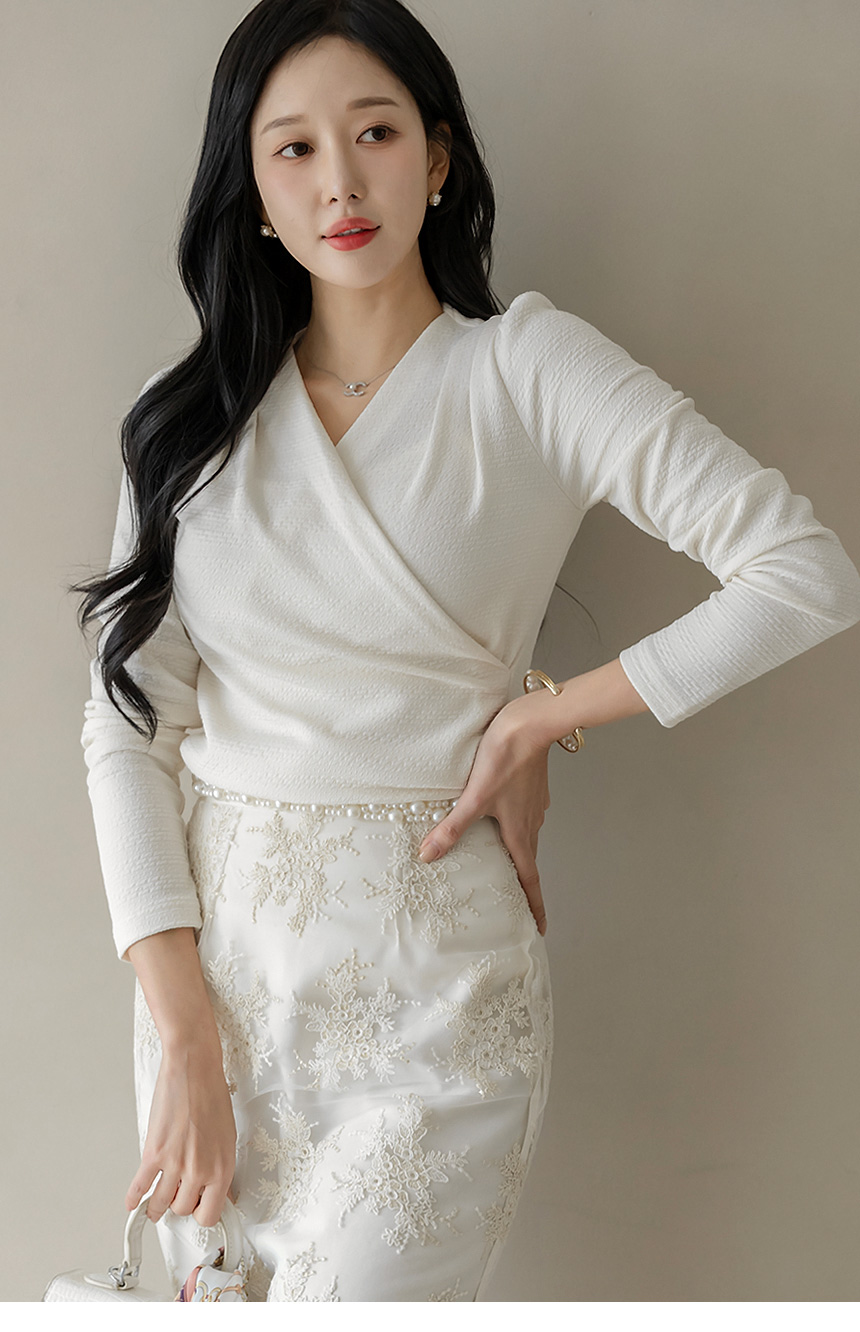 [A textured jacquard wrap blouse tee with refined shirring defines the waist, enhances curves, and delivers a polished, slim silhouette for elevated daily styling.]
