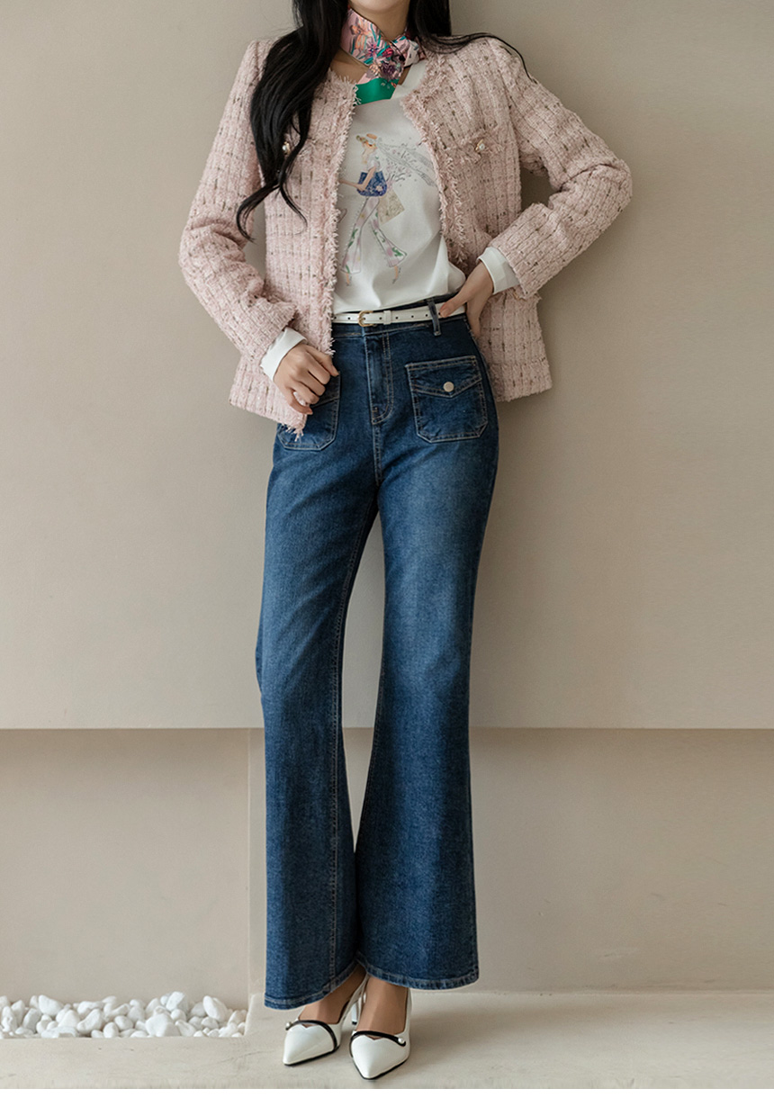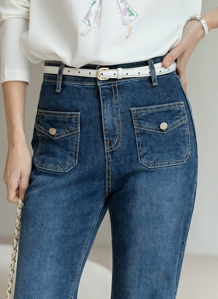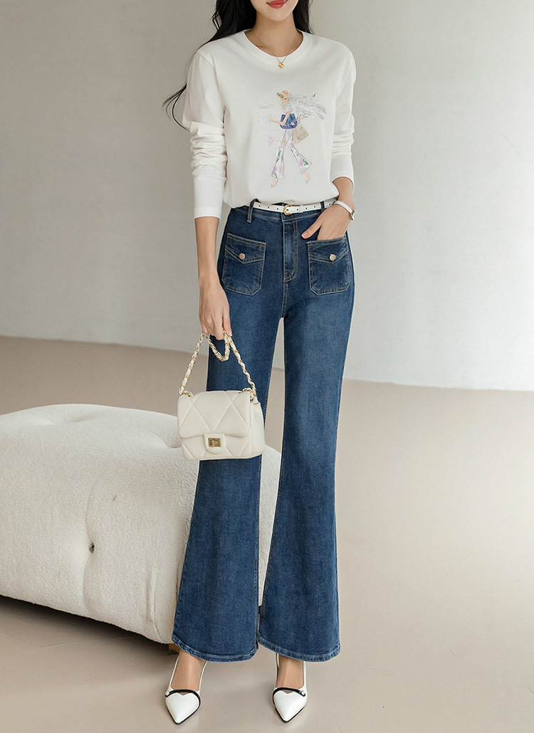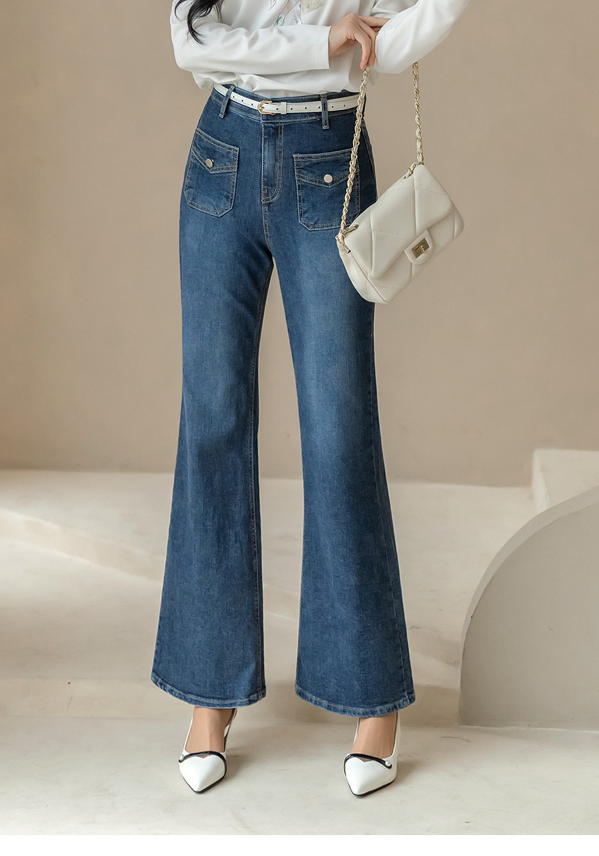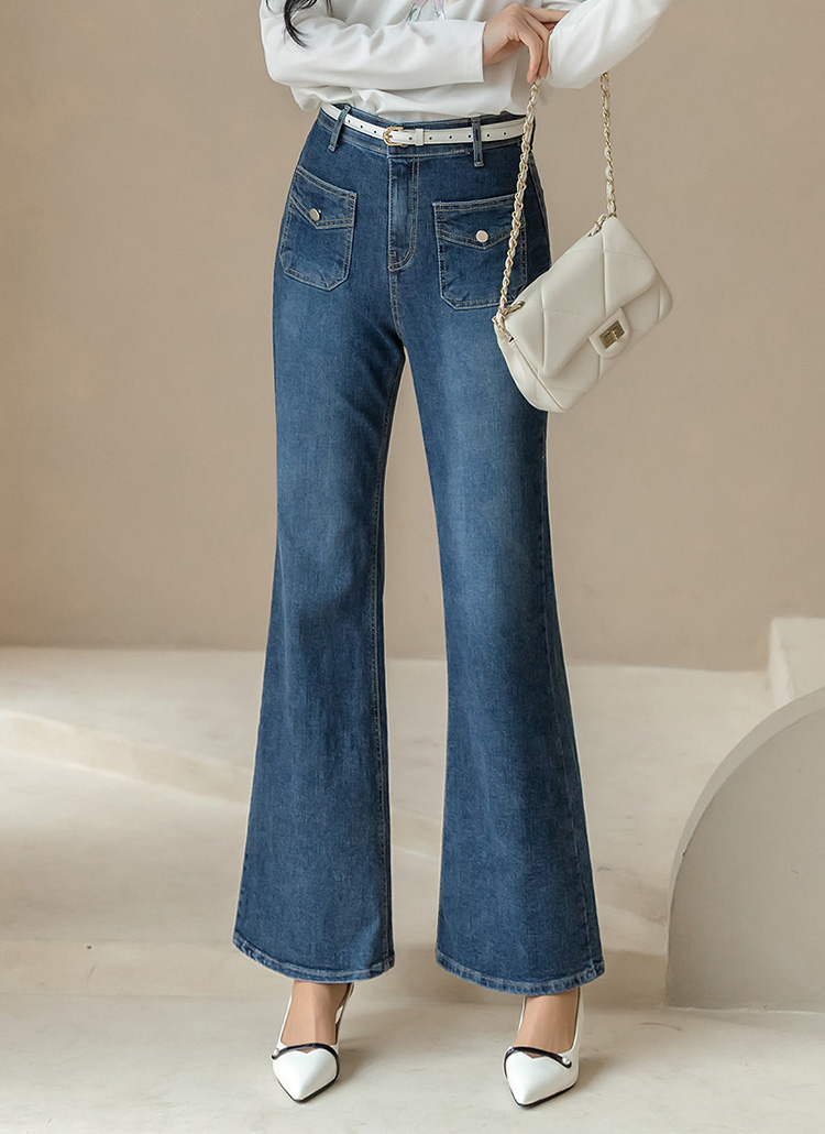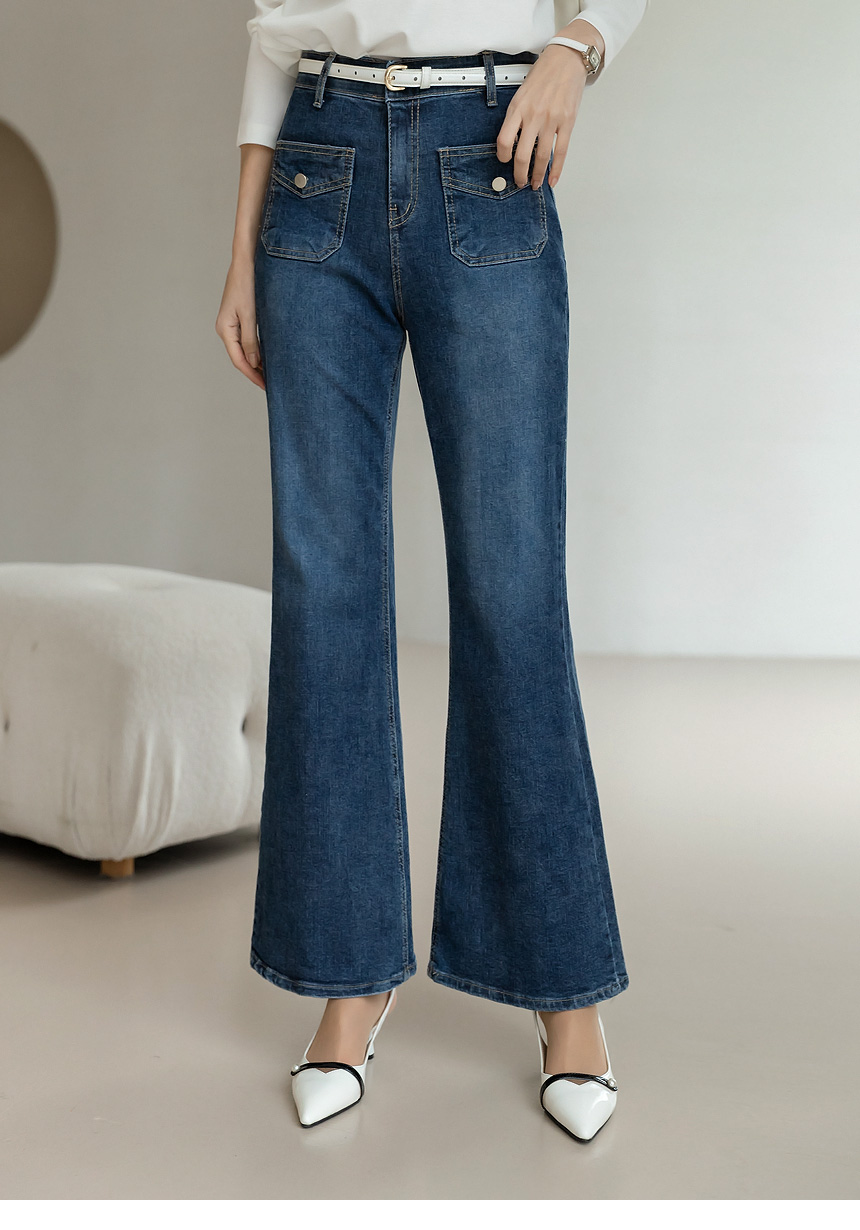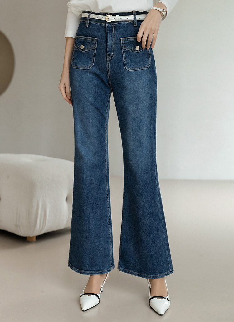 [Designed with slim thighs and a graceful bootcut finish, these stretch denim pants feature chic flap pockets and a smooth hidden band for all-day comfort and polish.]