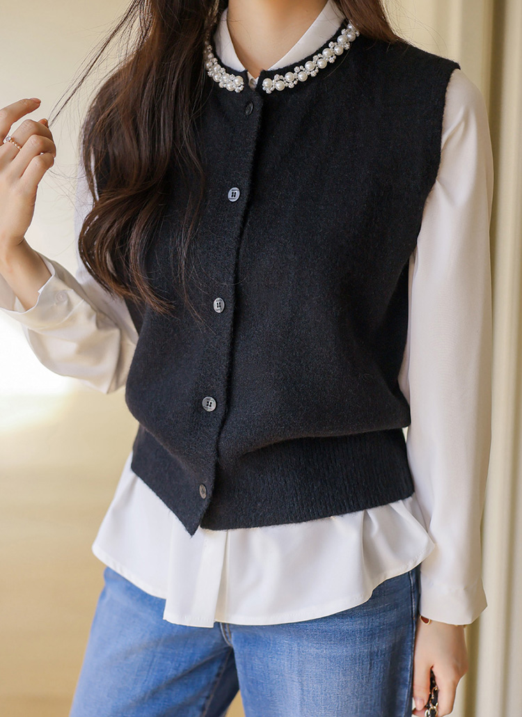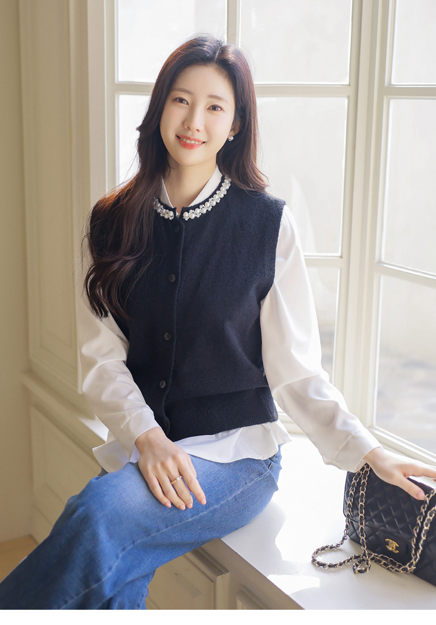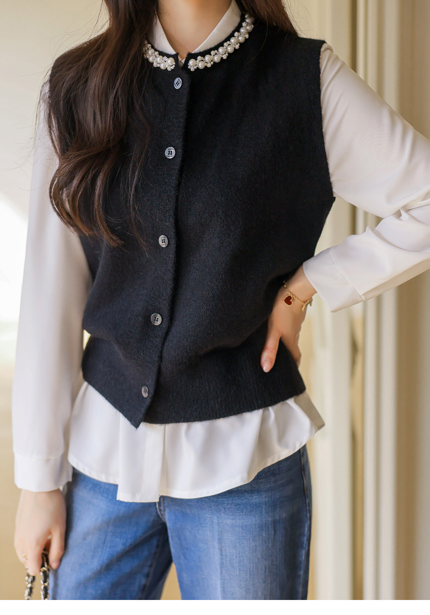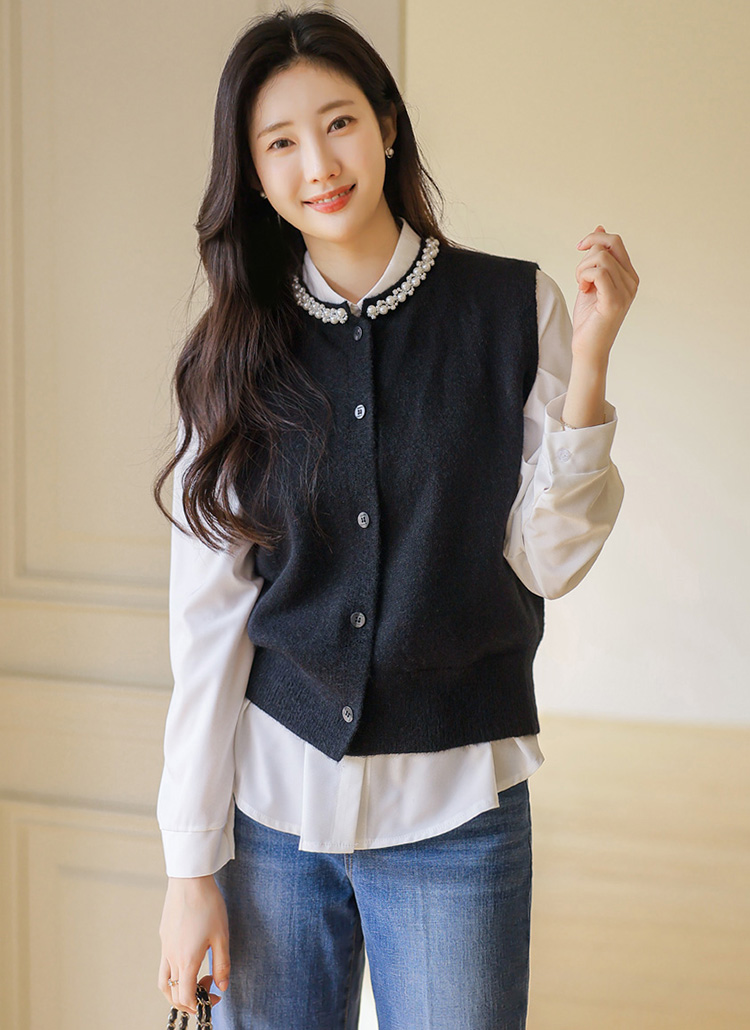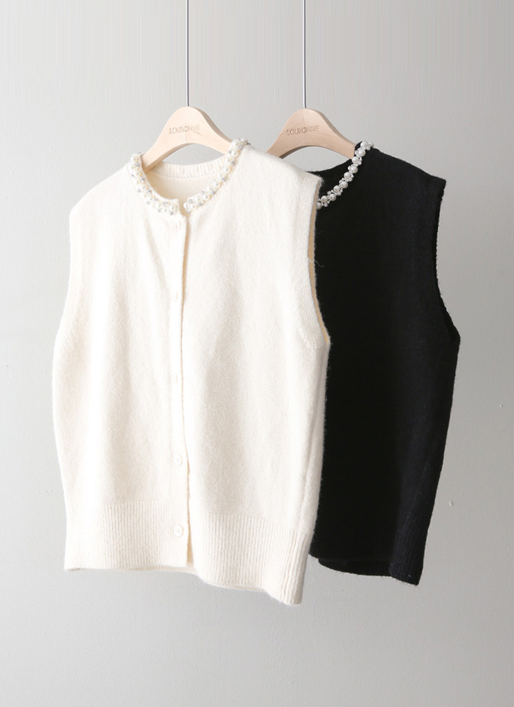 [A refined knit vest with pearl and crystal trim along the neckline, softly brightening the face while offering a clean silhouette perfect for layered office and seasonal looks.]