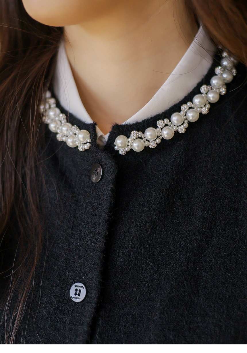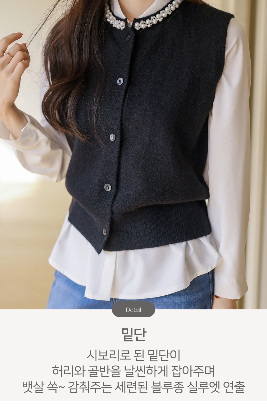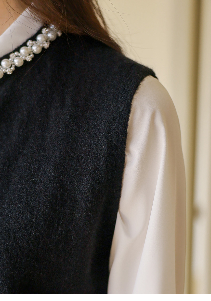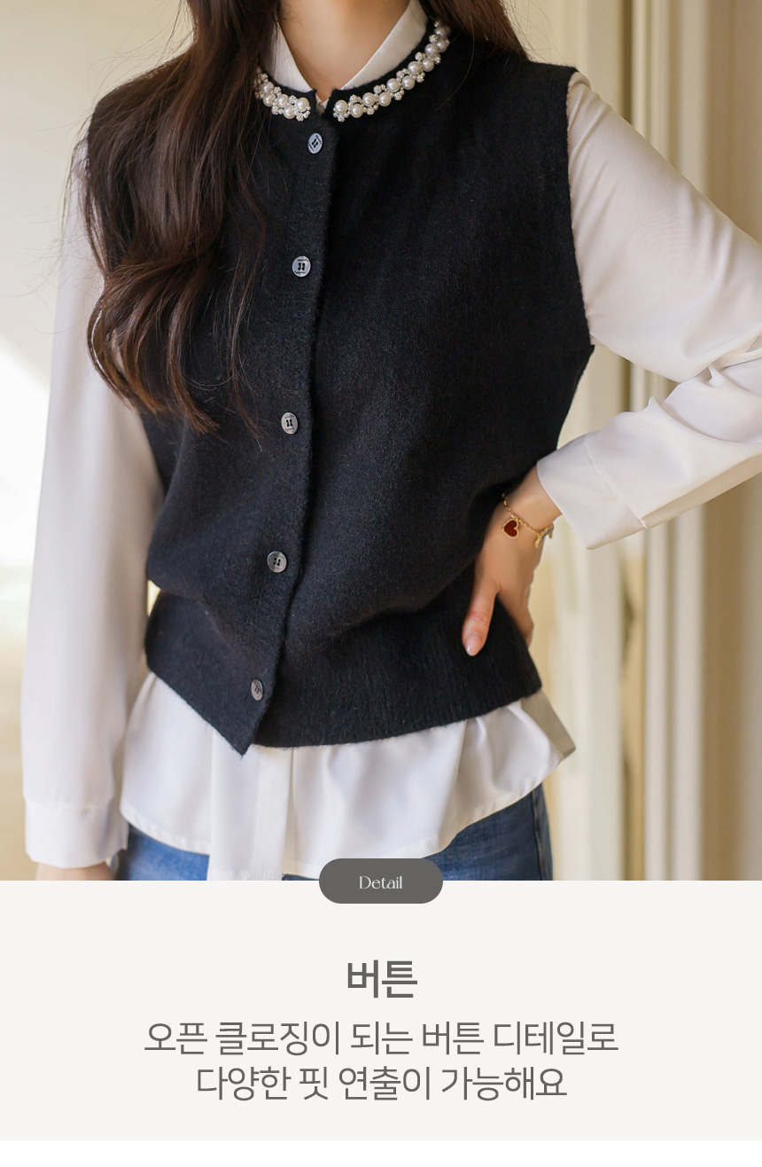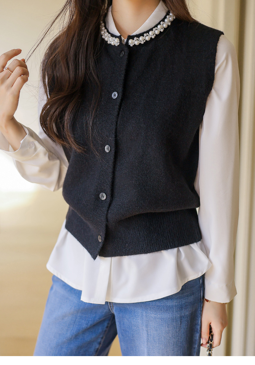 [A refined knit vest with pearl and crystal trim along the neckline, softly brightening the face while offering a clean silhouette perfect for layered office and seasonal looks.]