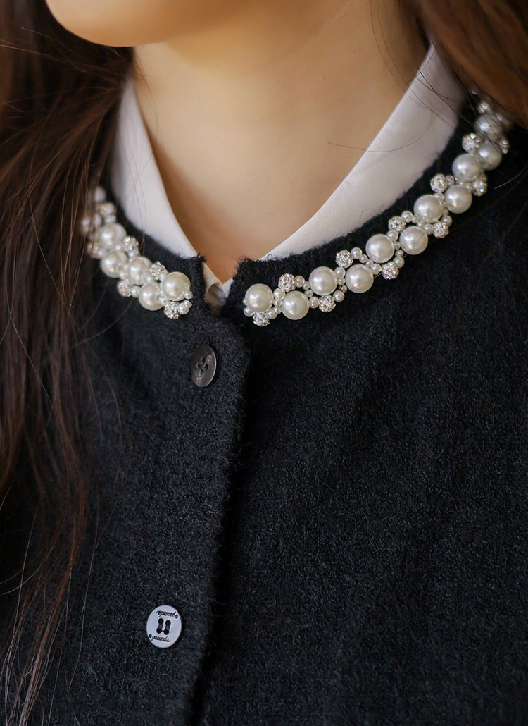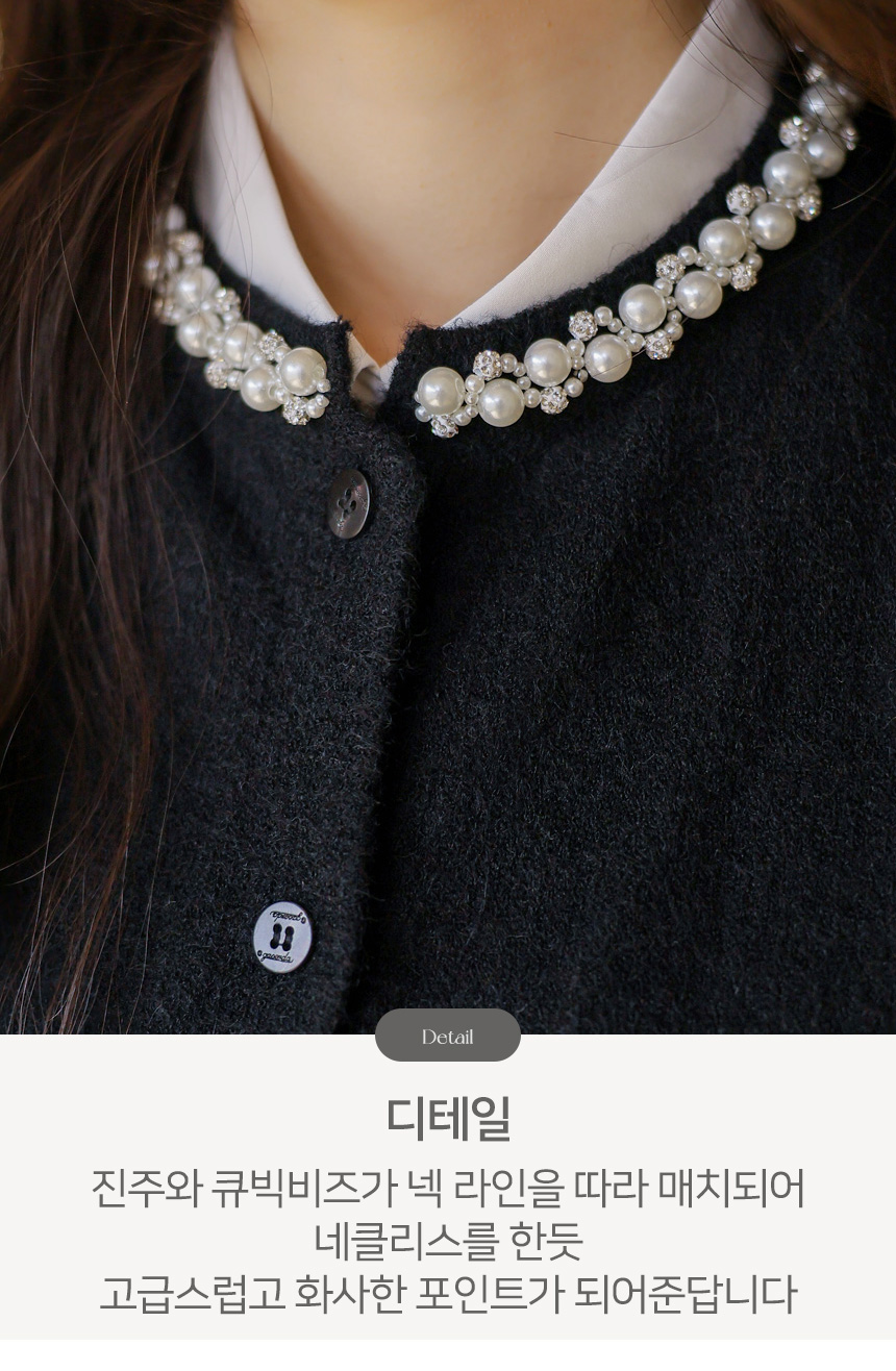 넥 라인을 따라 섬세하게 더해진 진주와 큐빅 장식이