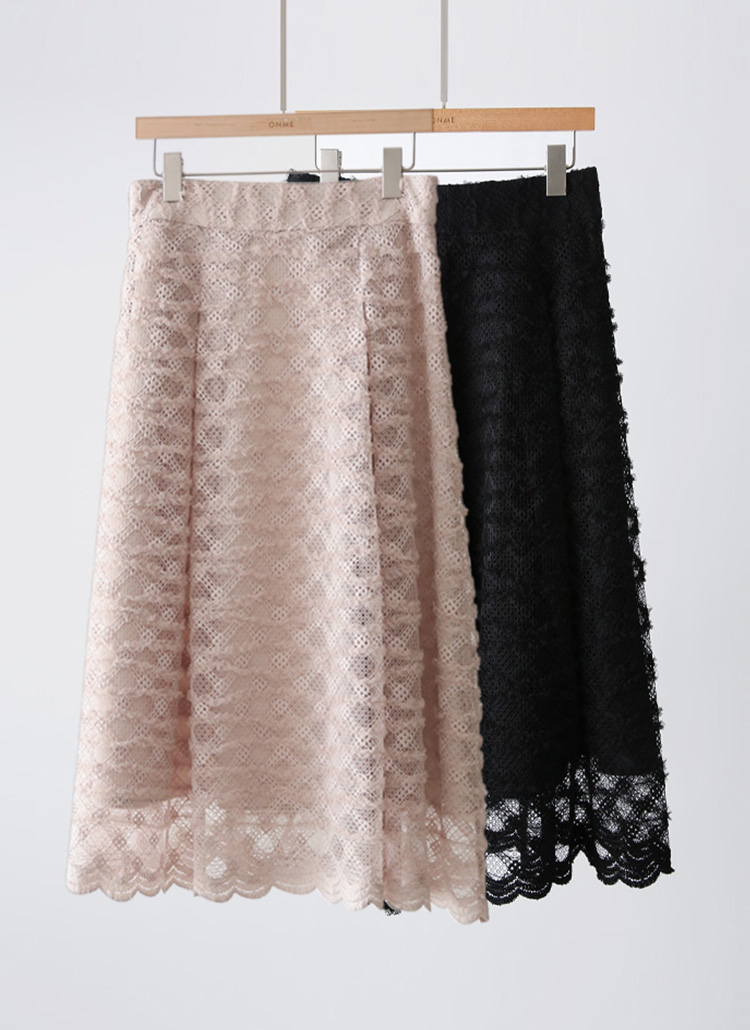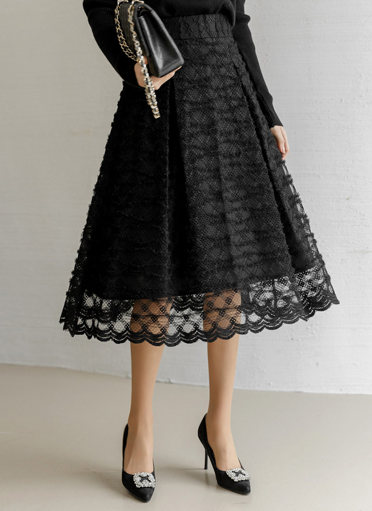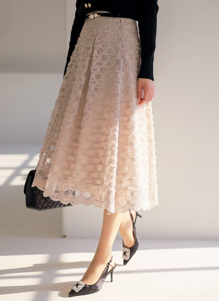 [Intricate diamond eyelet lace with subtle mini frill texture creates a refined A-line midi skirt, offering sheer hem detail and elegant feminine style for chic office and occasion looks.]