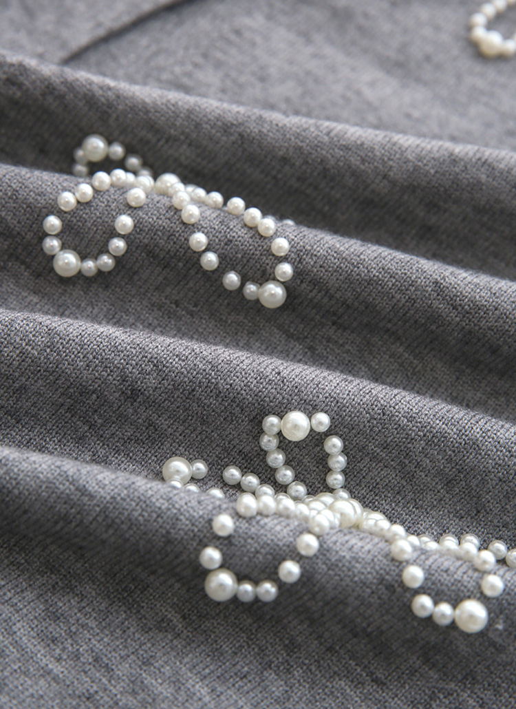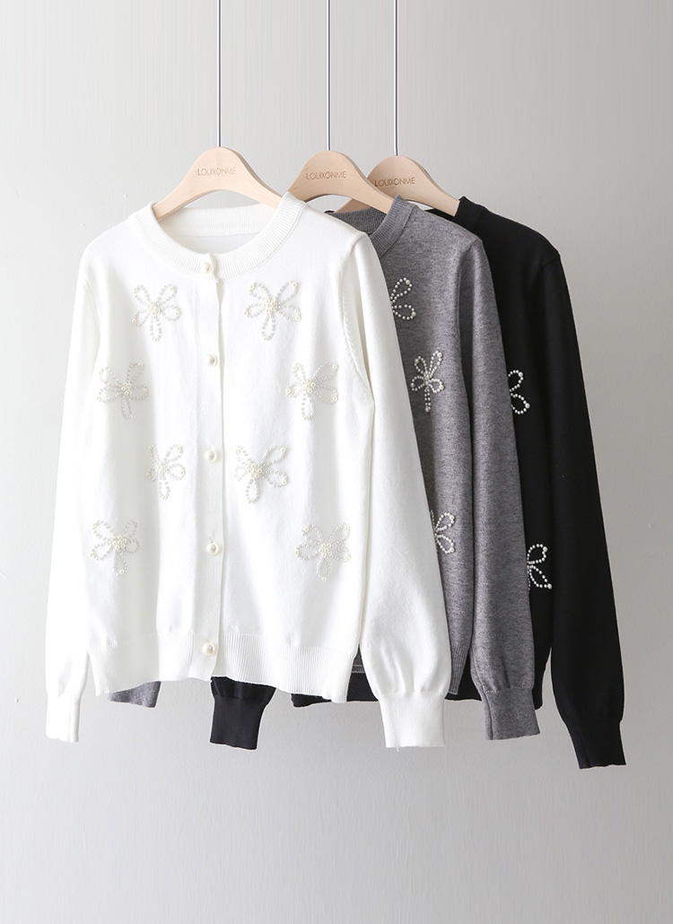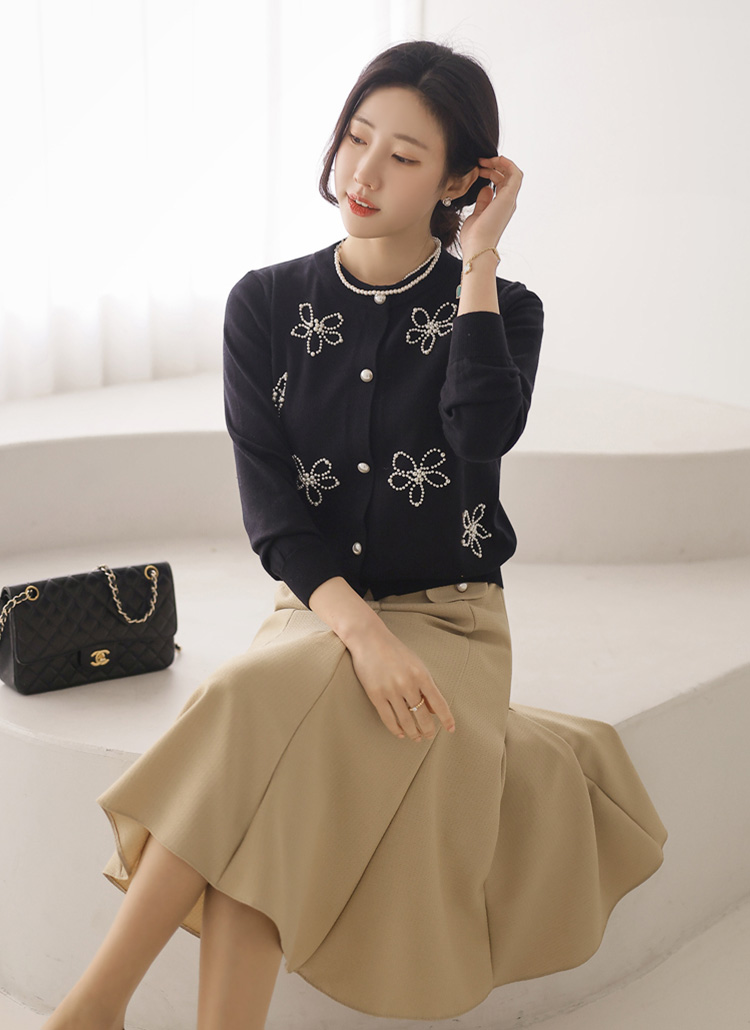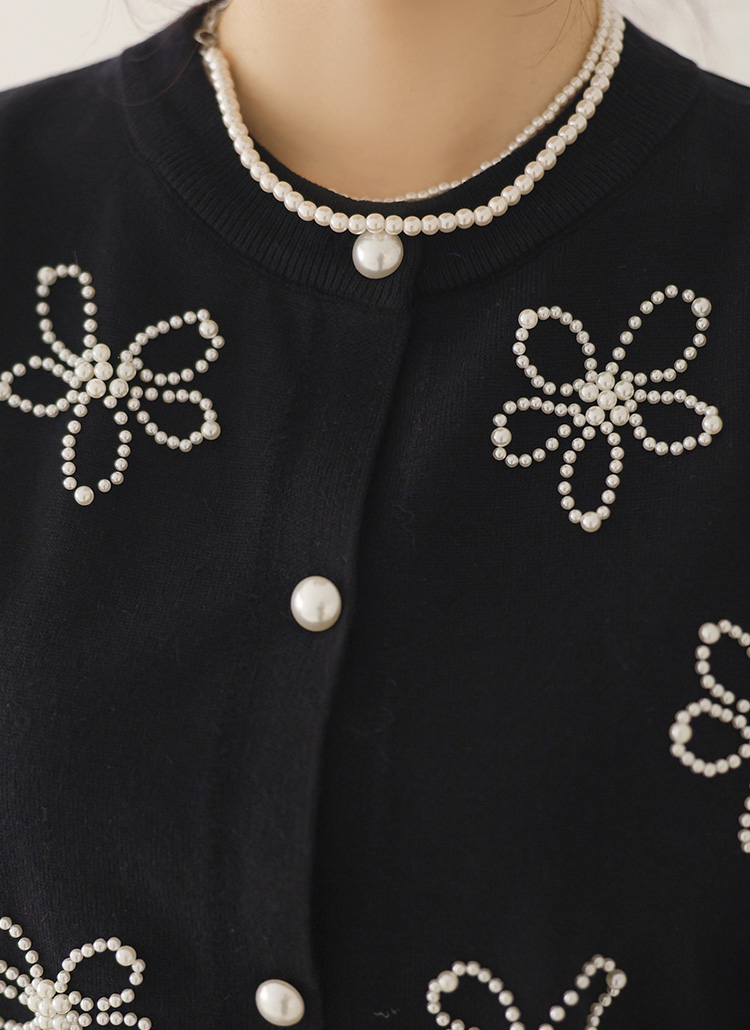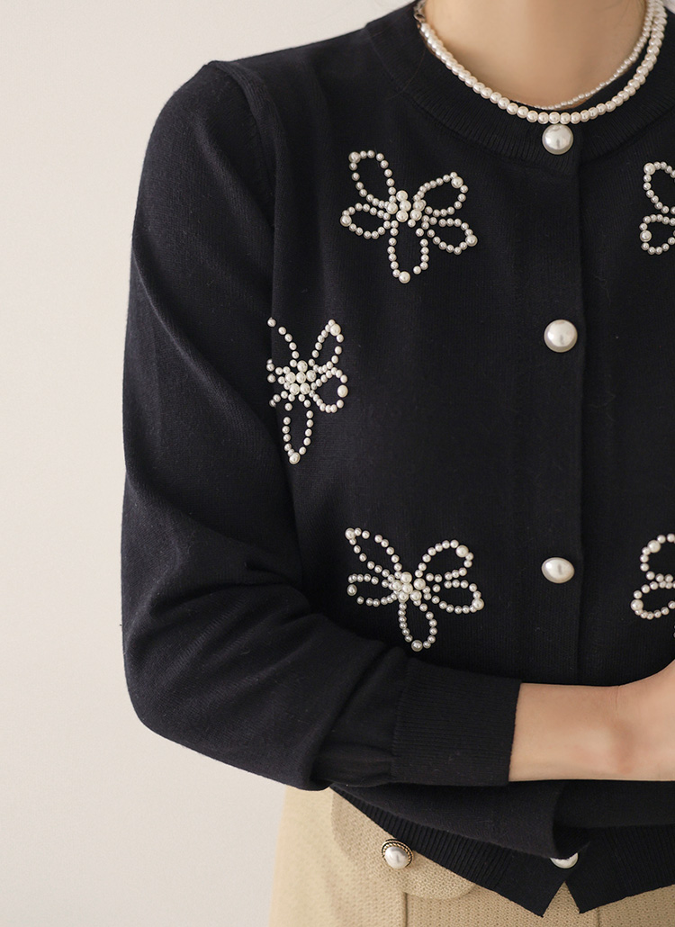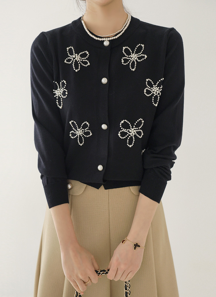 [Soft rayon blend cardigan adorned with delicate pearl flower motifs. Polished round neckline and ribbed hem create elegant spring office style.]