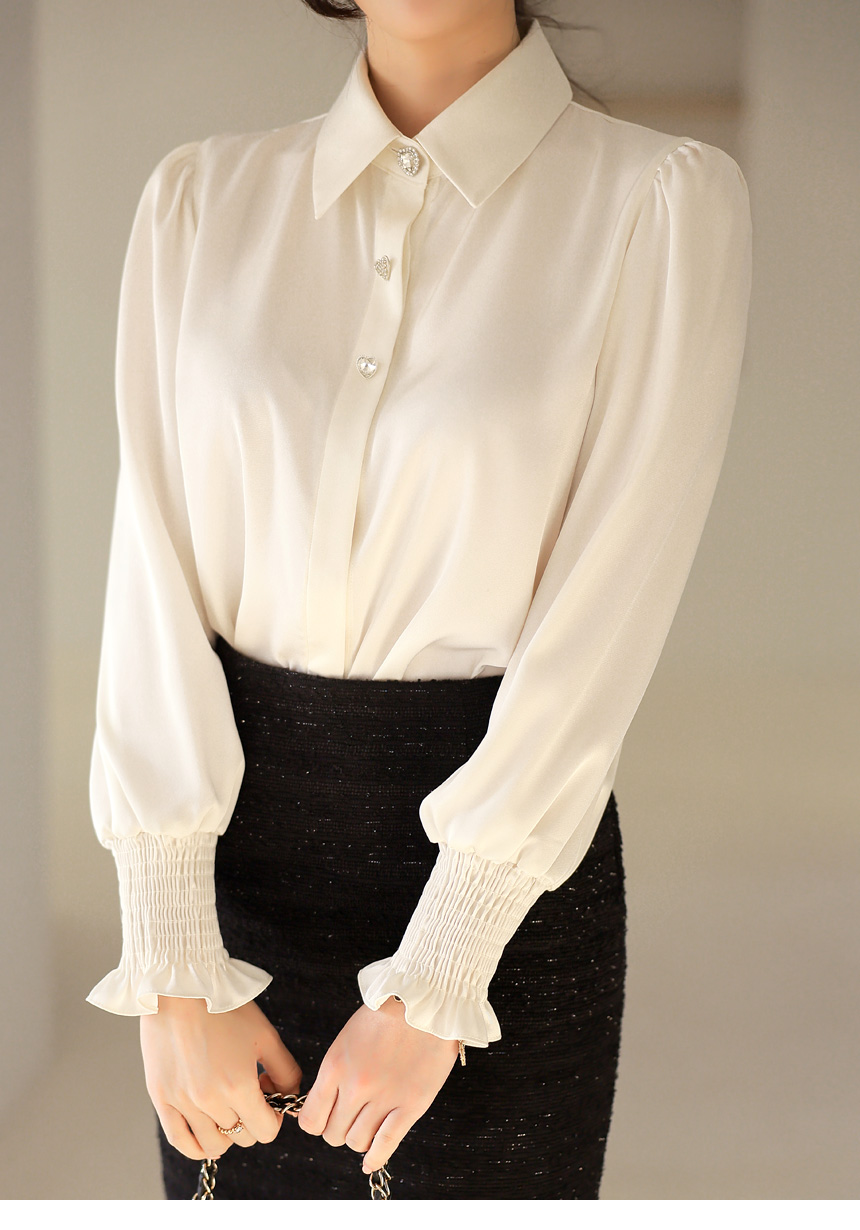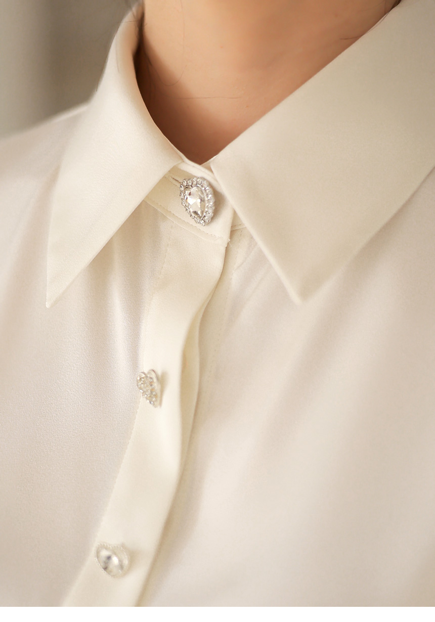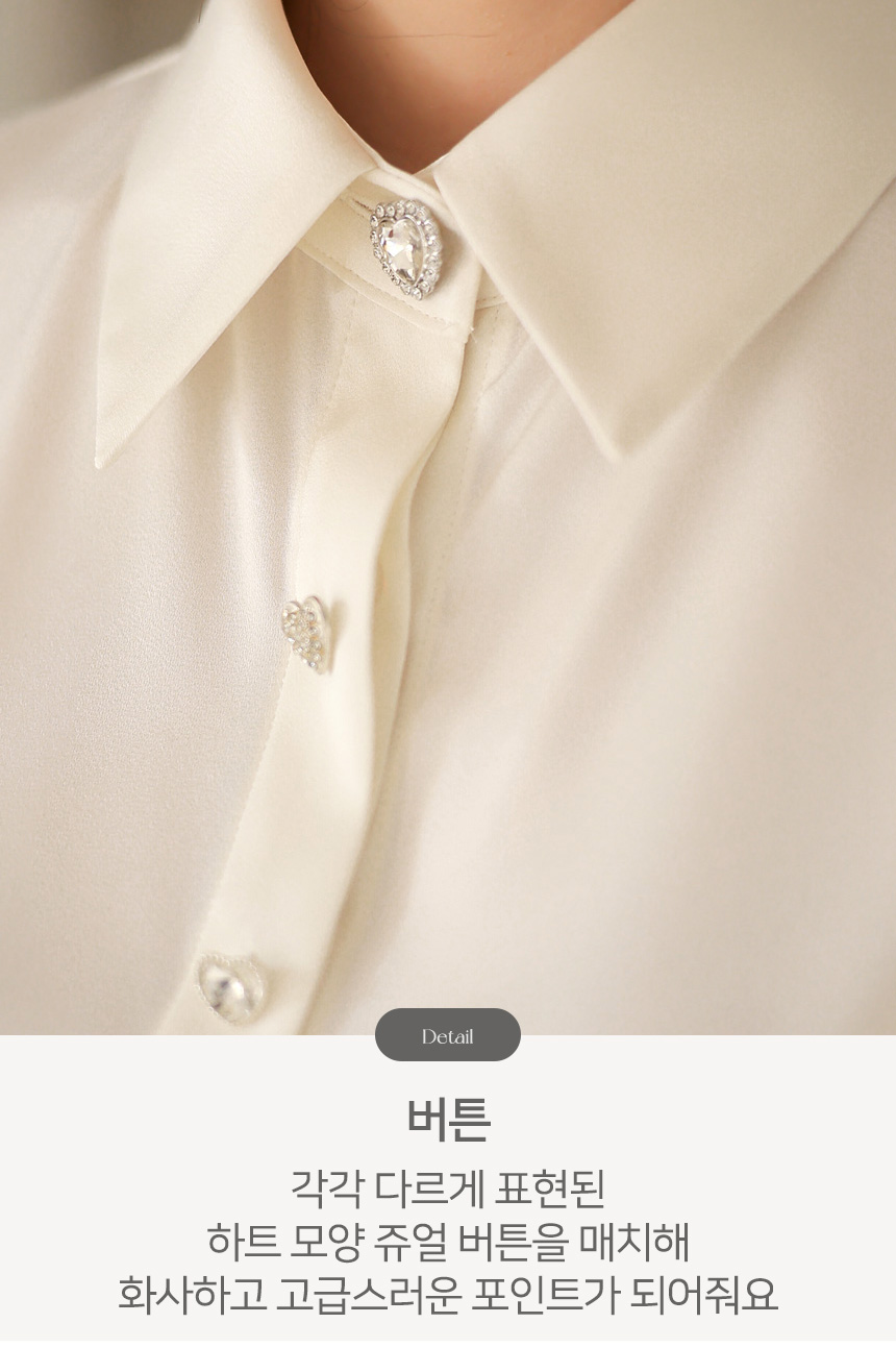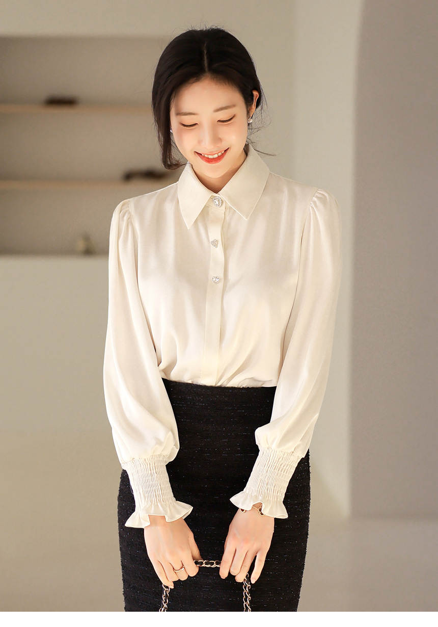 [Elegant satin blouse with soft sheen and smocked cuffs, finished with delicate heart jewel buttons for refined office wear and feminine work styling.]