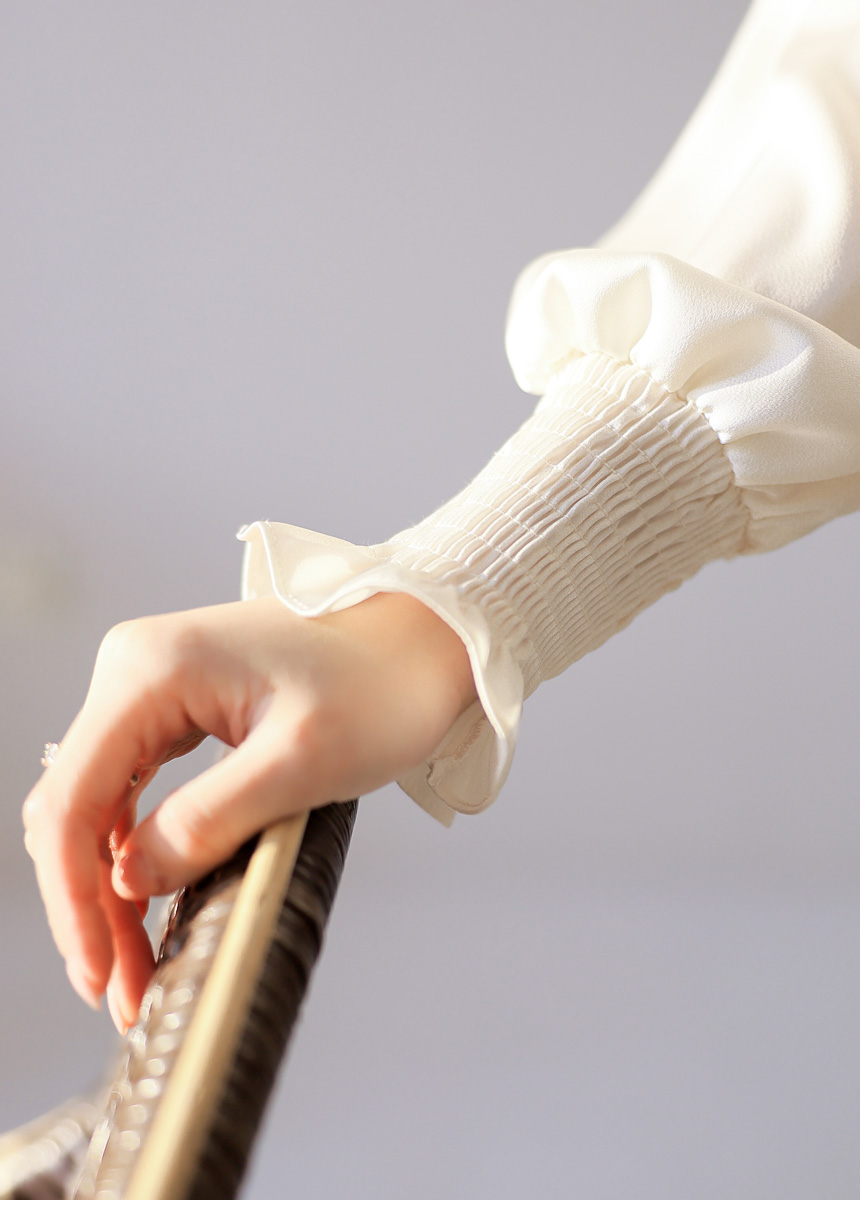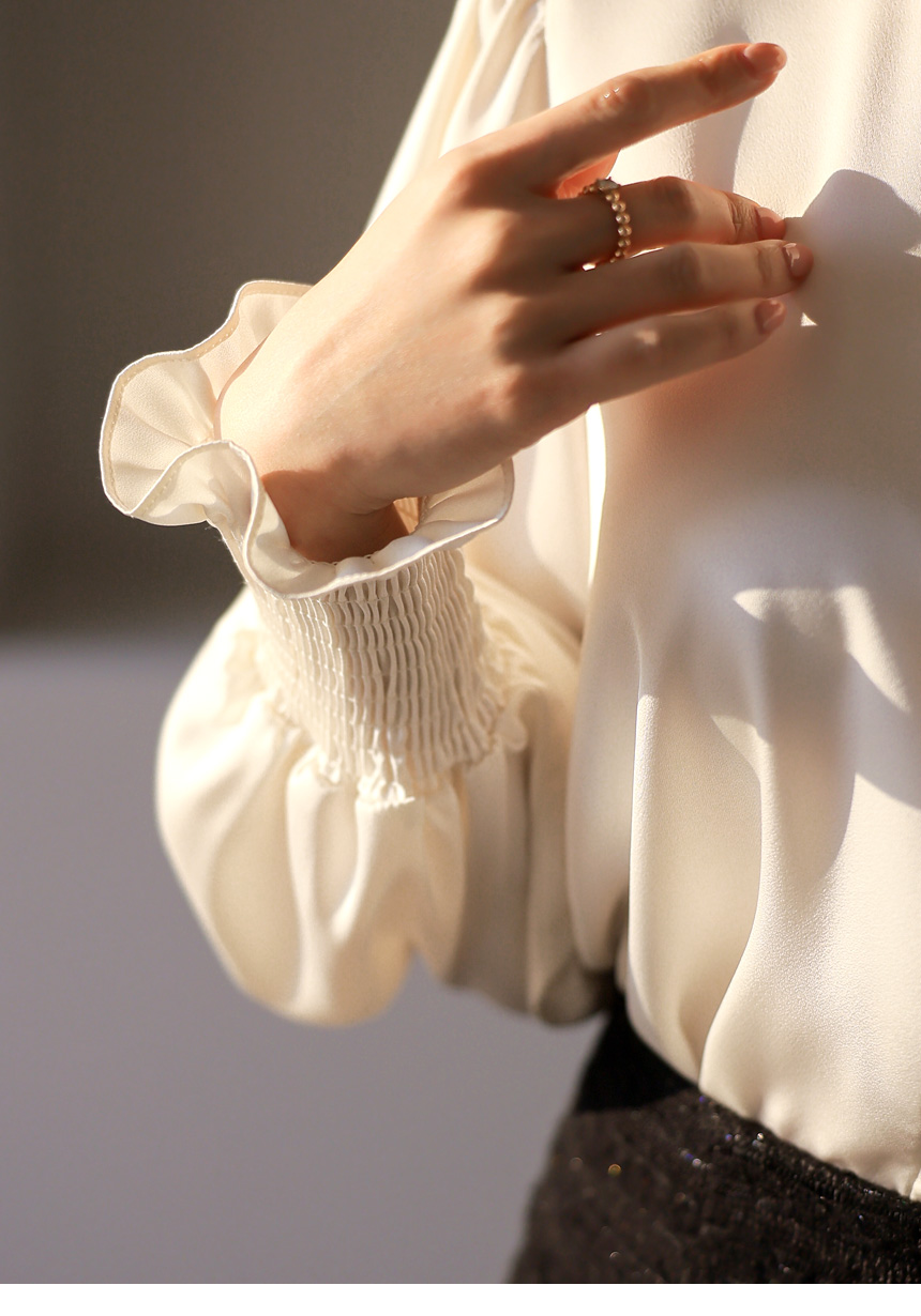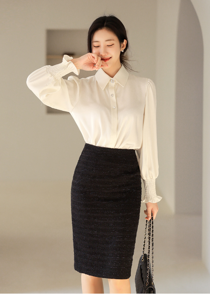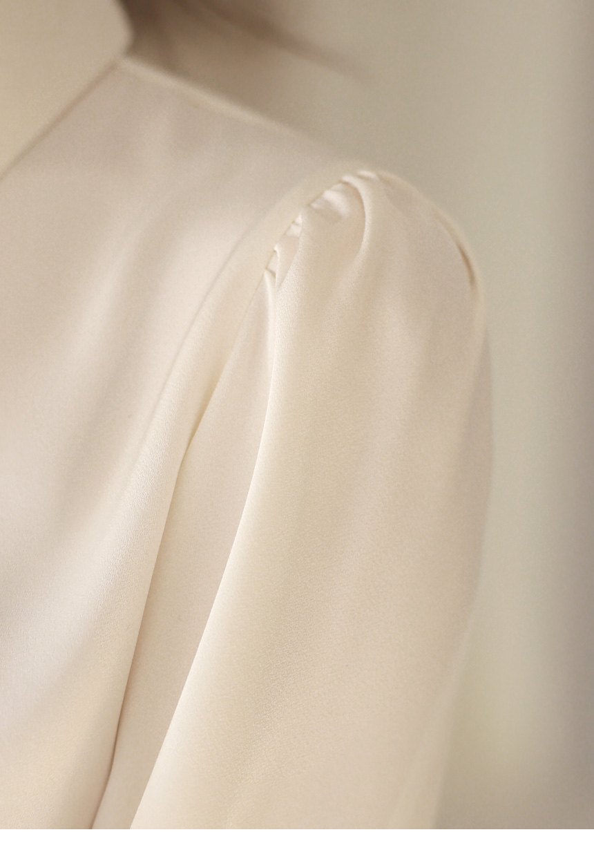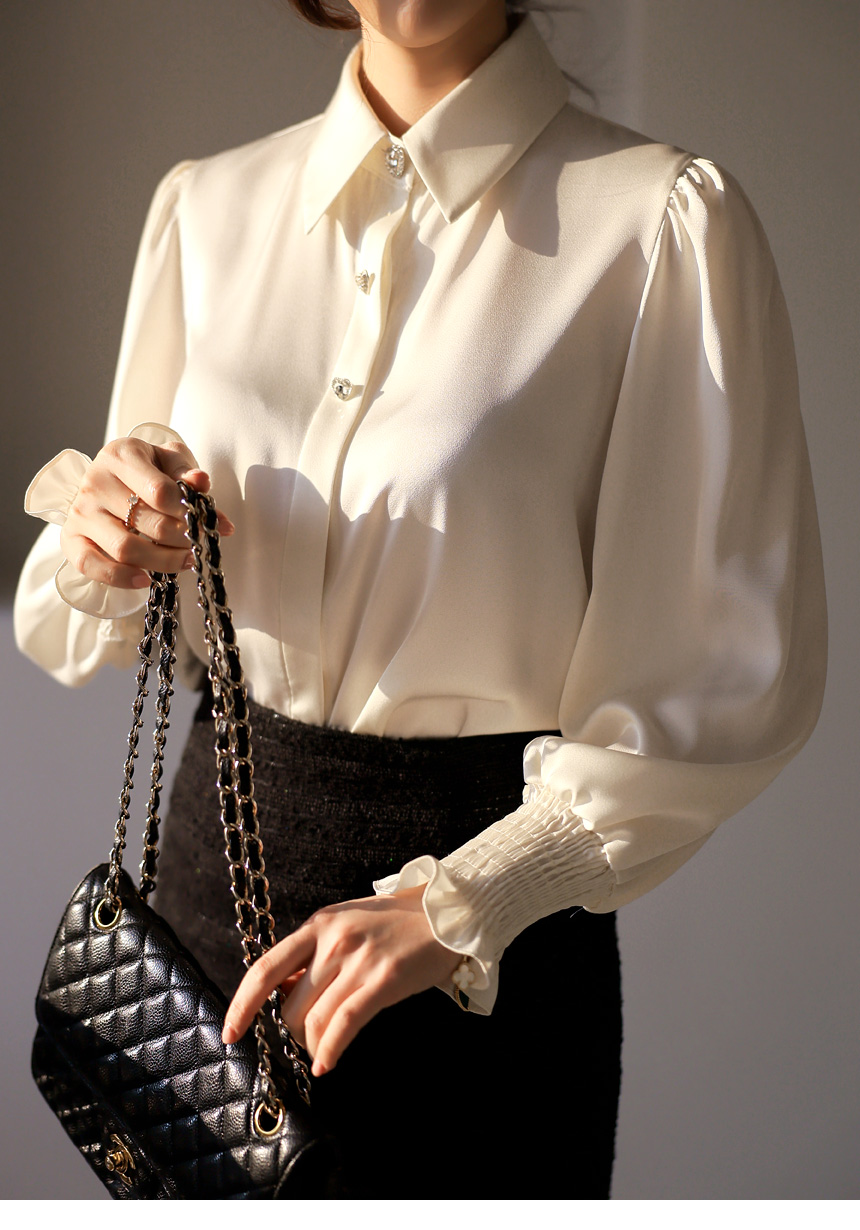 [Elegant satin blouse with soft sheen and smocked cuffs, finished with delicate heart jewel buttons for refined office wear and feminine work styling.]