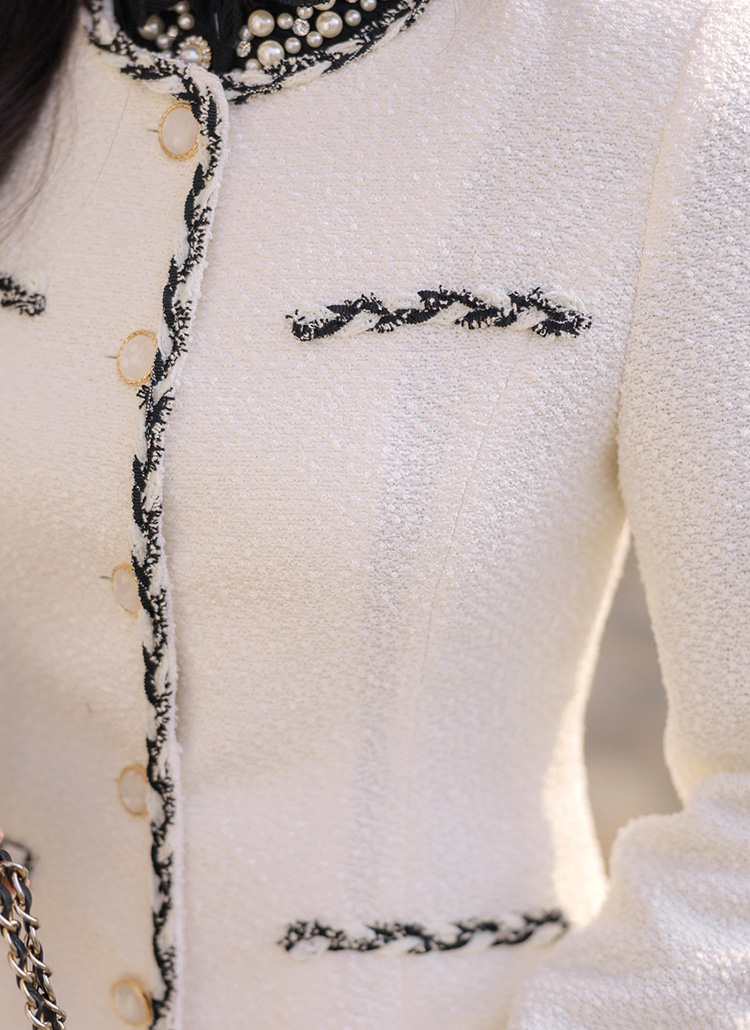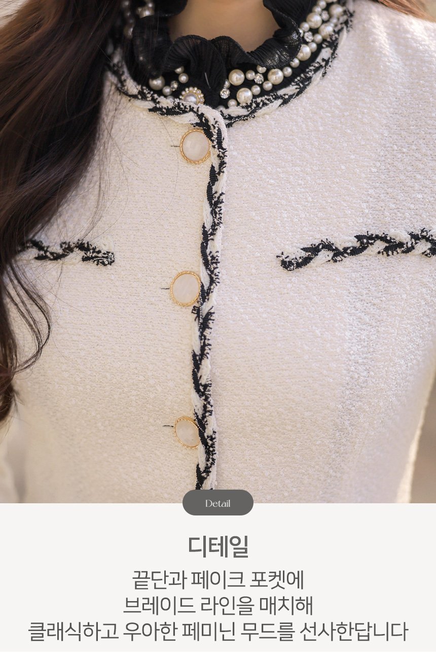 끝단을 따라 더해진 브레이드 배색 디테일이