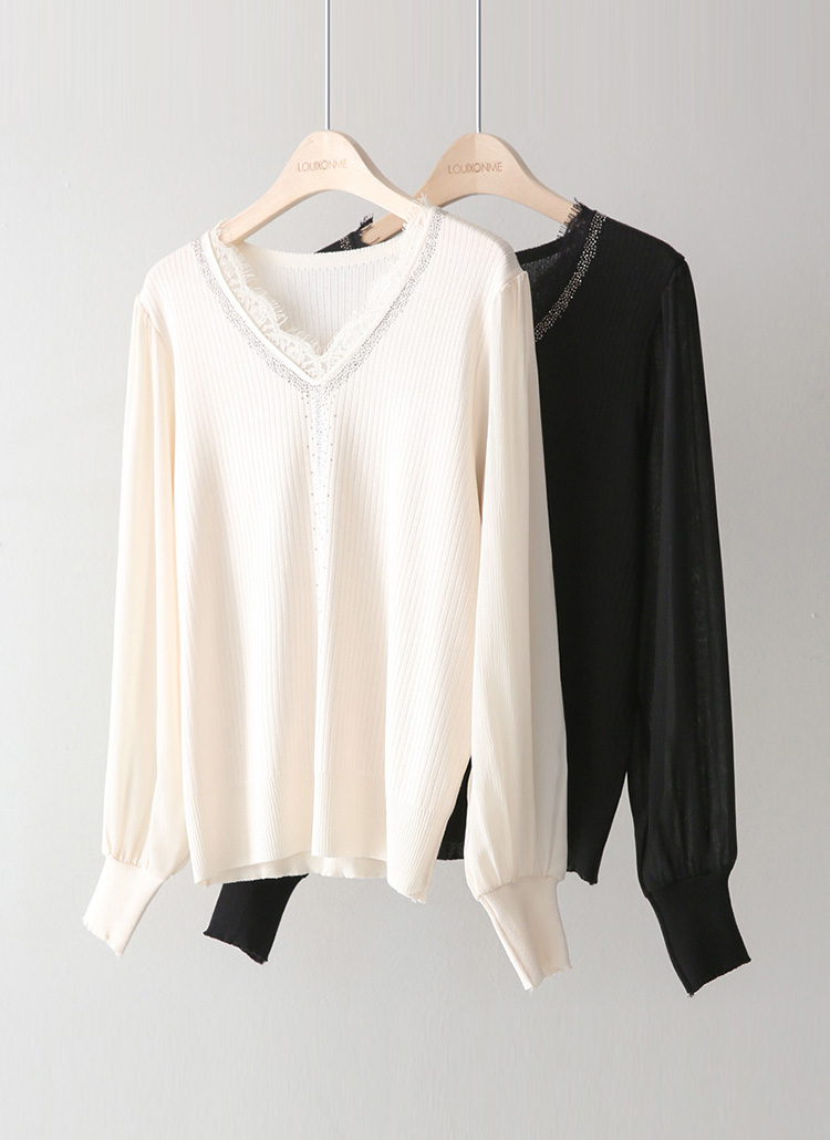 [Lightweight ribbed knit blouse with lace trimmed V-neck and subtle studded line detail, blending comfort and elegance for office wear and refined daily outfits.]