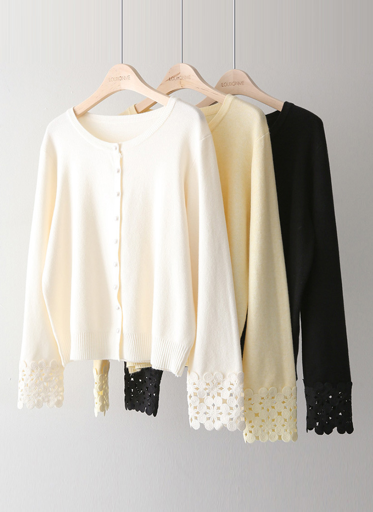 [Soft stretch knit cardigan with floral lace cuffs and delicate pearl buttons, perfect for feminine office wear, brunch outfits, and spring layering.]