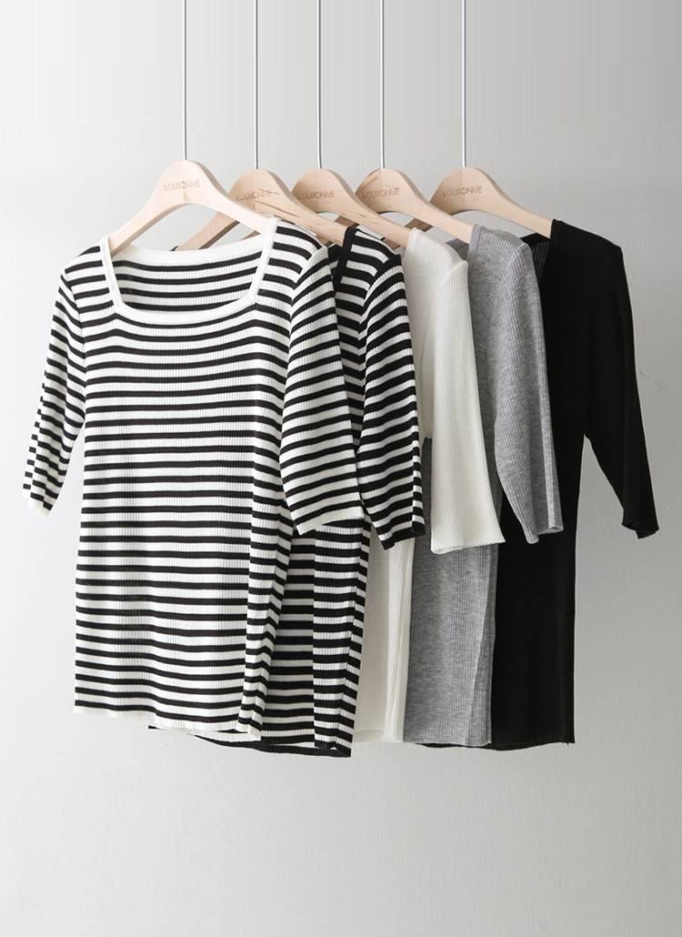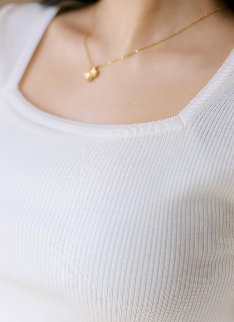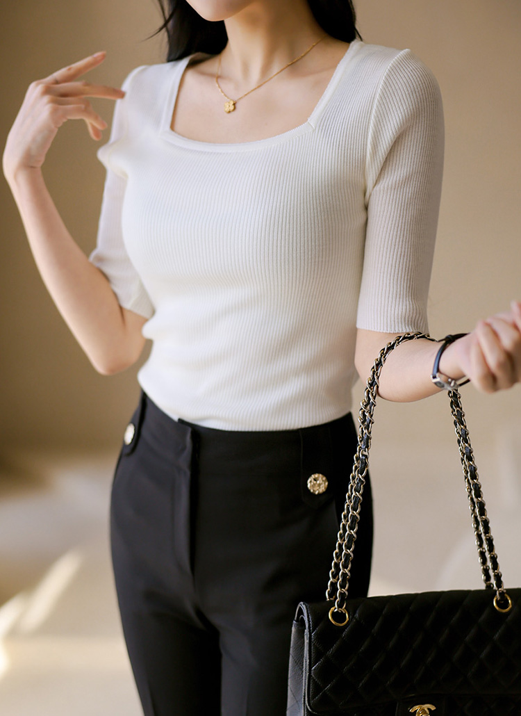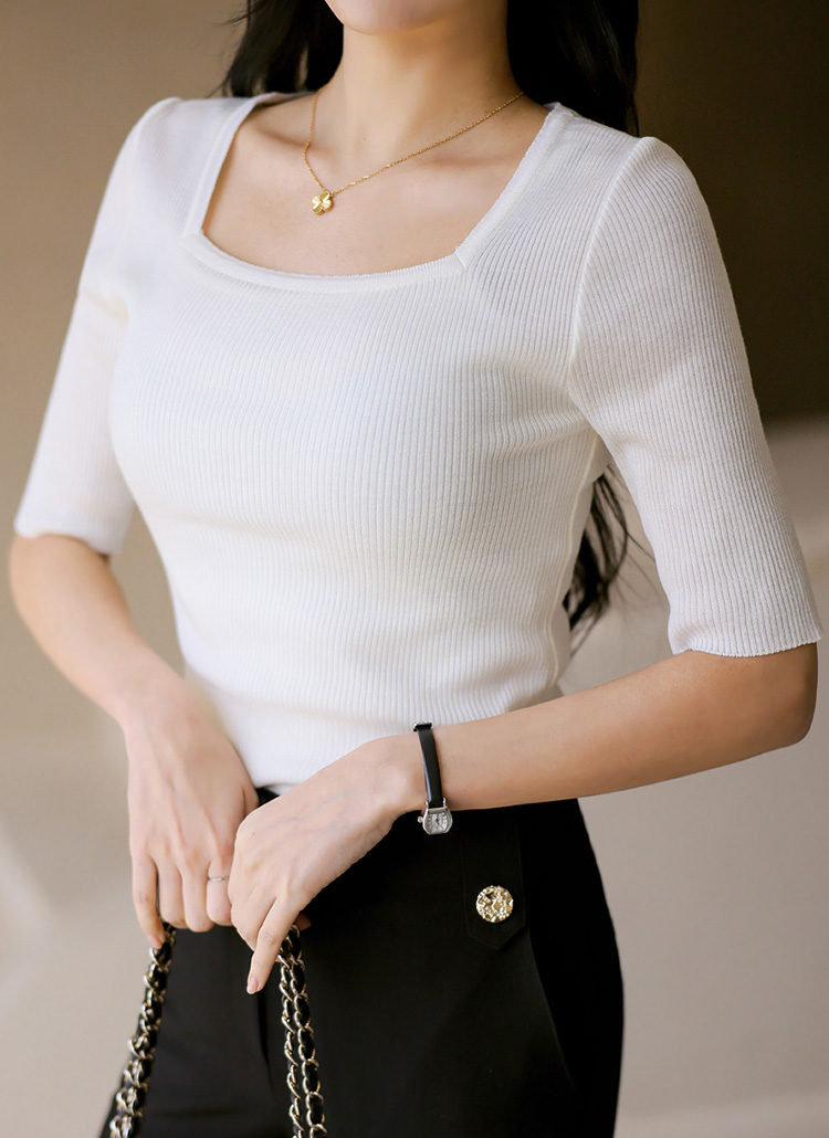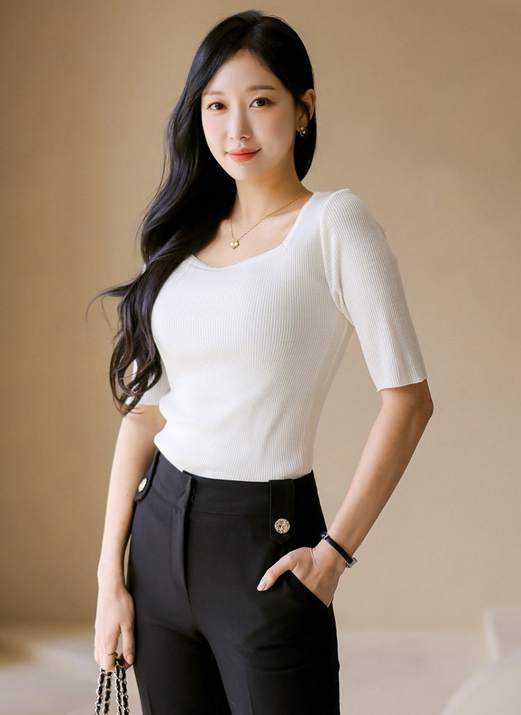 [Designed with a clean square neckline and refined ribbed texture, this slim fit knit tee enhances natural curves while offering flexible comfort. A versatile piece ideal for layering with blazers or wearing solo.]