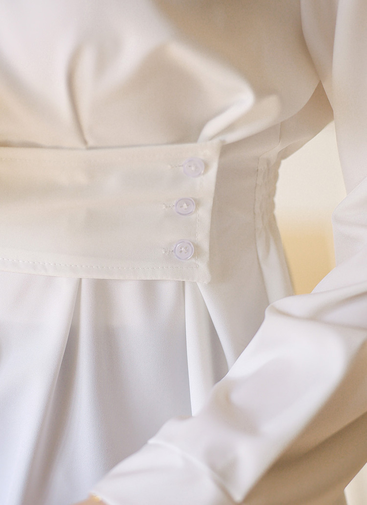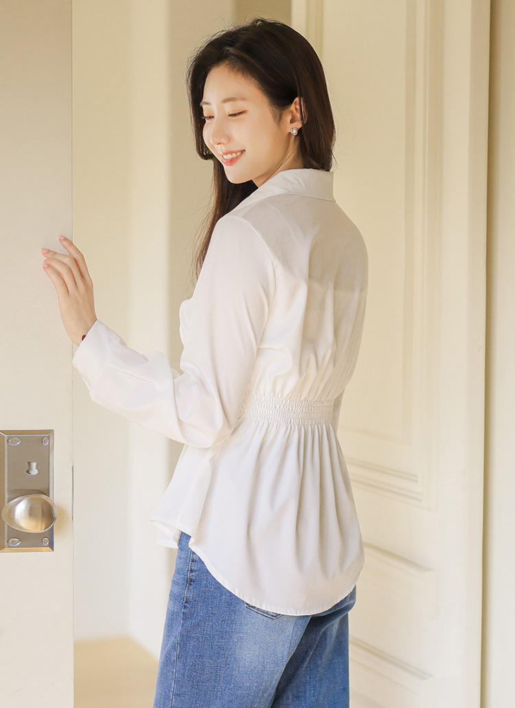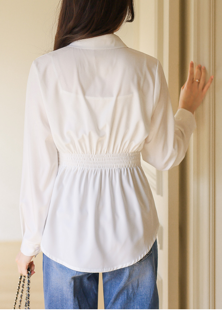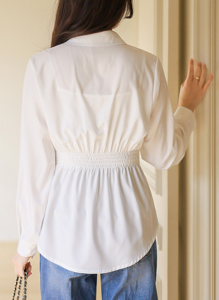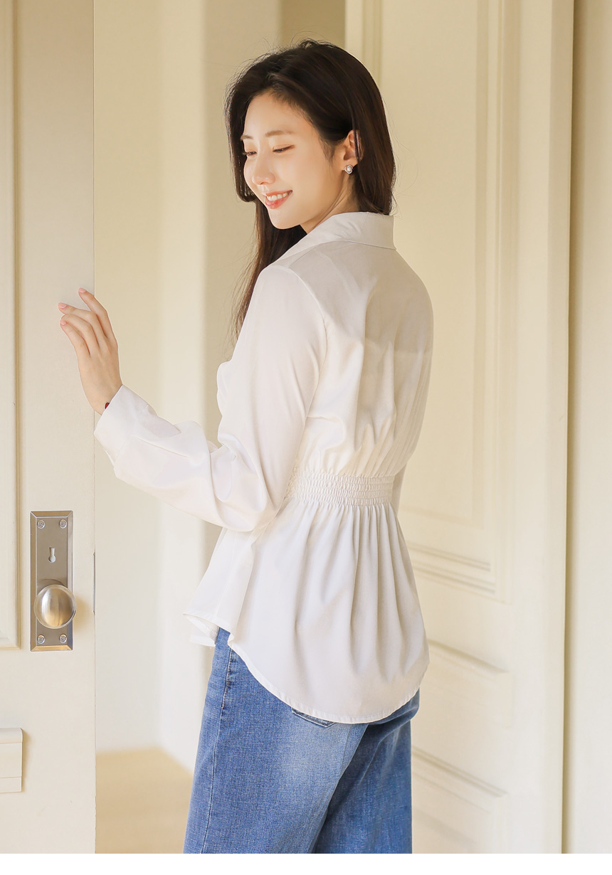 [Featuring a structured waist strap and smocked back panel, this tailored shirt enhances your silhouette with a feminine peplum flare. The smooth fabric drapes beautifully for elegant office and daily looks.]