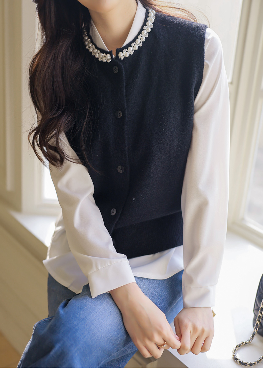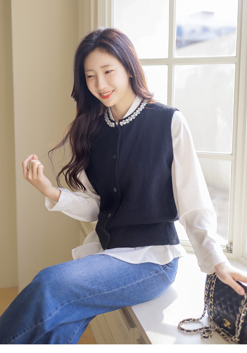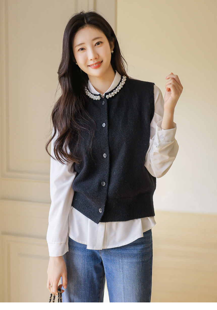 • A refined knit vest with pearl and crystal trim along the neckline, softly brightening the face while offering a clean silhouette perfect for layered office and seasonal looks.