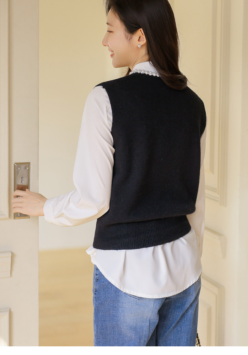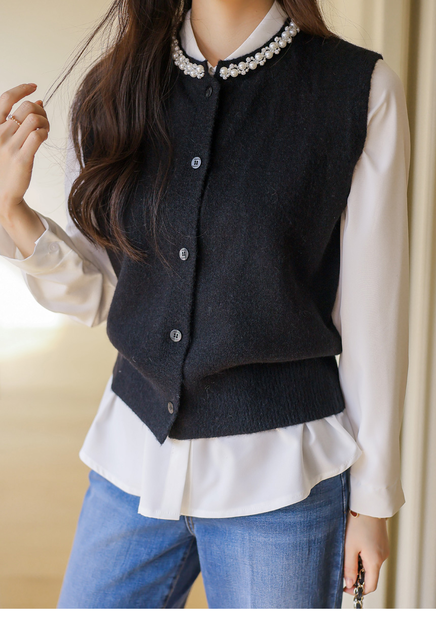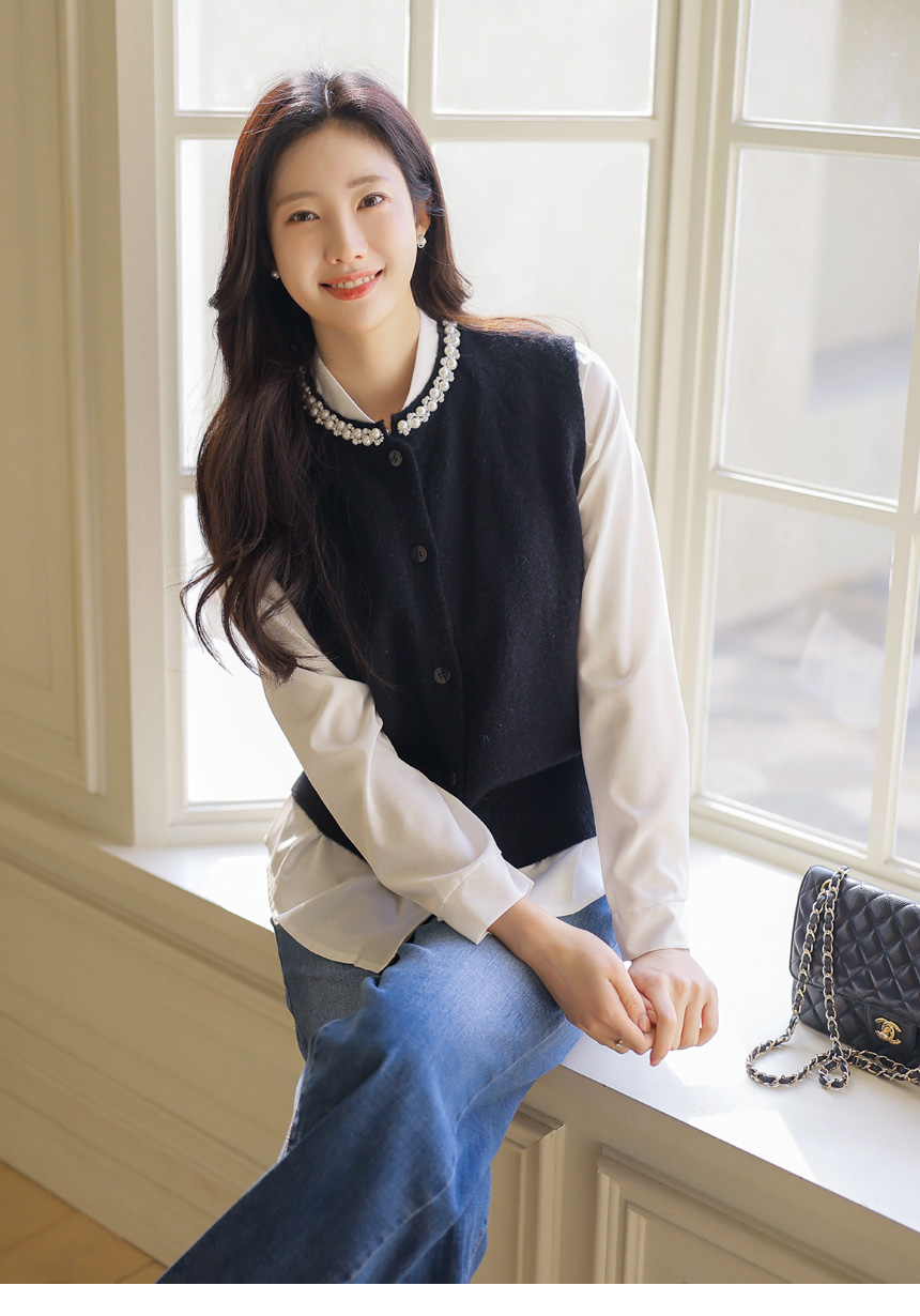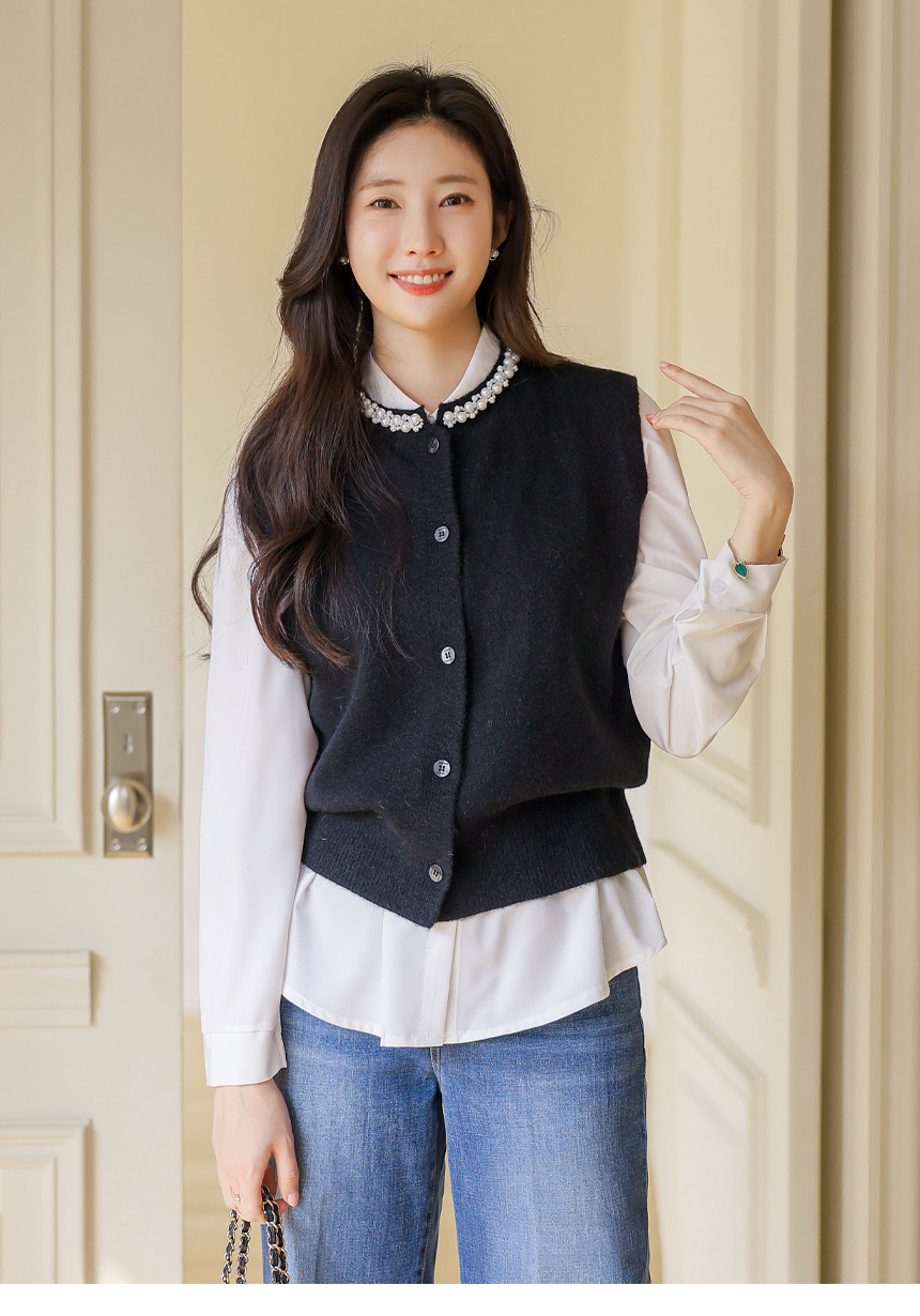 • A refined knit vest with pearl and crystal trim along the neckline, softly brightening the face while offering a clean silhouette perfect for layered office and seasonal looks.