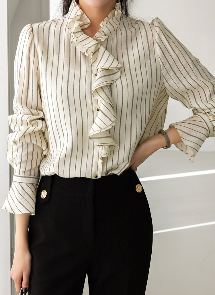 [Featuring refined stripe lines and a petal-like ruffle neckline that frames the face beautifully. The soft drape and flared cuffs create a graceful silhouette, offering effortless elegance for everyday outfits or elevated workwear looks.]