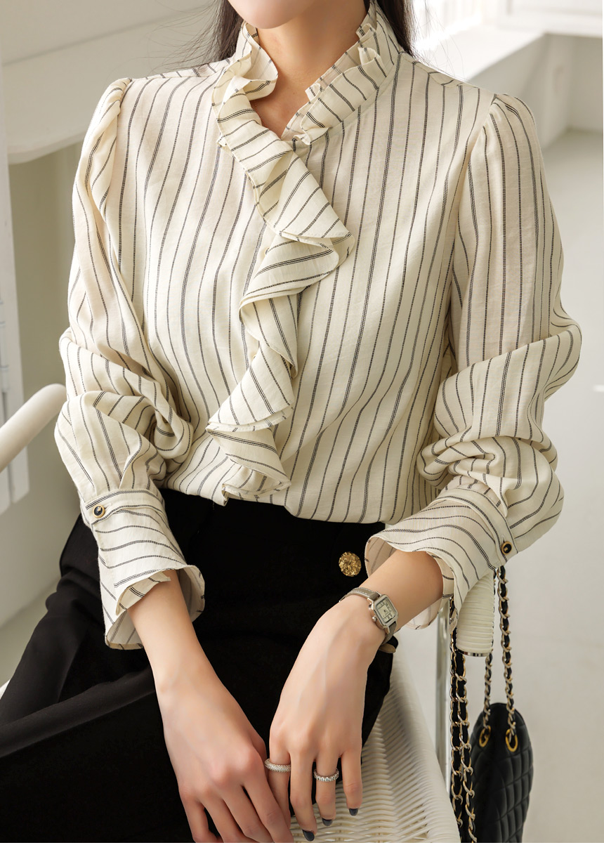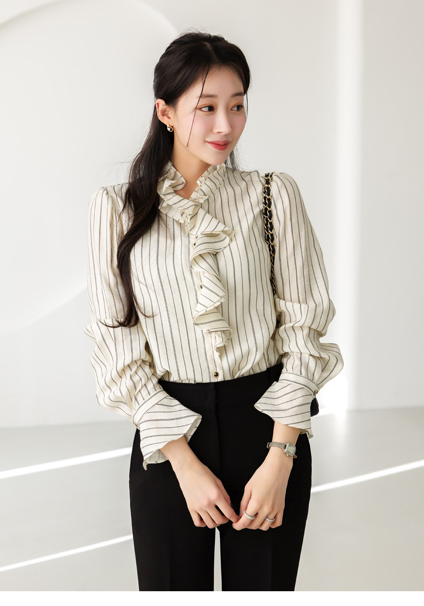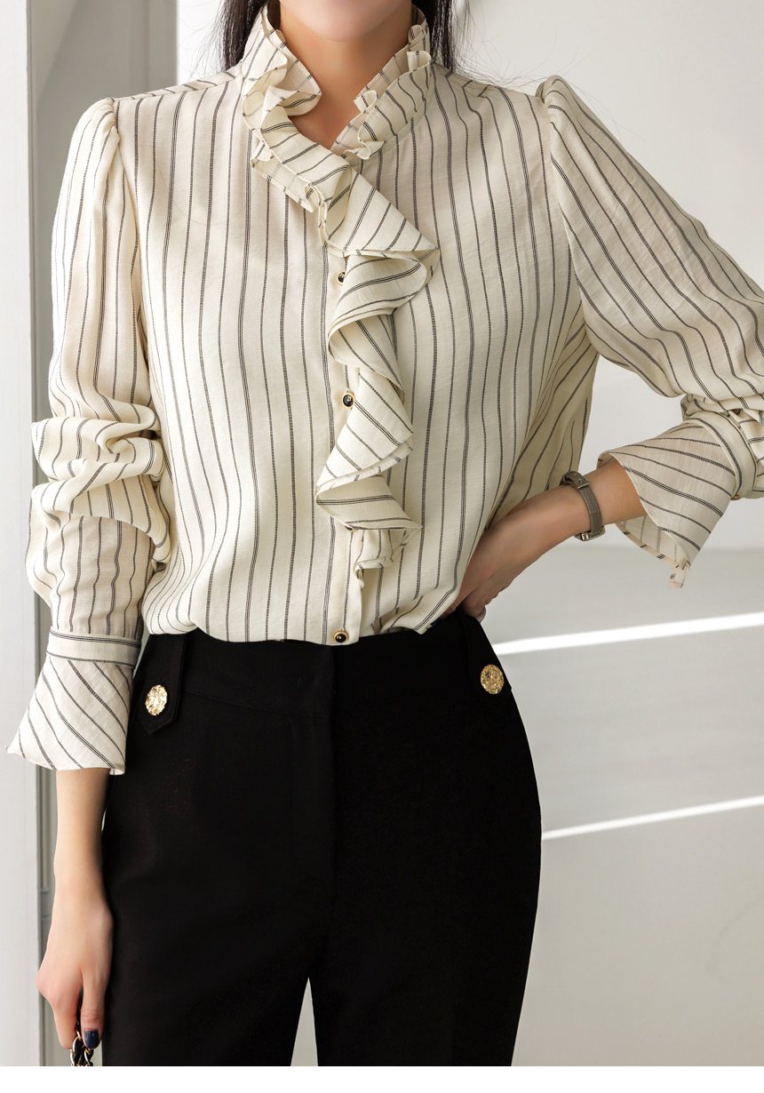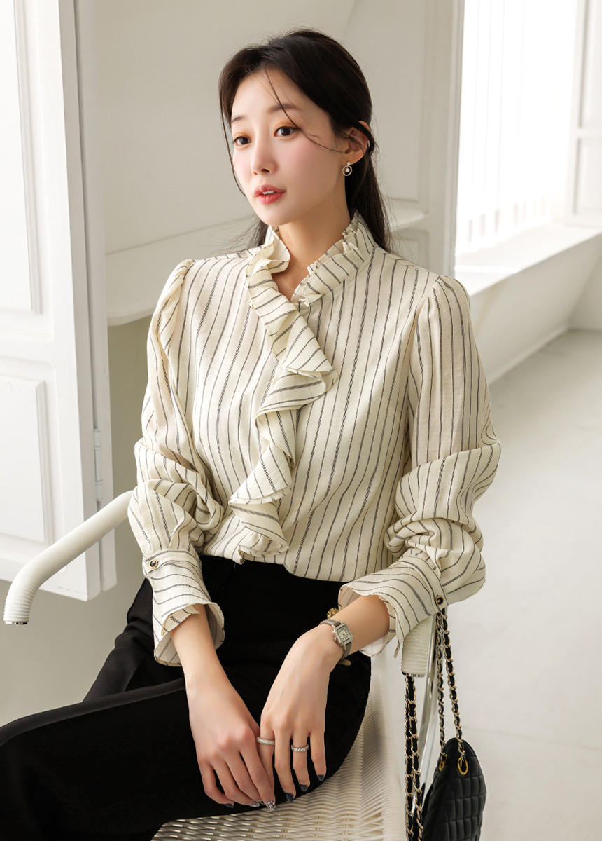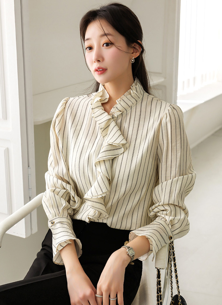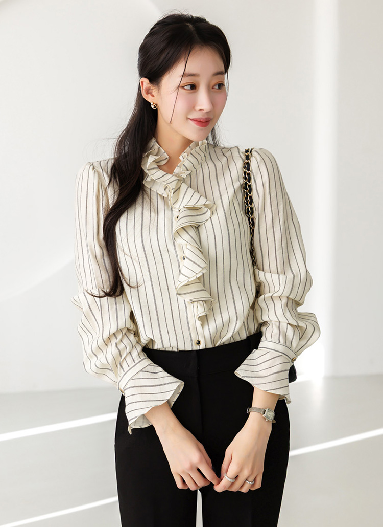 [Featuring refined stripe lines and a petal-like ruffle neckline that frames the face beautifully. The soft drape and flared cuffs create a graceful silhouette, offering effortless elegance for everyday outfits or elevated workwear looks.]
