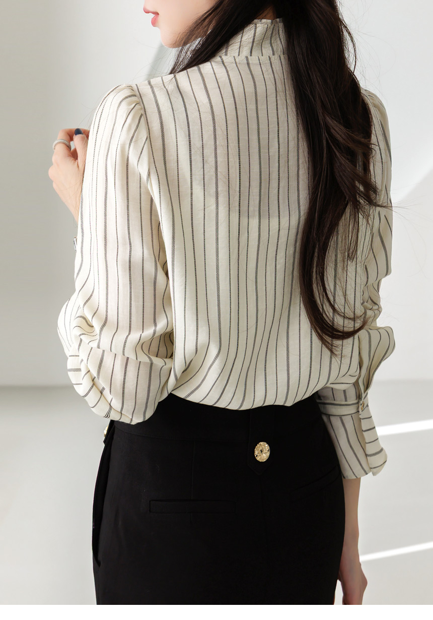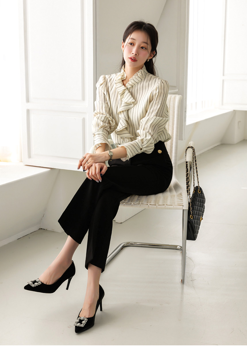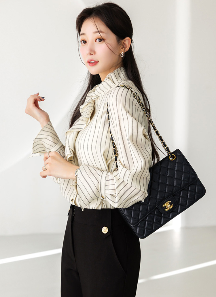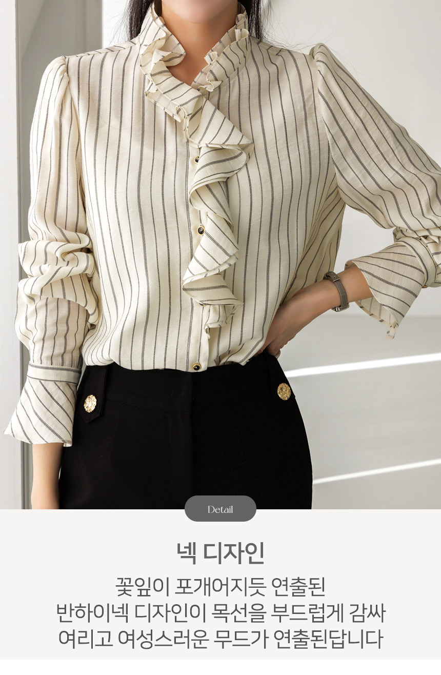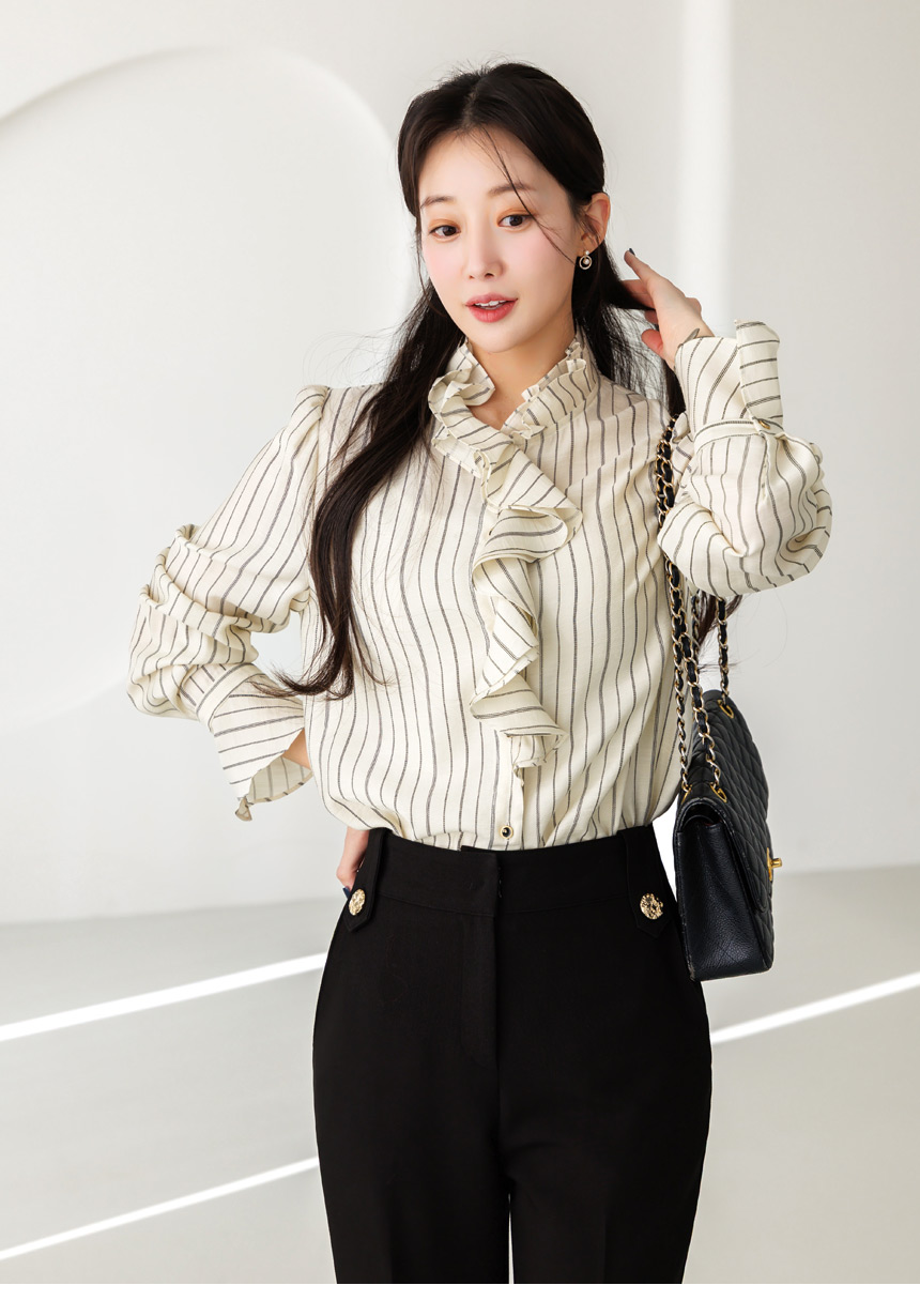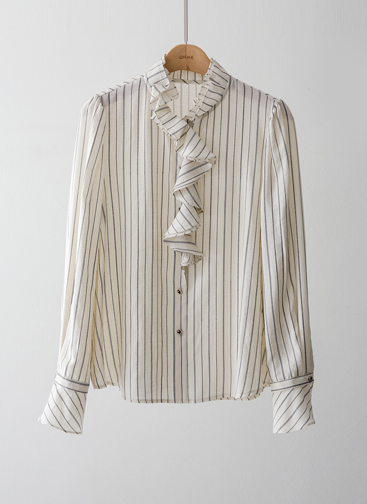 [Featuring refined stripe lines and a petal-like ruffle neckline that frames the face beautifully. The soft drape and flared cuffs create a graceful silhouette, offering effortless elegance for everyday outfits or elevated workwear looks.]