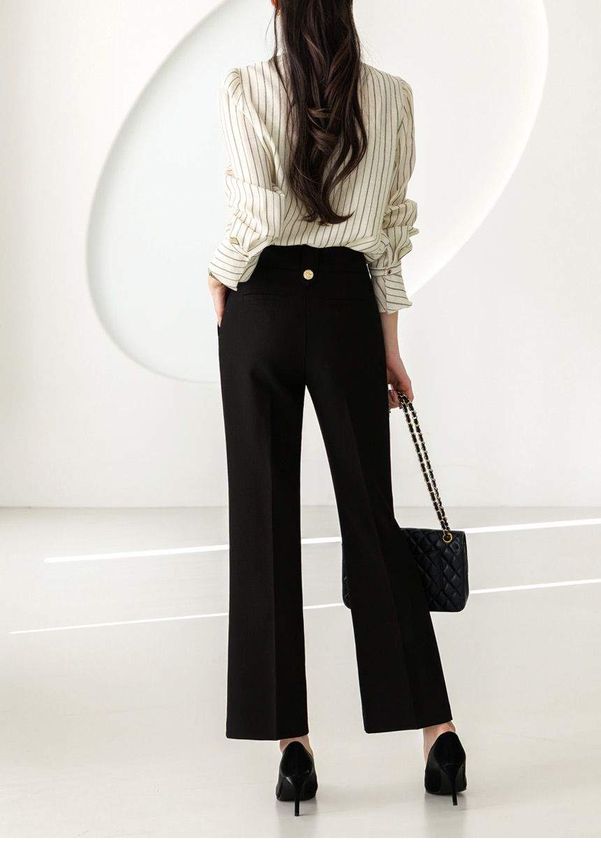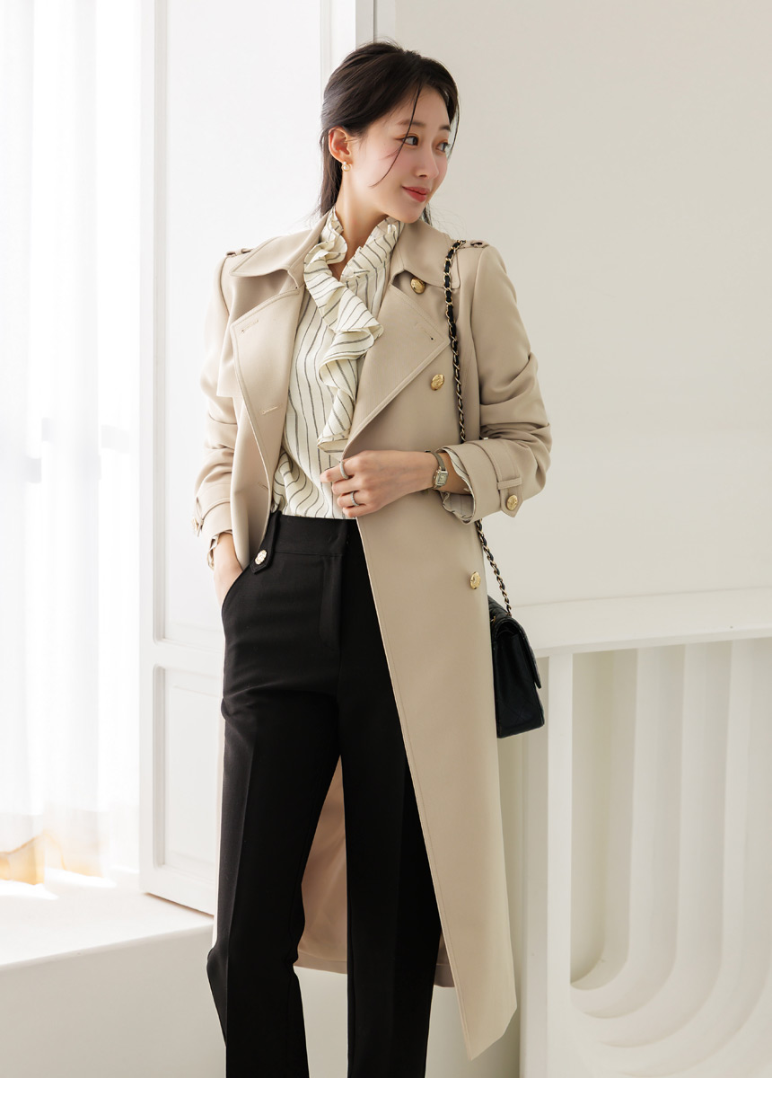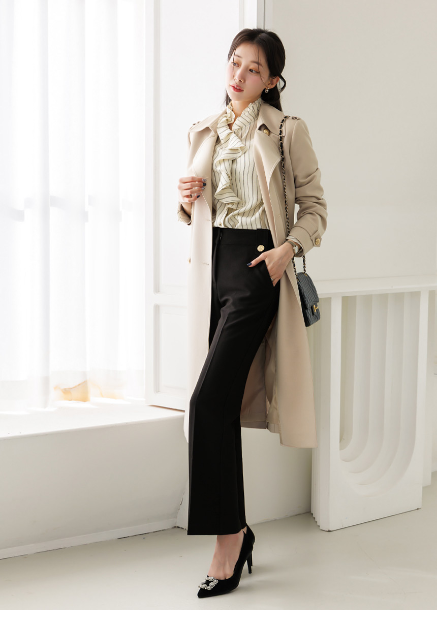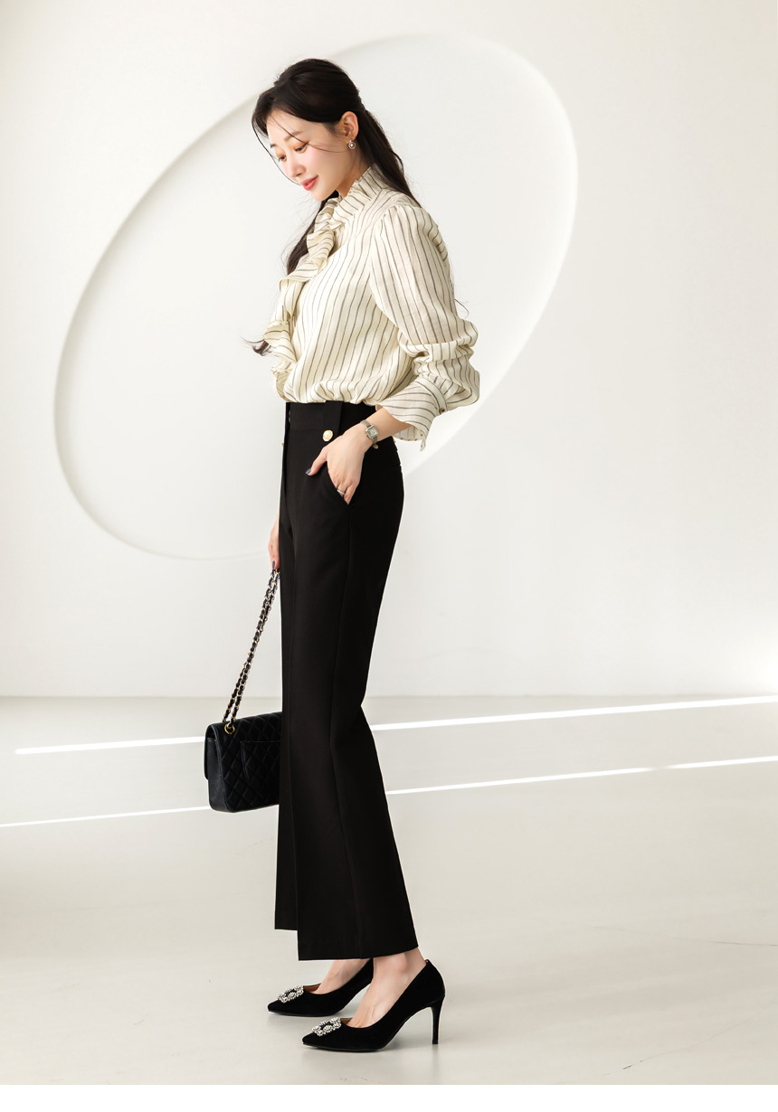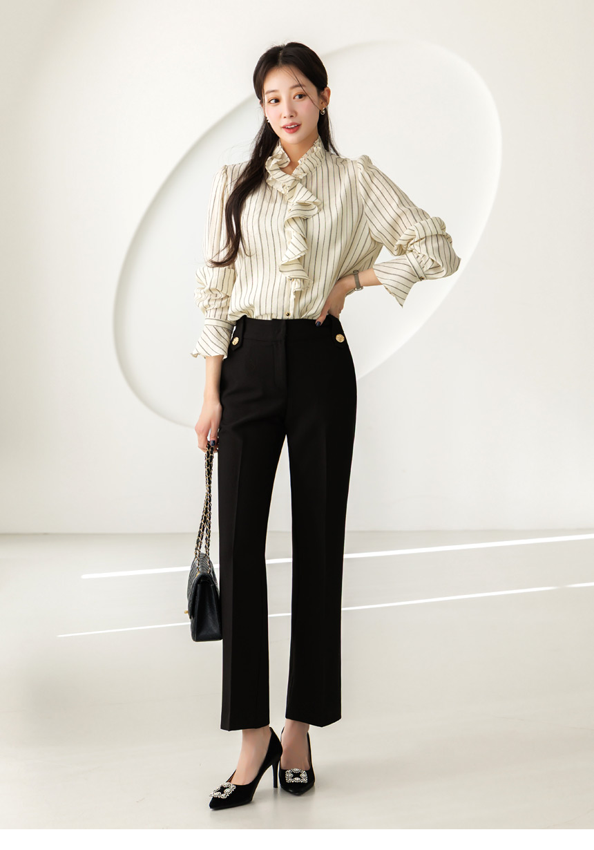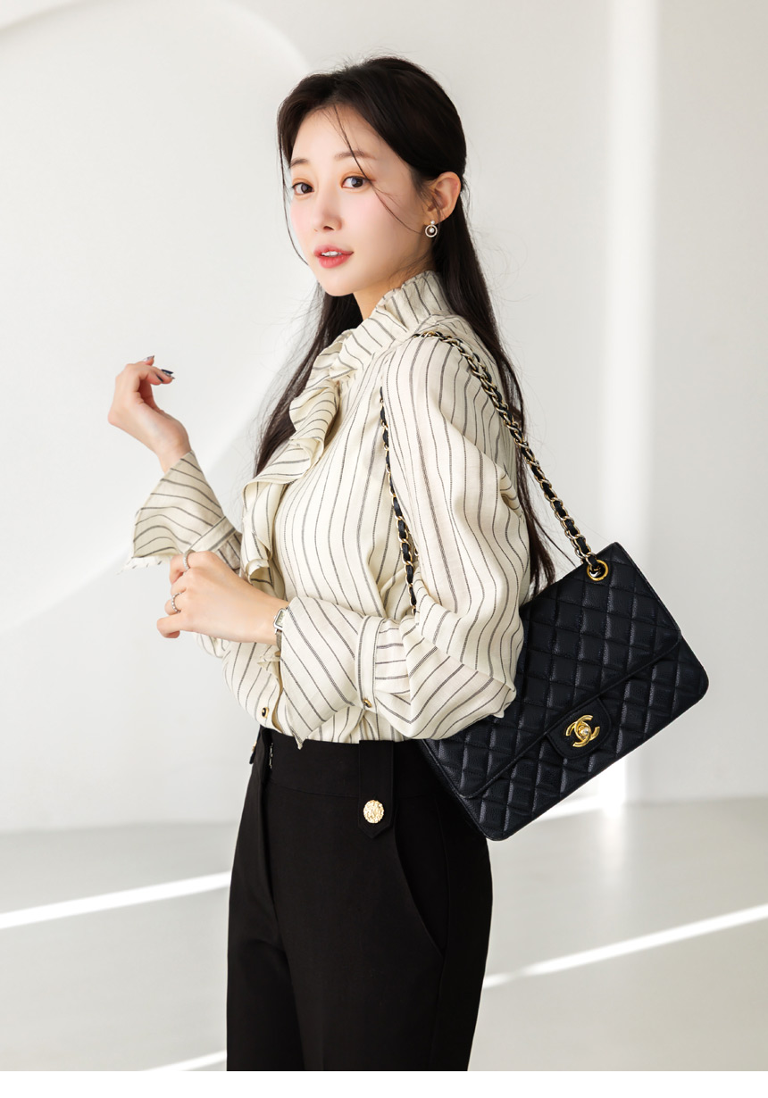 [Featuring refined stripe lines and a petal-like ruffle neckline that frames the face beautifully. The soft drape and flared cuffs create a graceful silhouette, offering effortless elegance for everyday outfits or elevated workwear looks.]