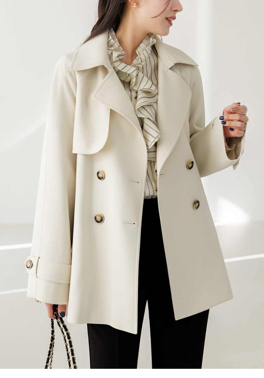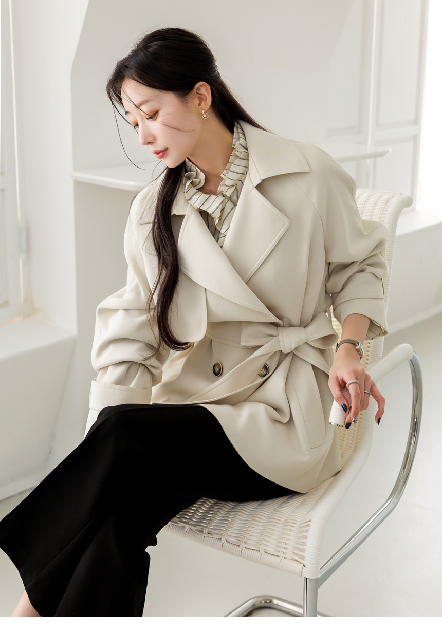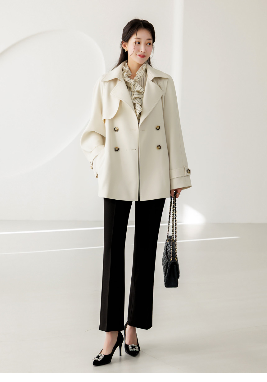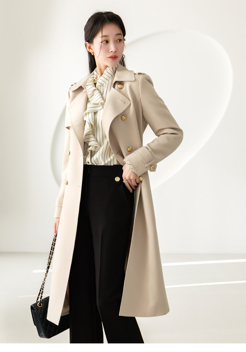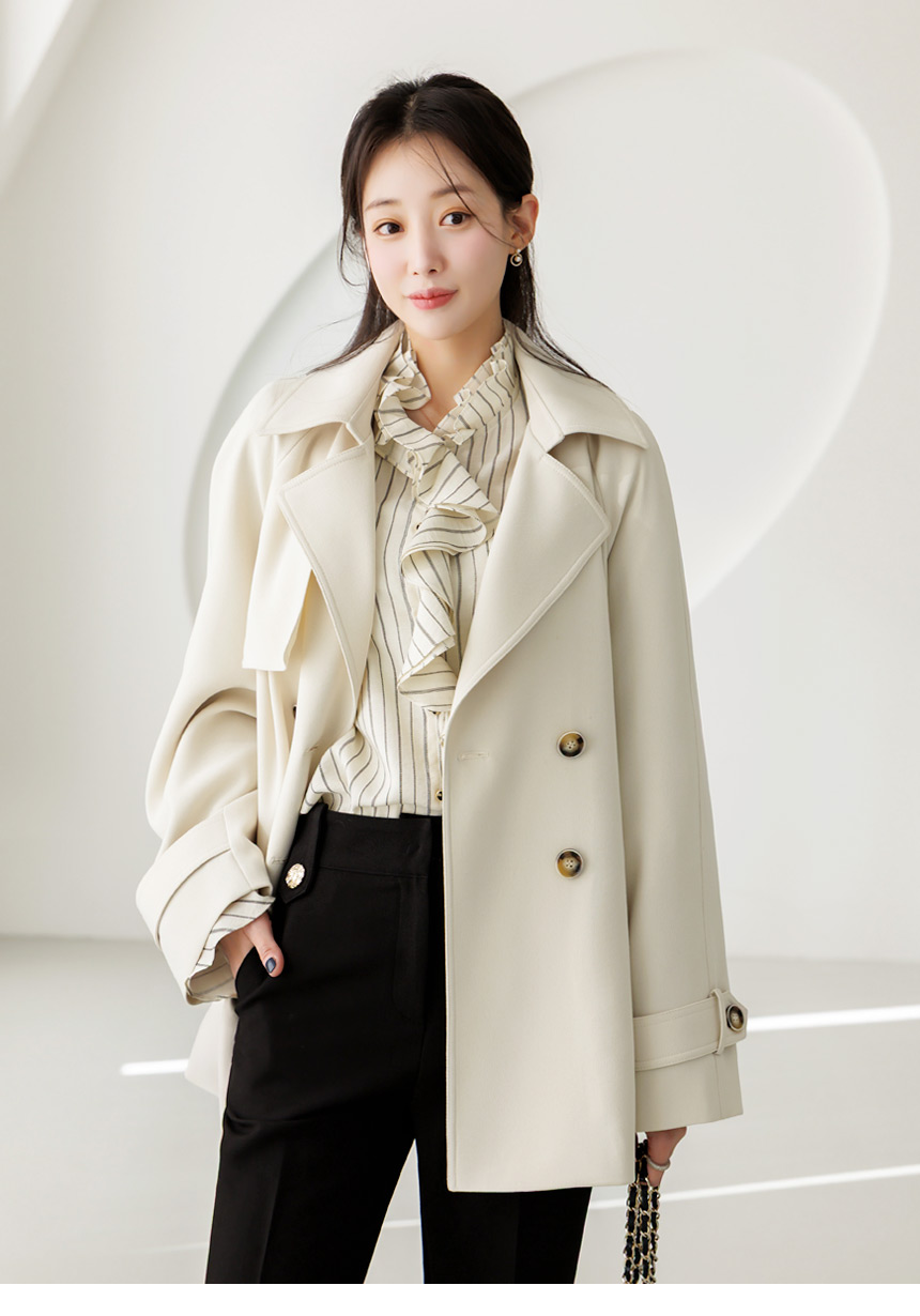 [Featuring refined stripe lines and a petal-like ruffle neckline that frames the face beautifully. The soft drape and flared cuffs create a graceful silhouette, offering effortless elegance for everyday outfits or elevated workwear looks.]