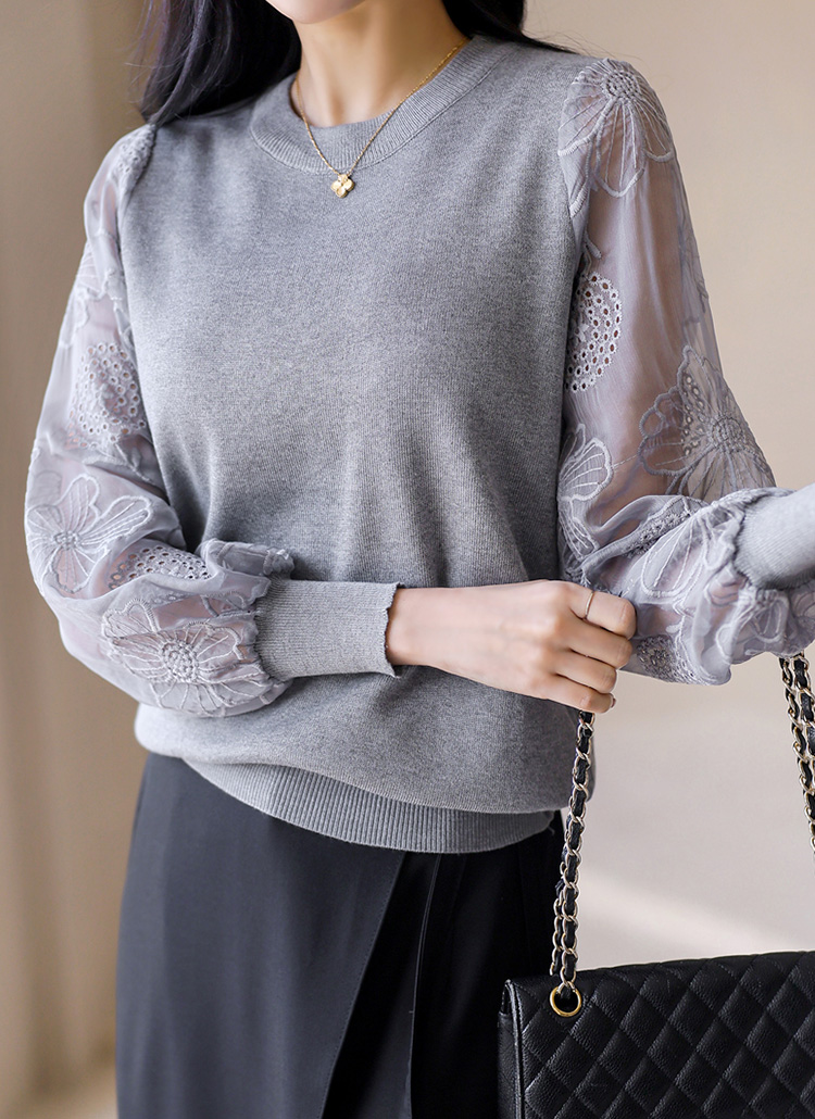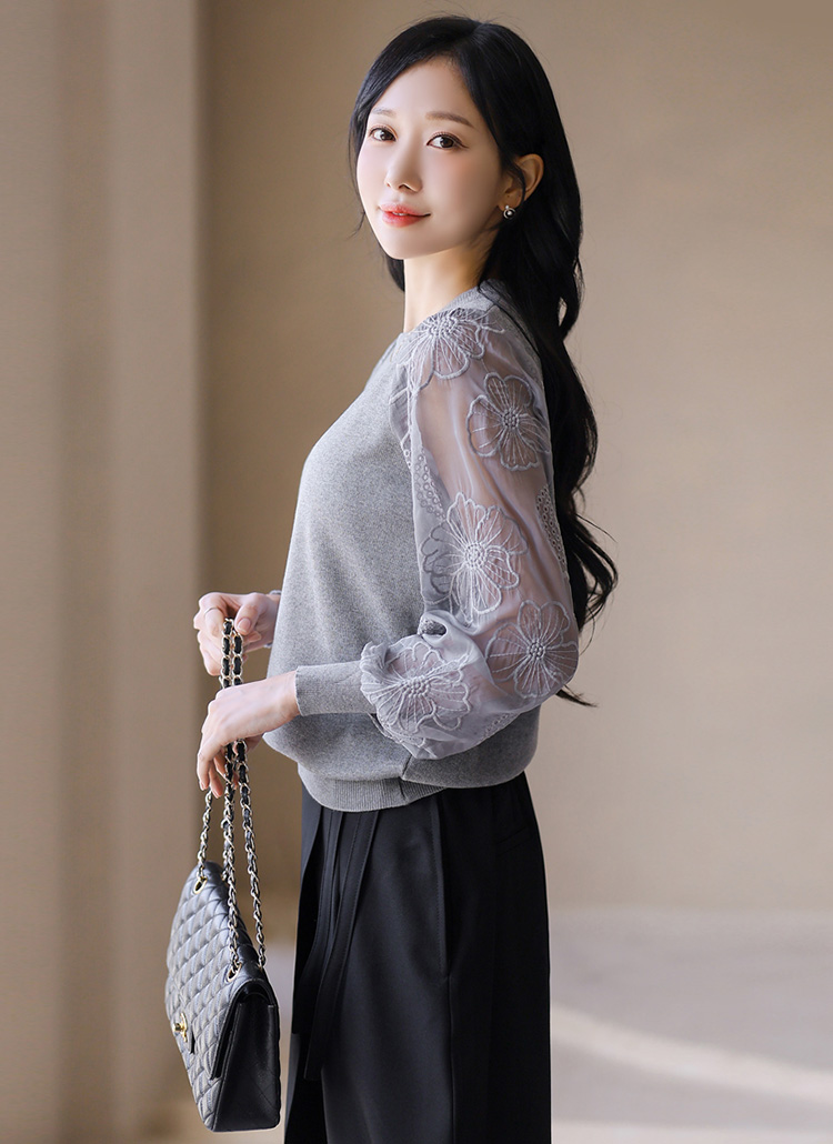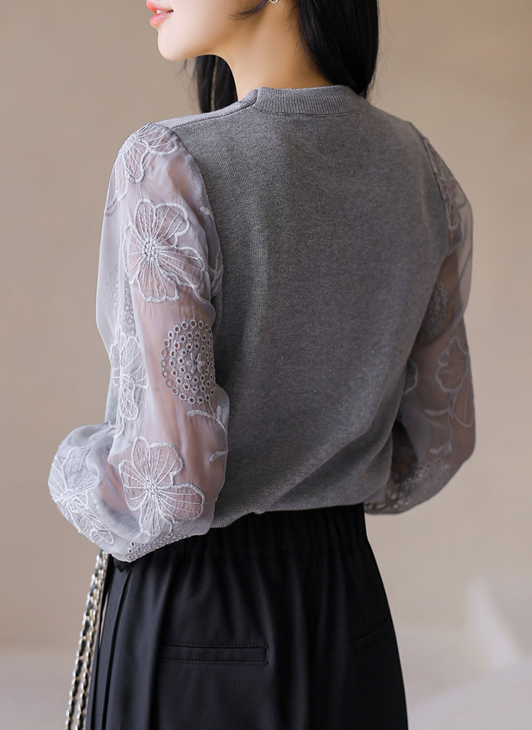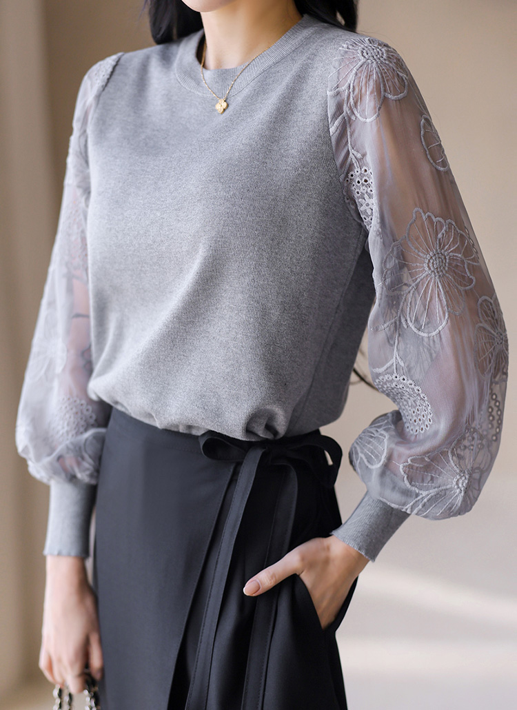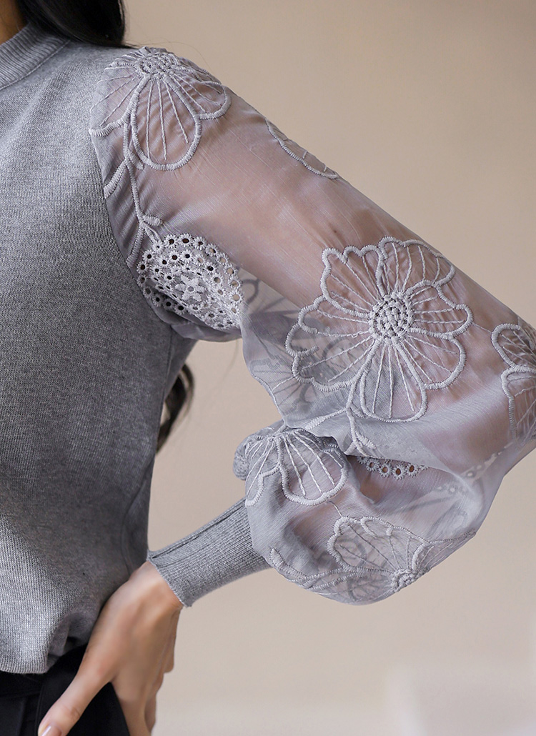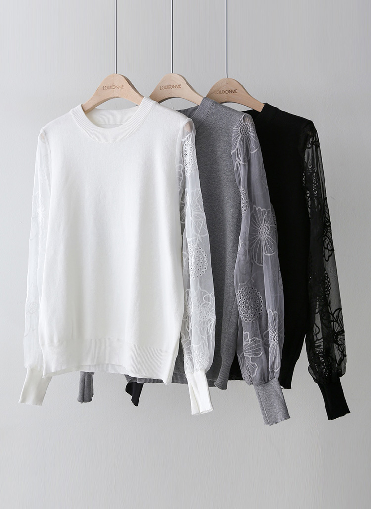 [Soft knit blouse with airy sheer chiffon sleeves embroidered with delicate floral patterns. Stretchy knit body ensures comfort while the elegant sleeves add a refined feminine touch.]