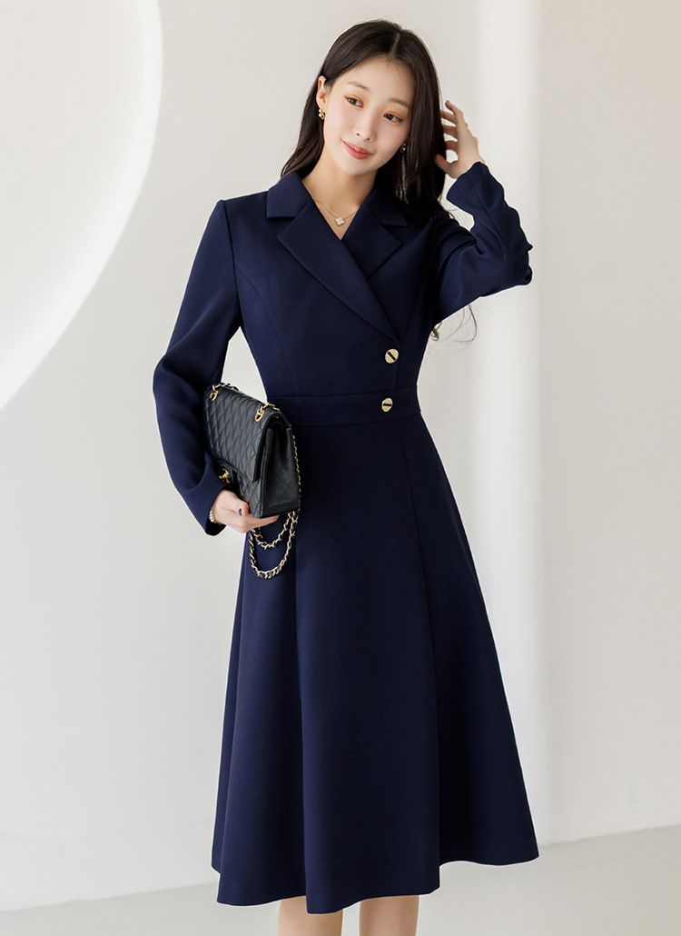 [Refined wrap-style midi dress with a sharp tailored collar and softly flared skirt. Sculpting waist seam and gold-tone buttons create a polished silhouette for events or office wear.]