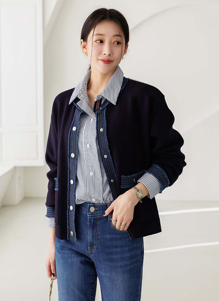 [Refined knit cardigan designed with contrast denim trim and delicate fringe edges. The structured knit shape offers the elegance of a jacket with the softness of a cardigan.]