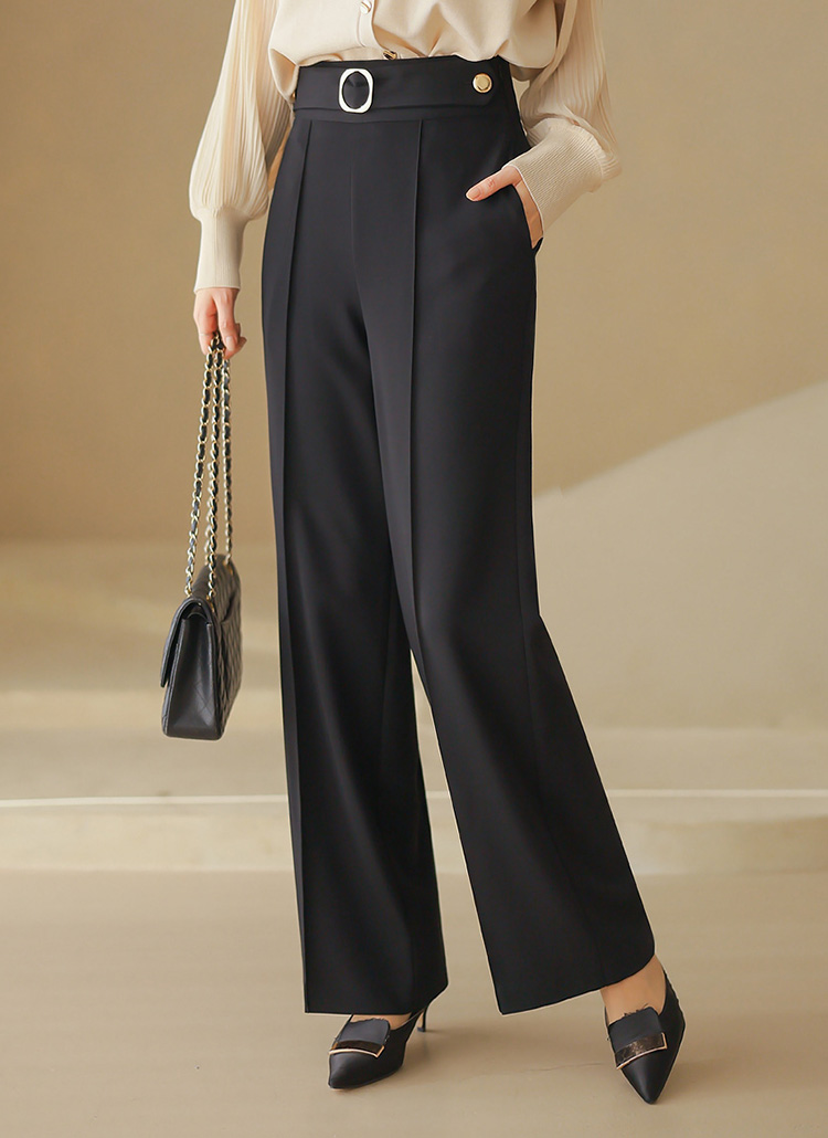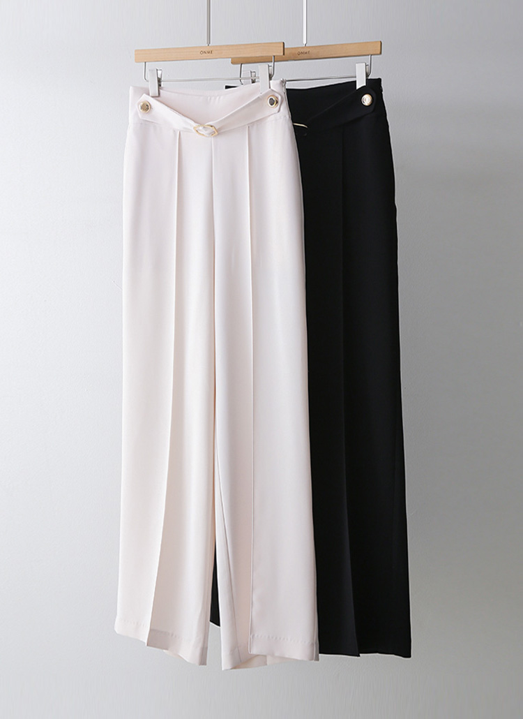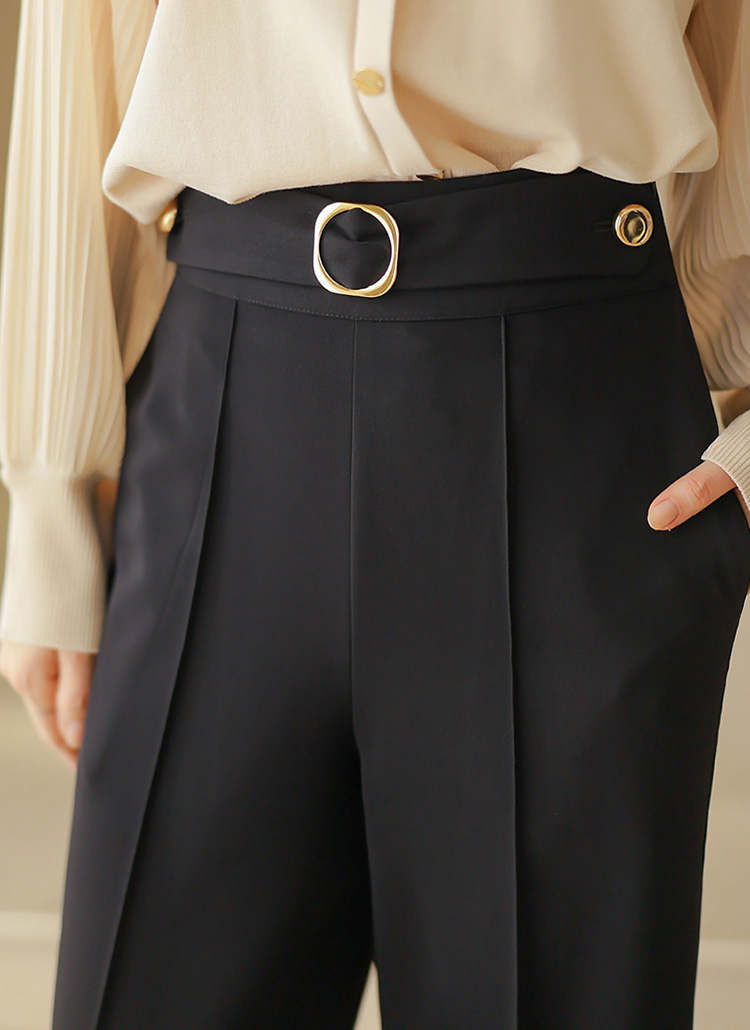 [Modern wide trousers featuring a sleek gold buckle waist and fluid drape. The pressed front crease refines the silhouette while keeping the look polished and versatile.]