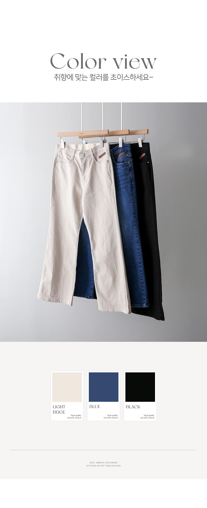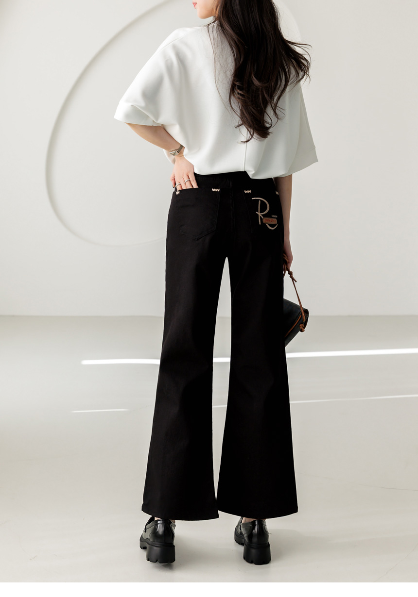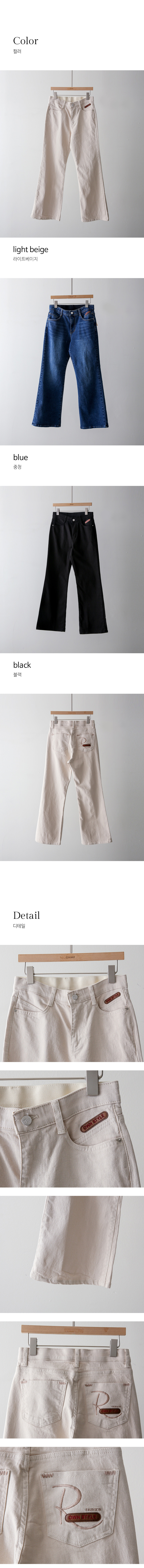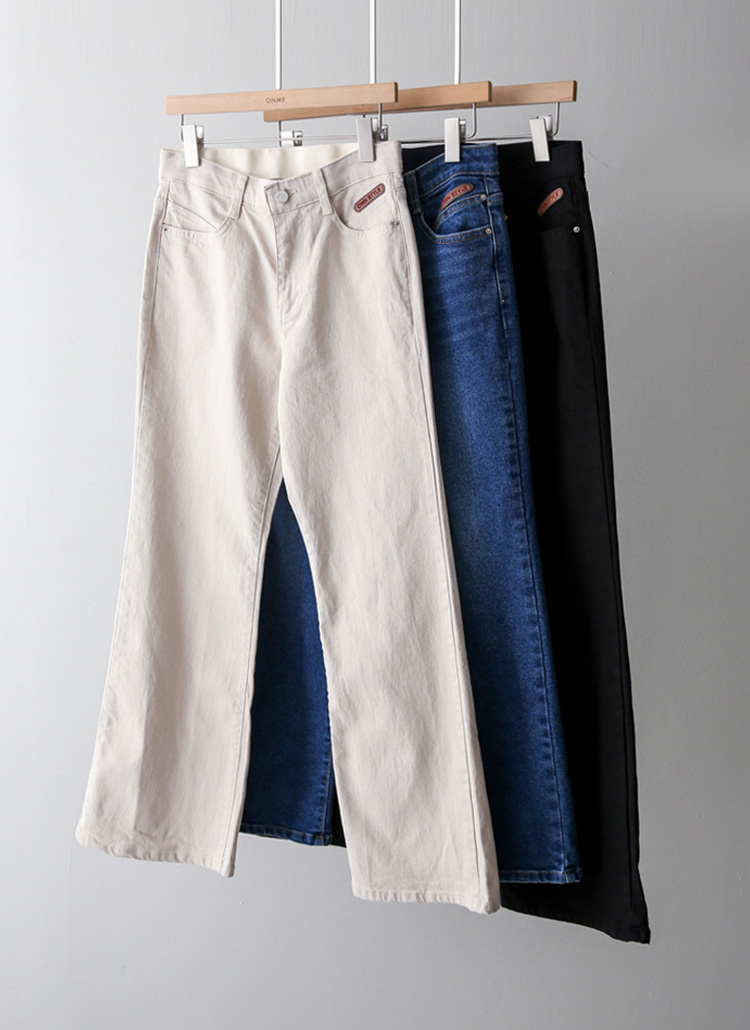 과하게 타이트하지 않고 살짝 여유감 있게 떨어지는 세미 부츠컷 실루엣으로