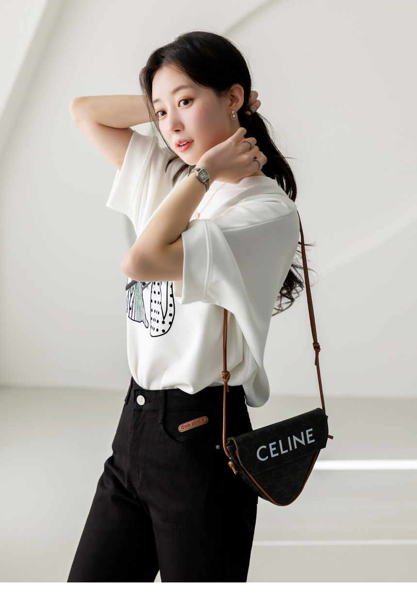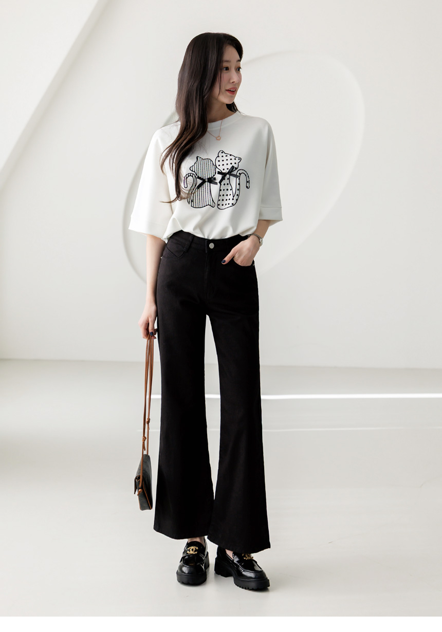 • A comfy relaxed-fit tee featuring twin cat graphics, glossy bow details, and light-catching hotfix accents that brighten everyday outfits.
