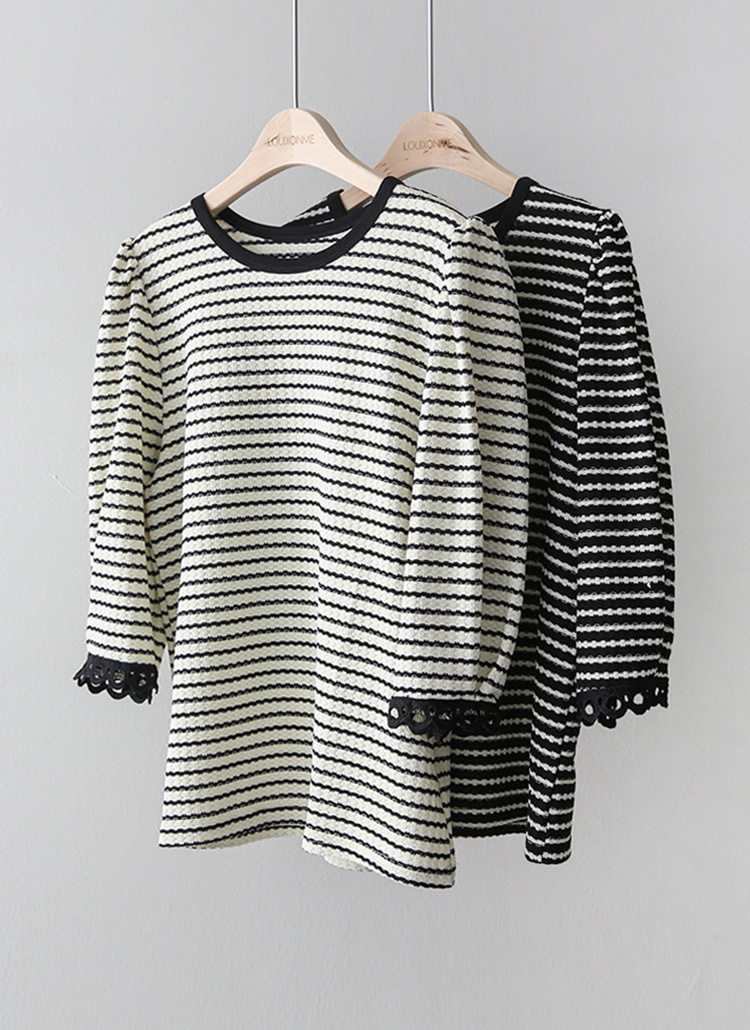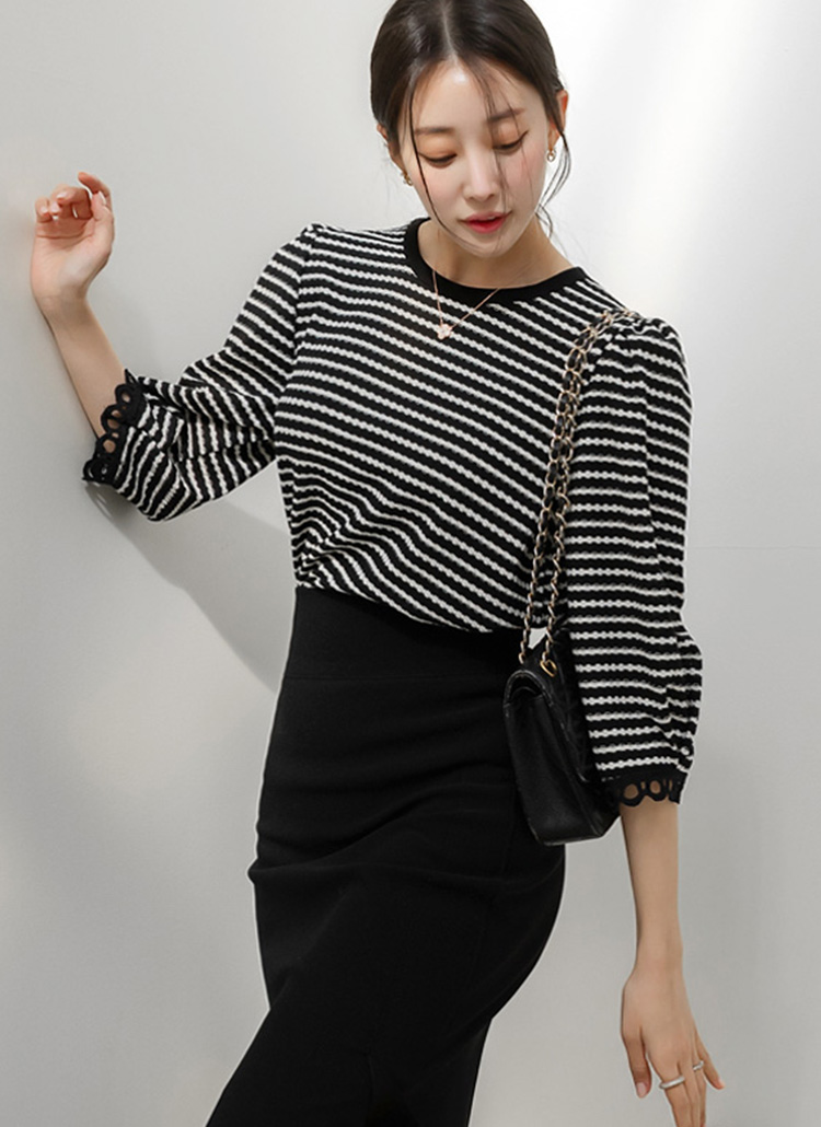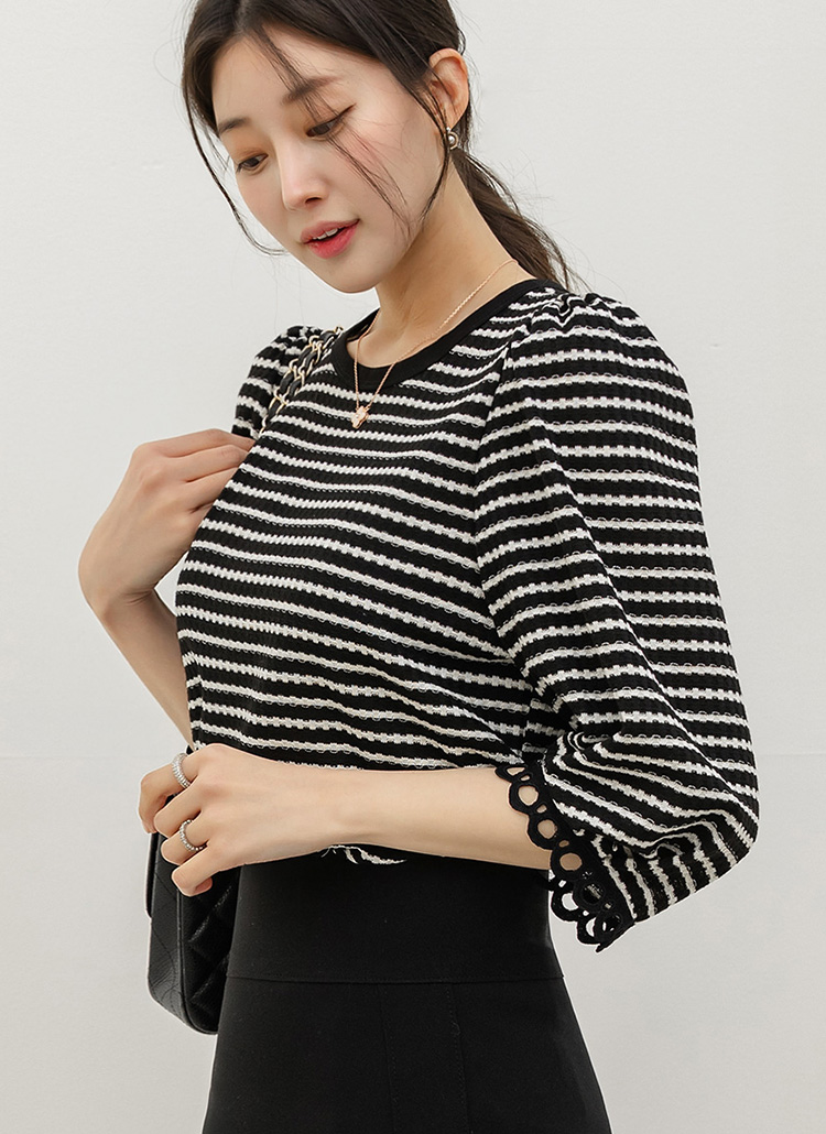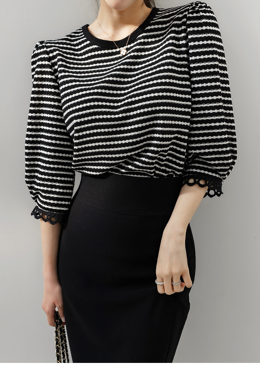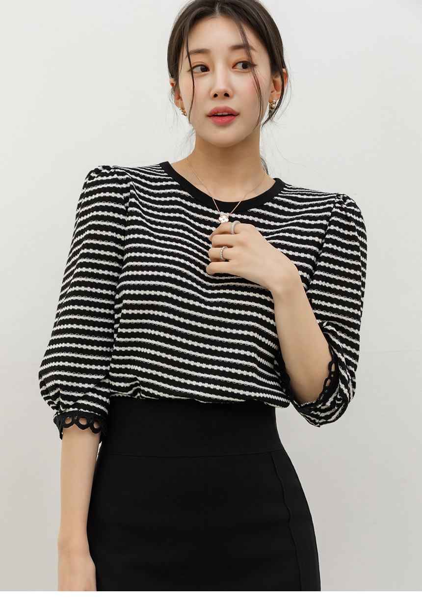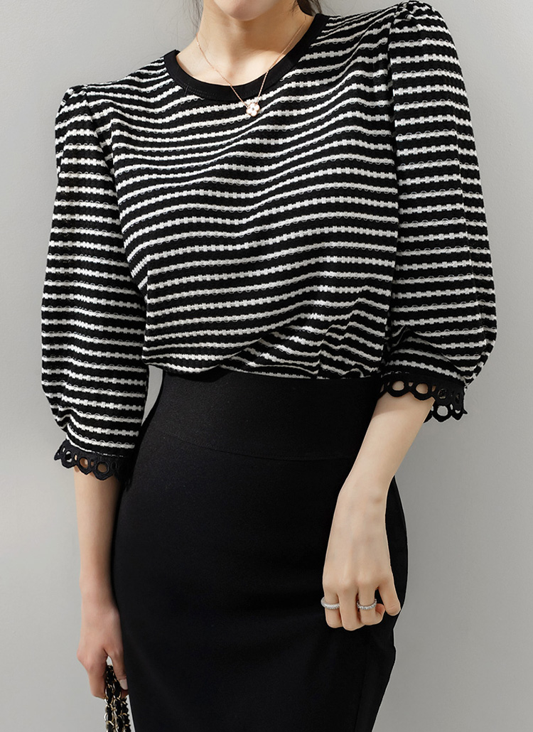 [Elegant jacquard stripe top with soft stretch fabric, subtle texture, and voluminous puff sleeves finished with lace trim for a refined feminine look.]