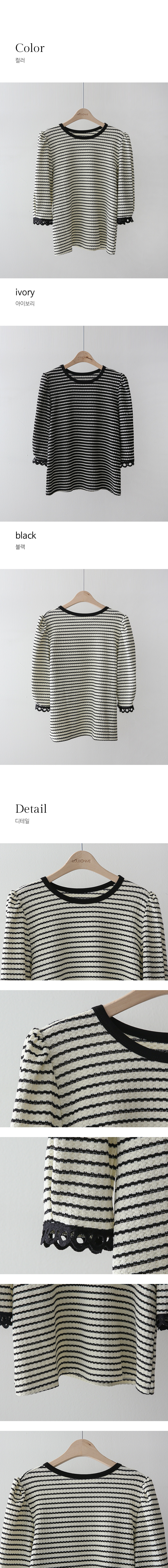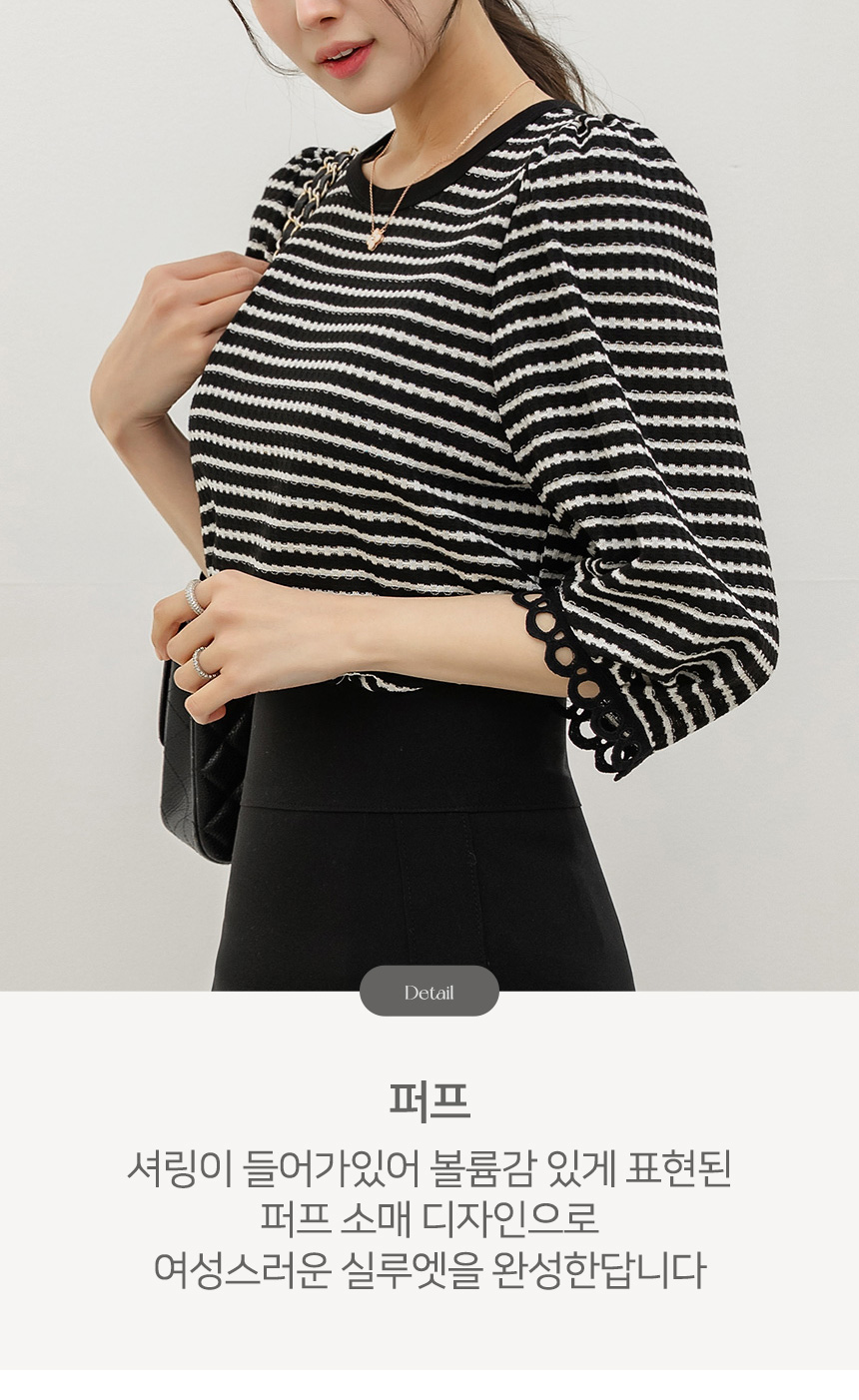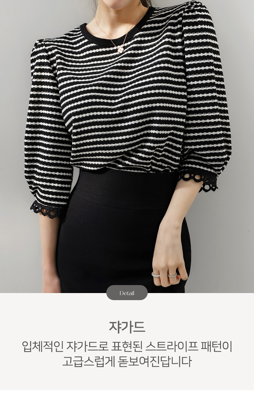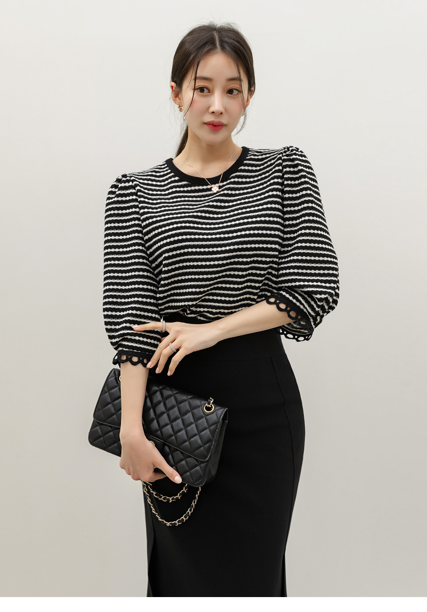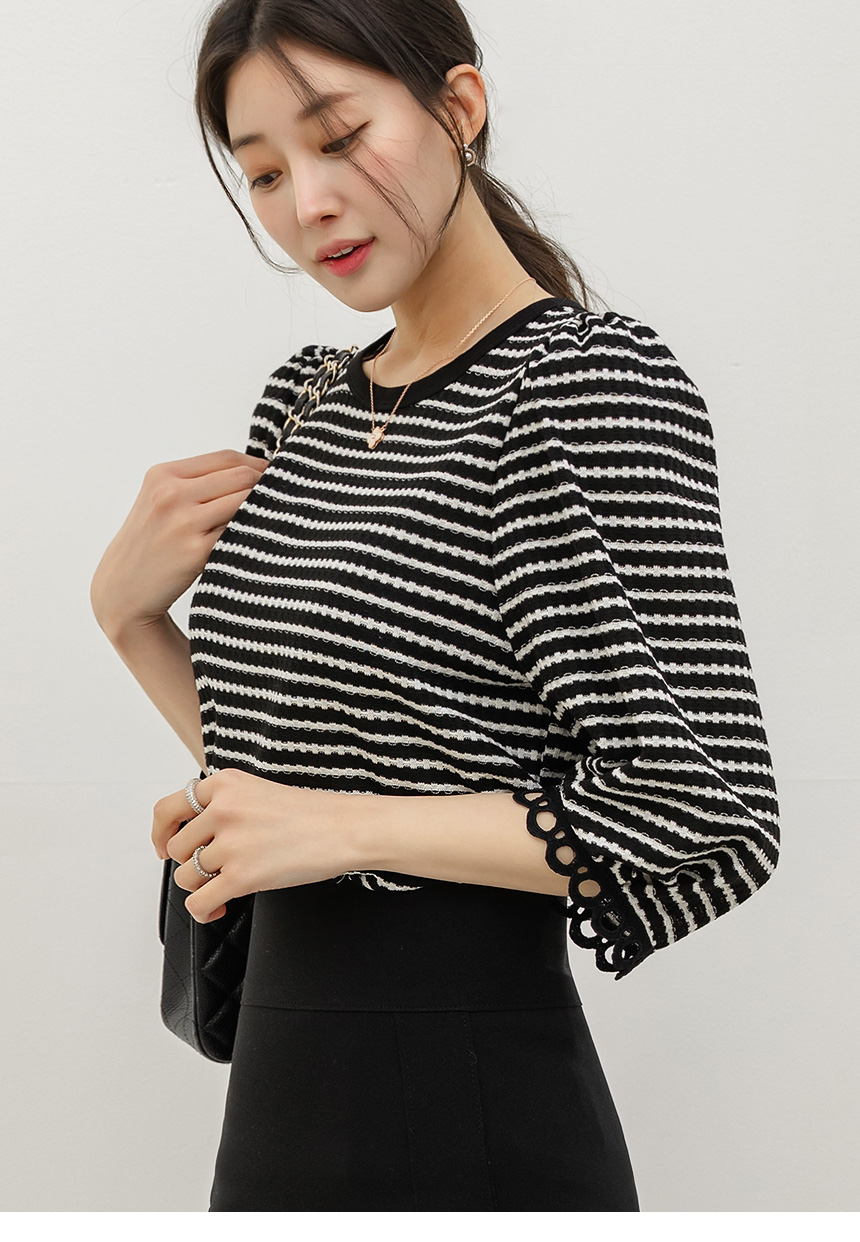 [Elegant jacquard stripe top with soft stretch fabric, subtle texture, and voluminous puff sleeves finished with lace trim for a refined feminine look.]