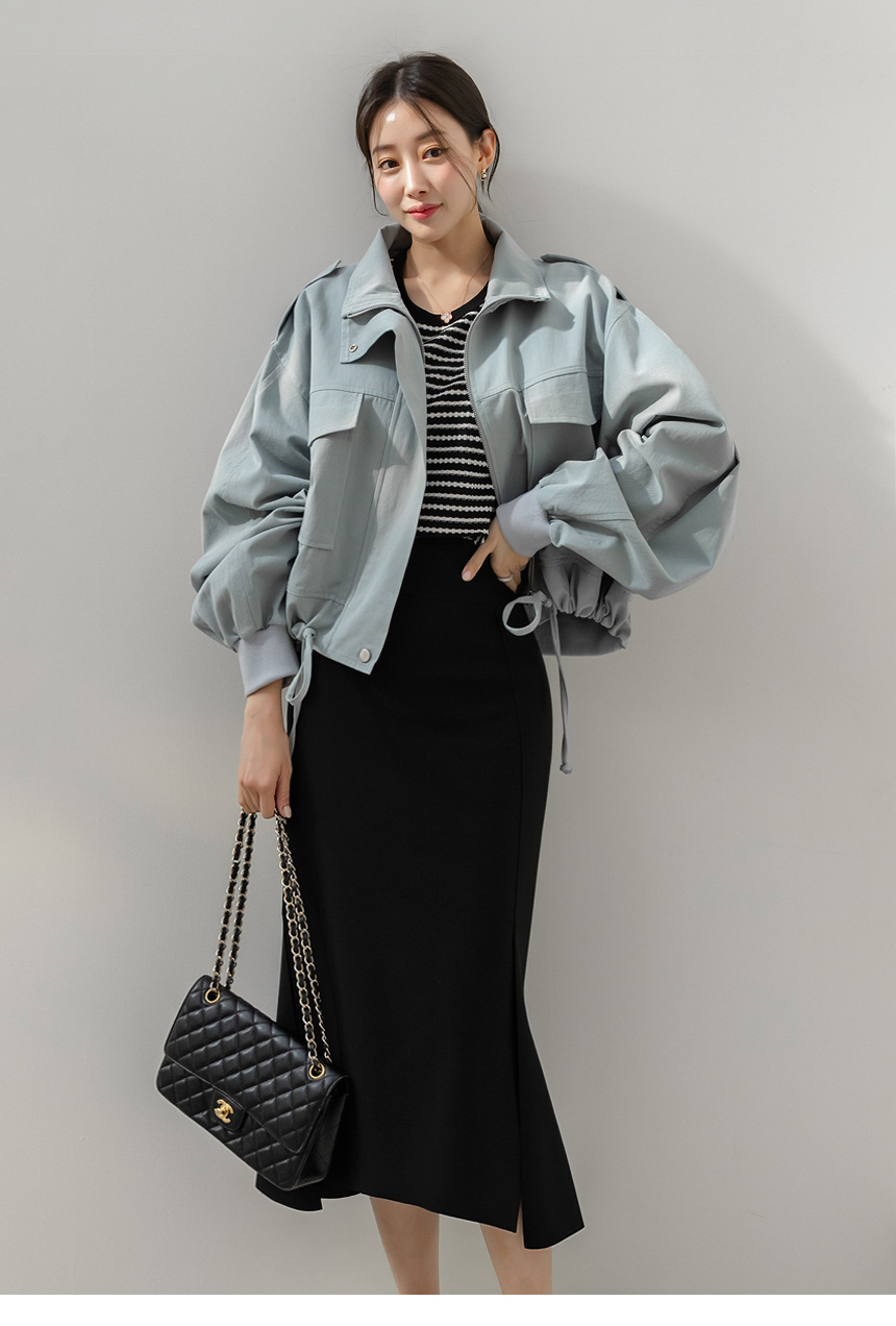 • Oversized utility jacket with voluminous balloon sleeves, adjustable drawstring hem, and a modern cropped fit for effortless layering and everyday style.