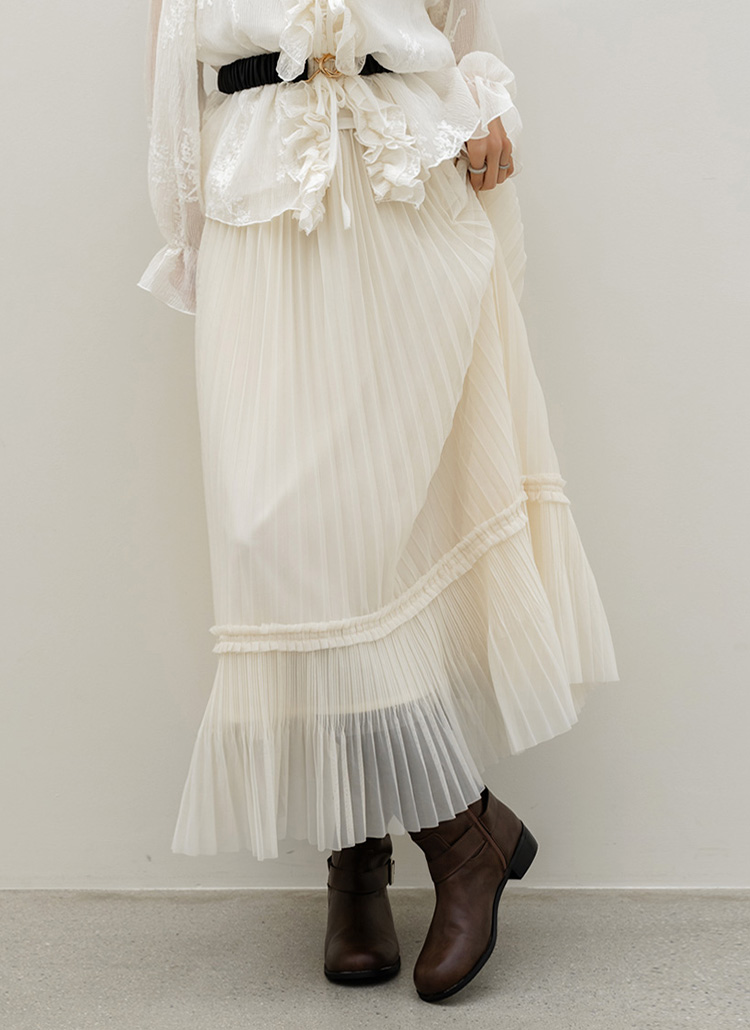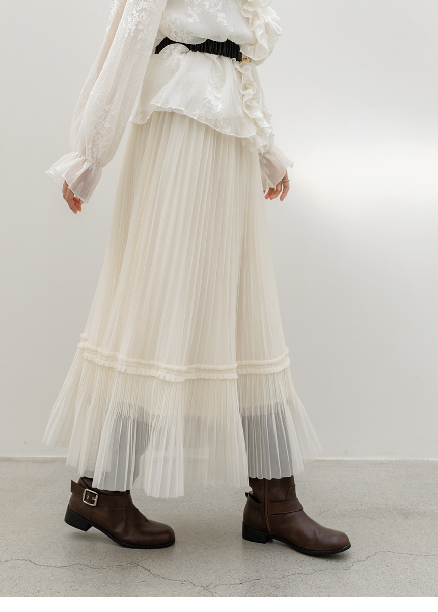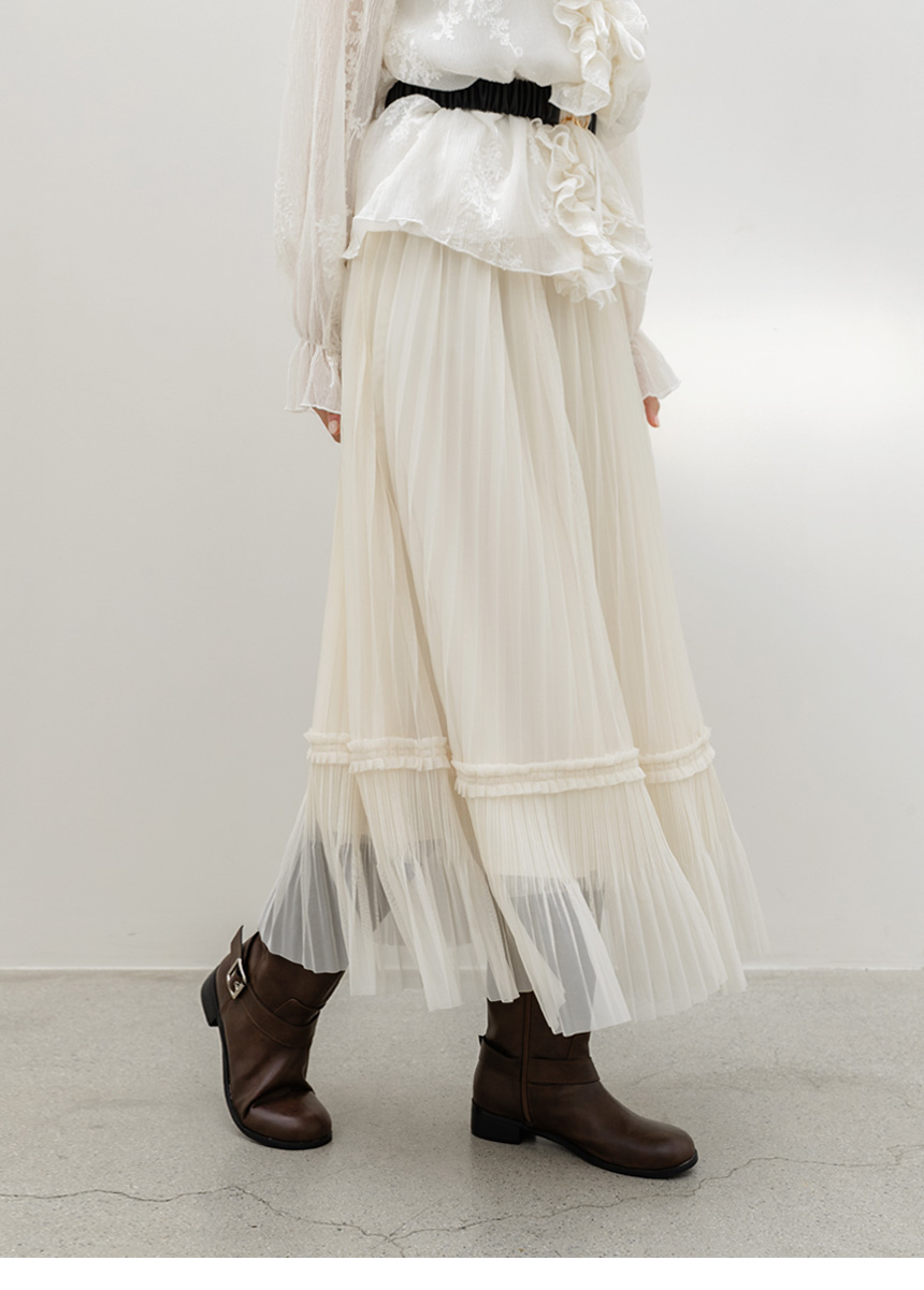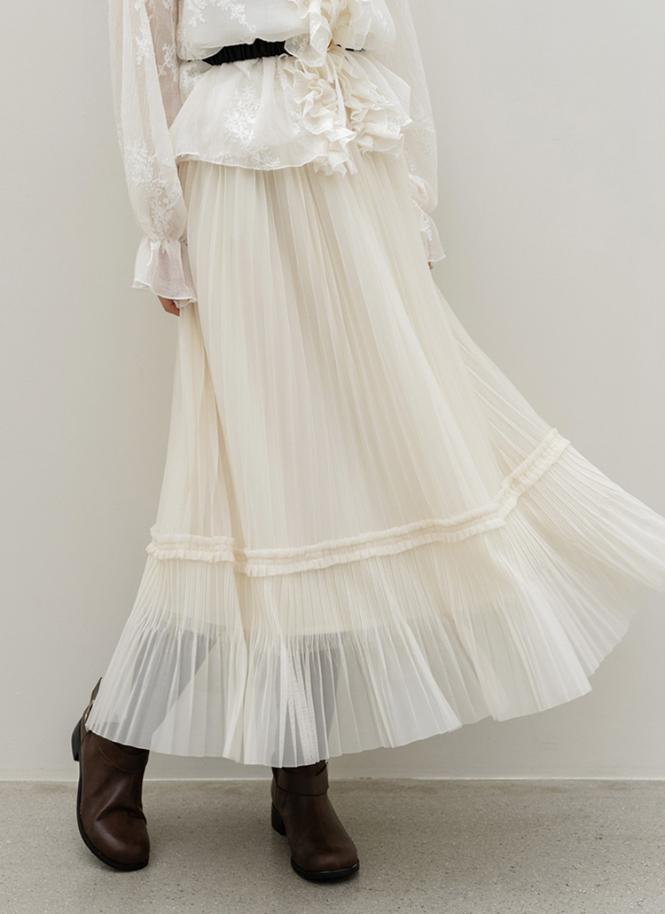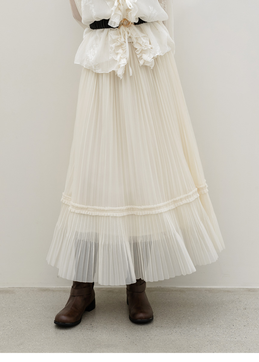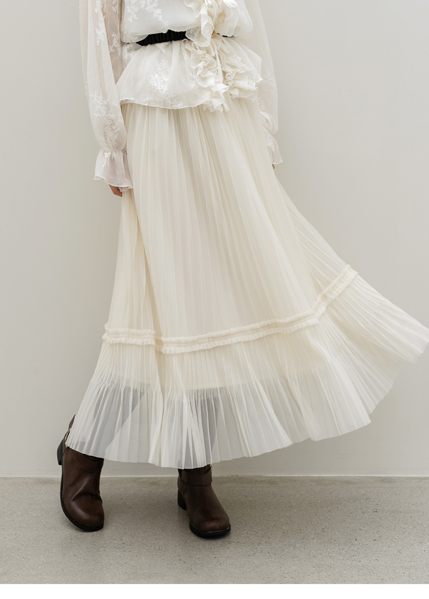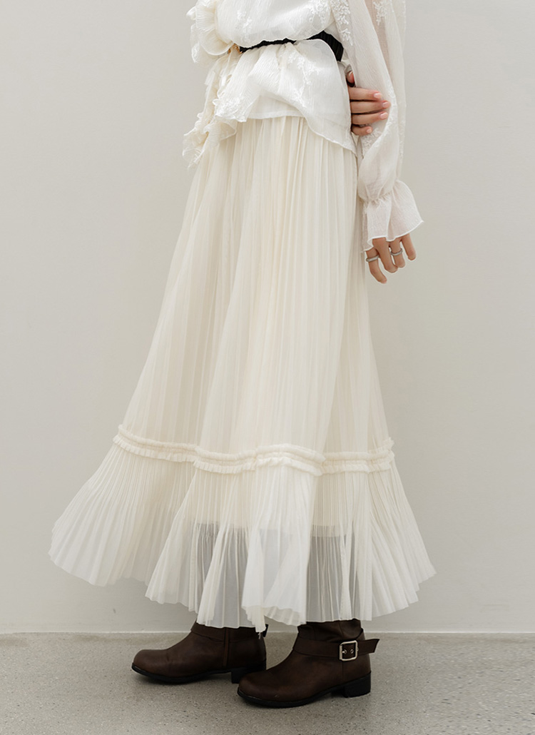 샤르비 허리 밴딩 샤 레이스 플리츠 A라인 롱 스커트