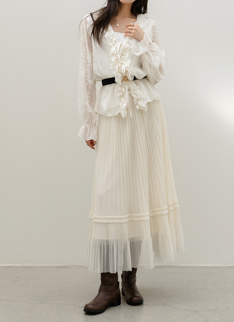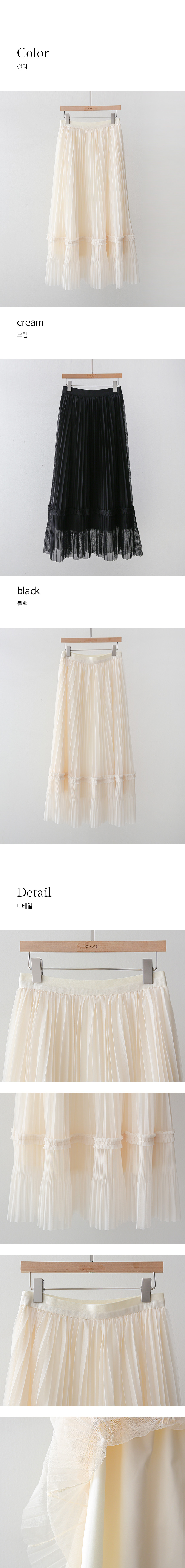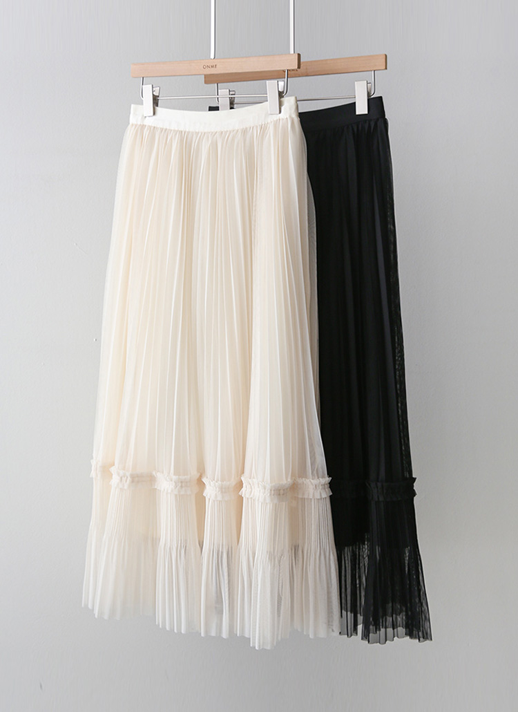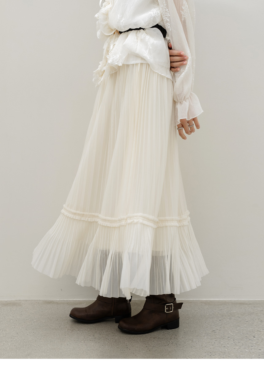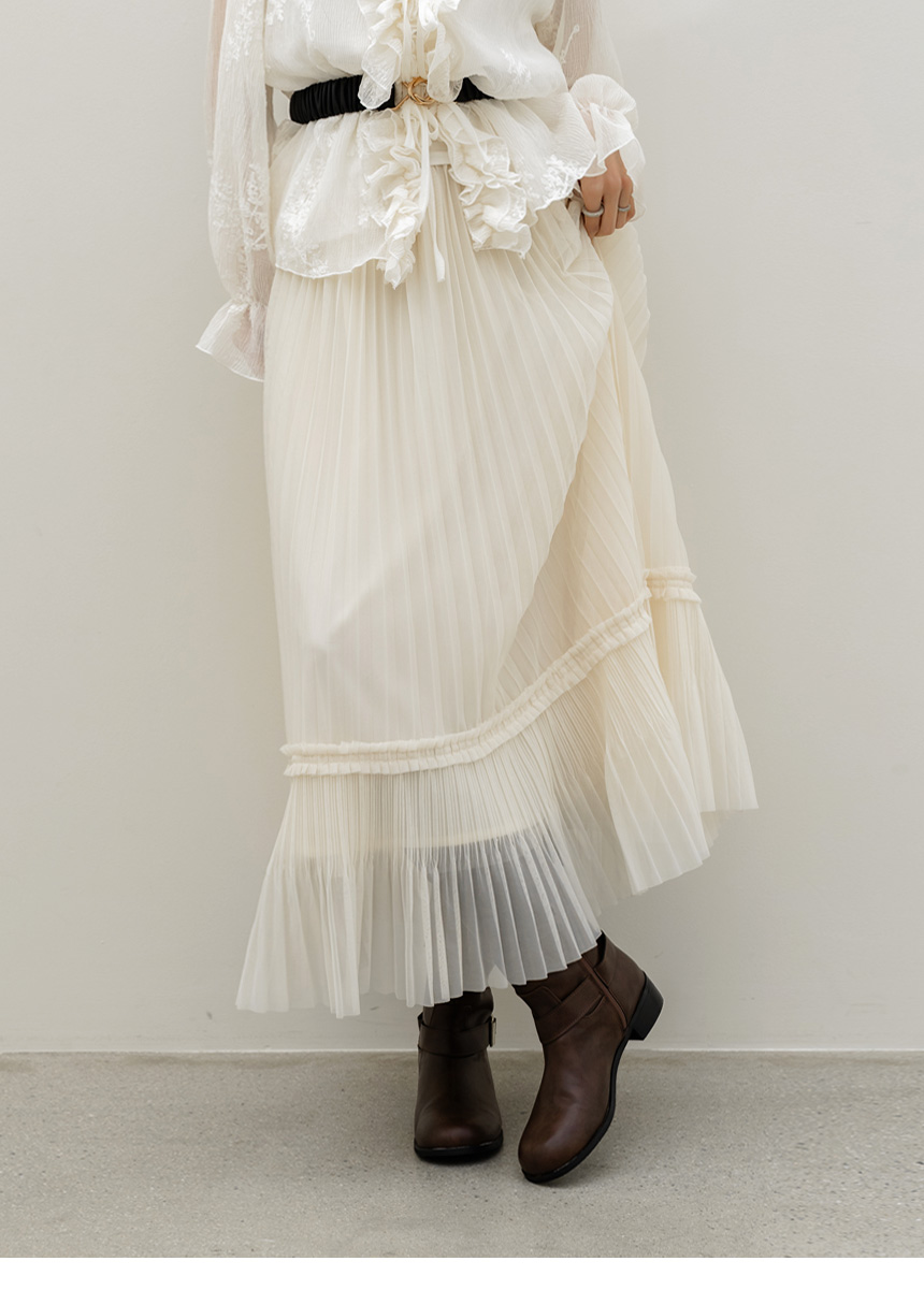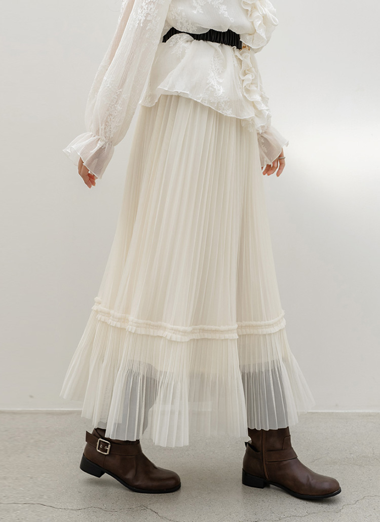 샤르비 허리 밴딩 샤 레이스 플리츠 A라인 롱 스커트