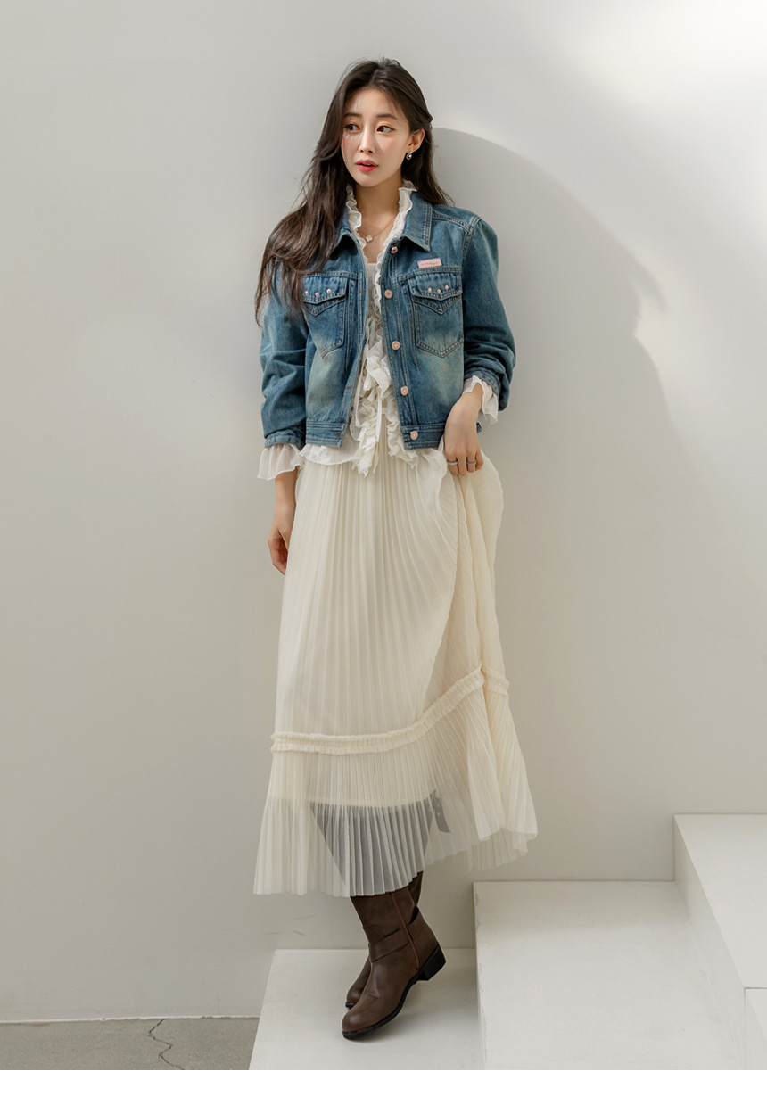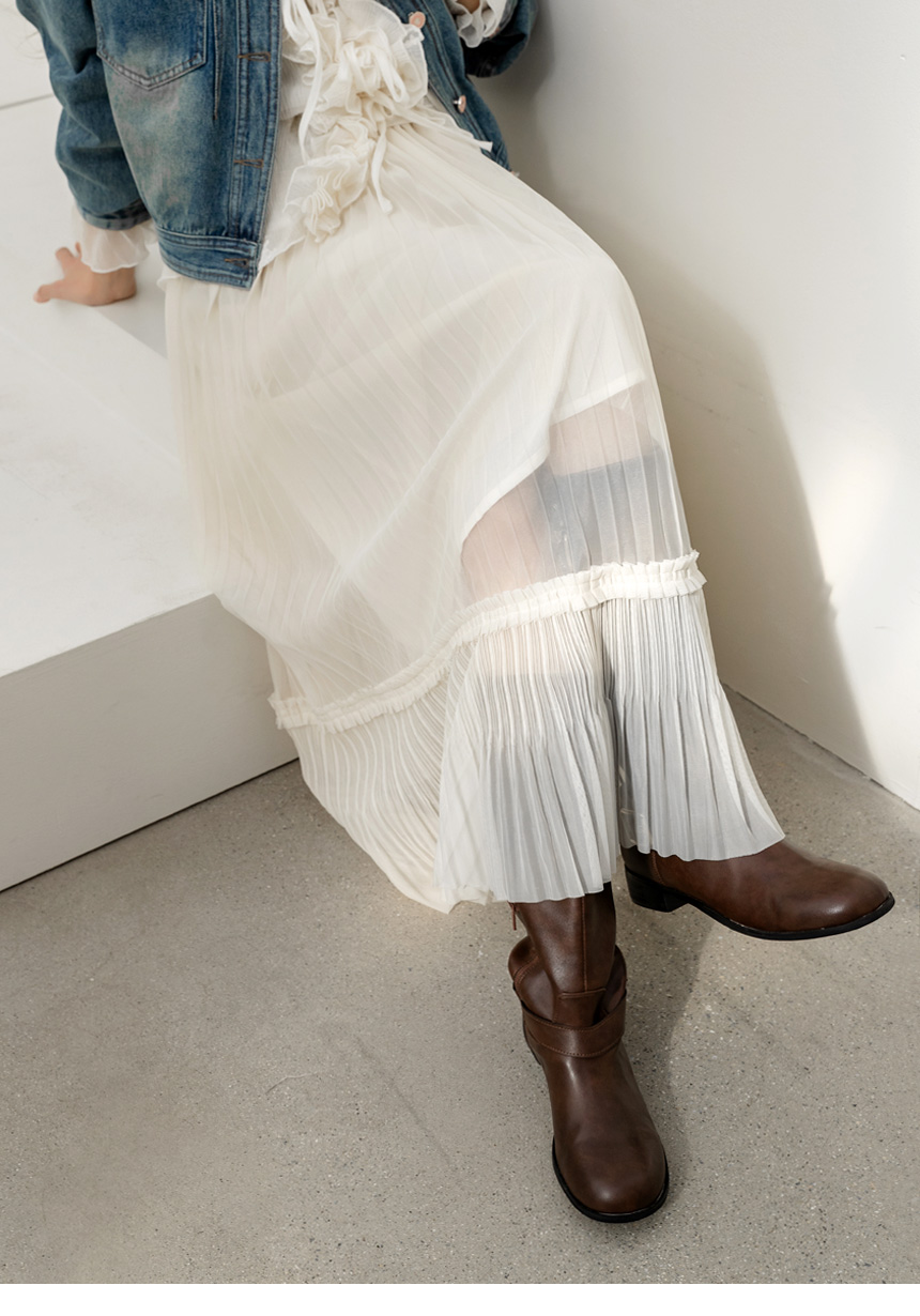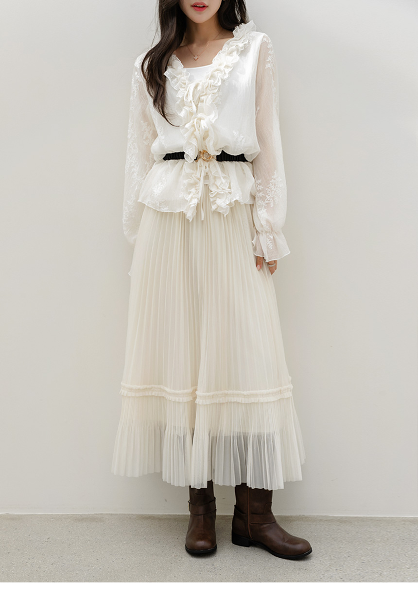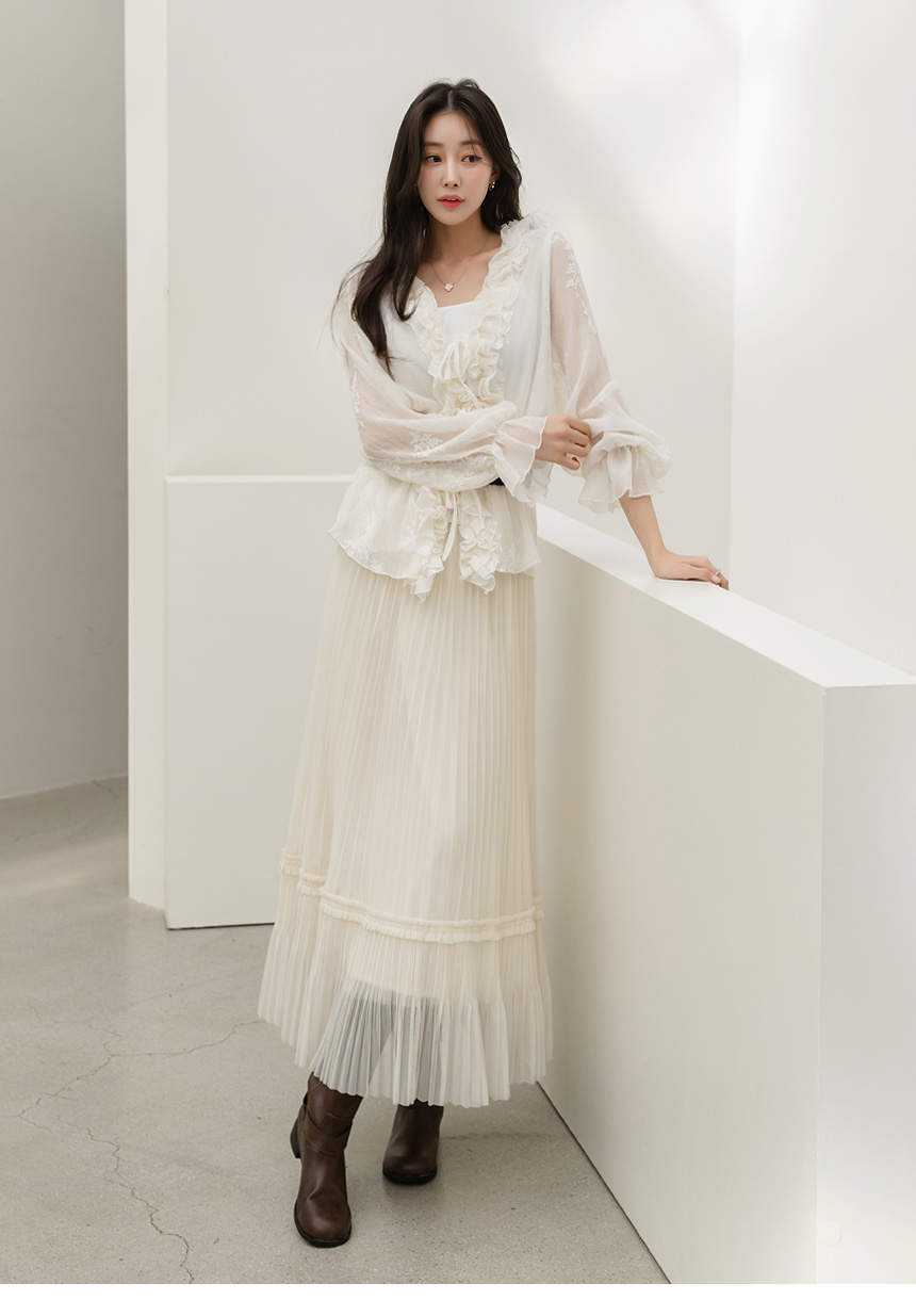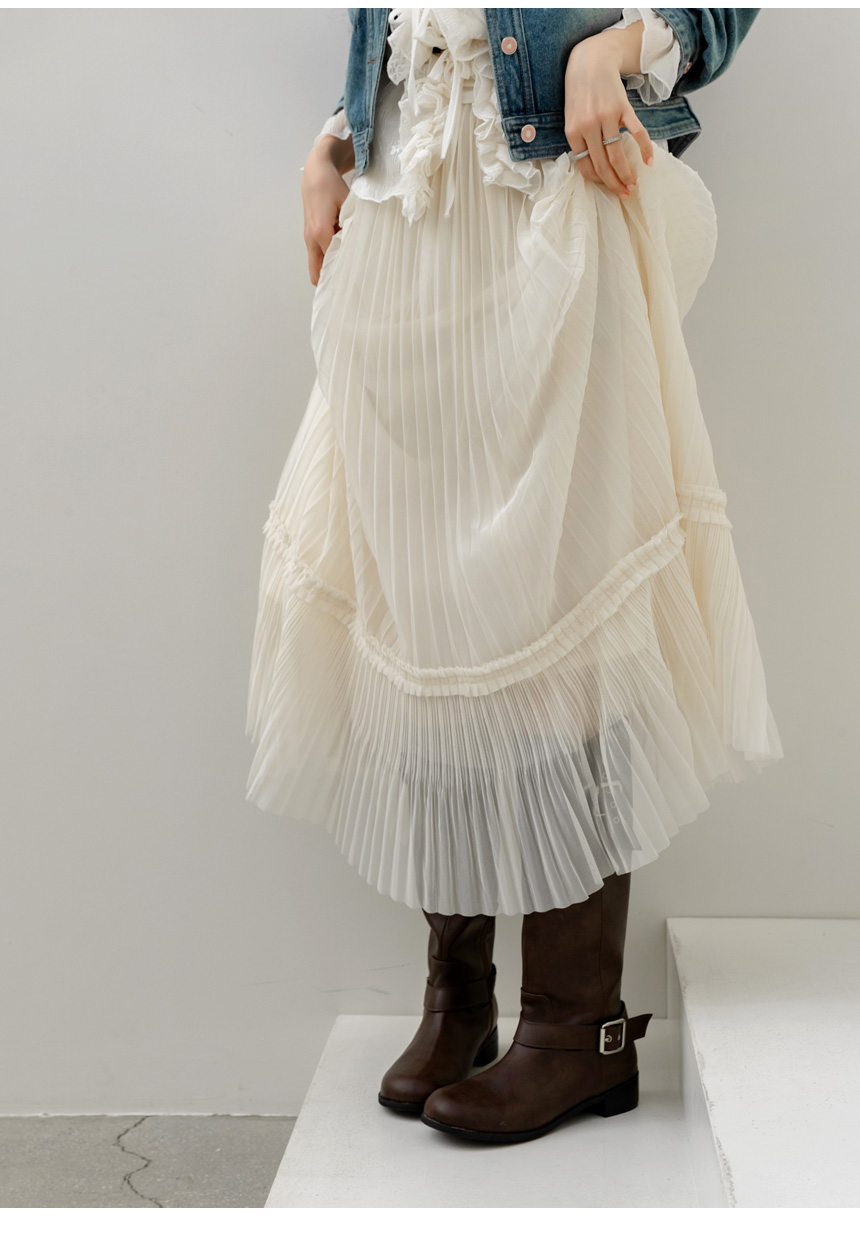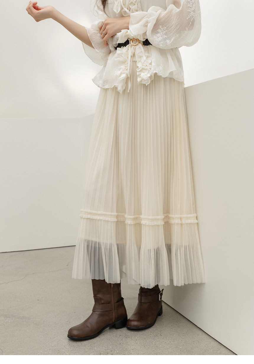 샤르비 허리 밴딩 샤 레이스 플리츠 A라인 롱 스커트