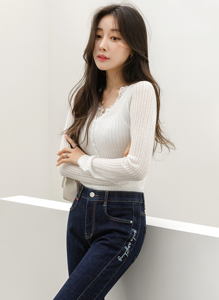 에멘탈 플라워 레이스 배색 슬림 실루엣 스카시 꽈배기 골지 니트