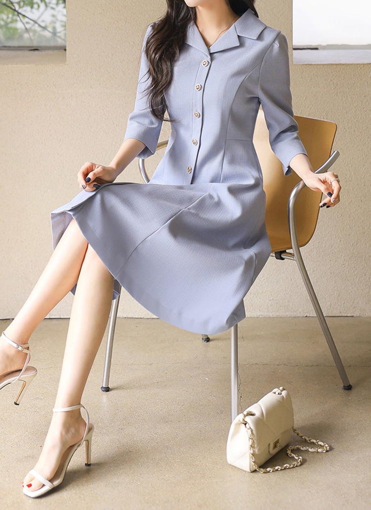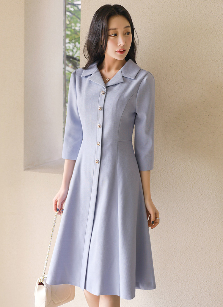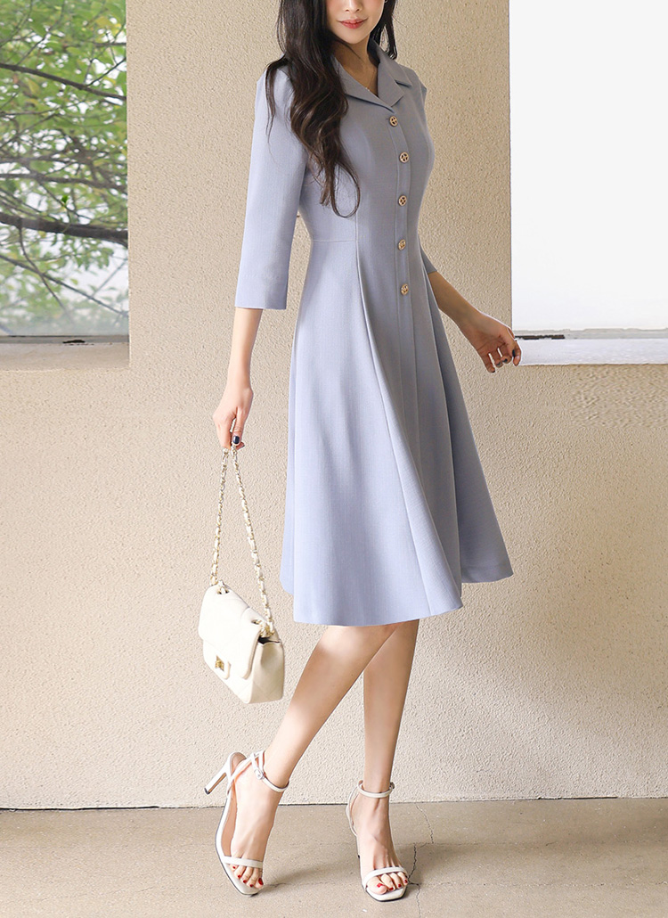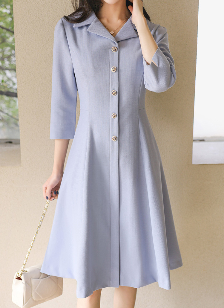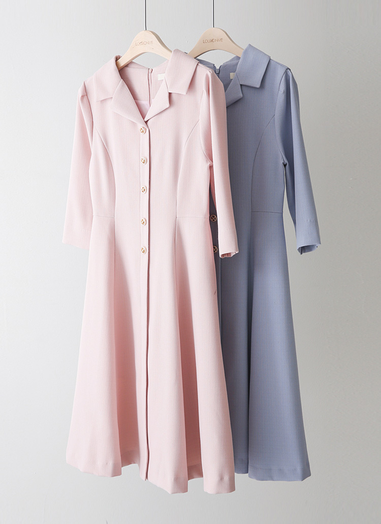 (55-77) 미디 A라인 플레어 카라넥 버튼 7부 소매 원피스