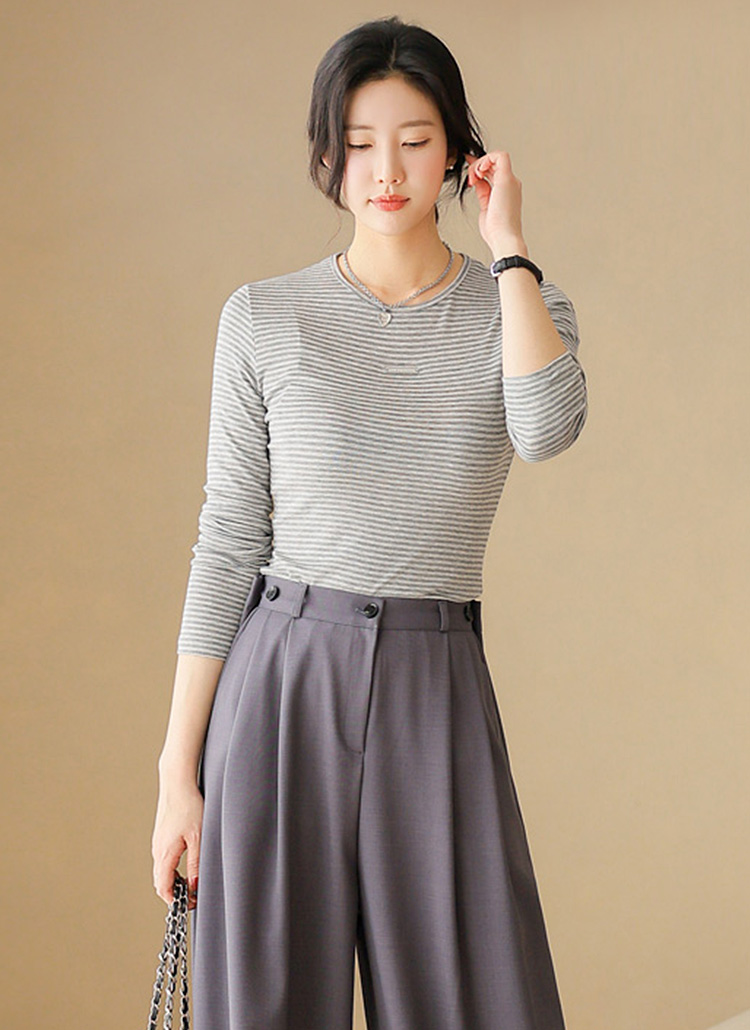 얇은 스트라이프 패턴과 기본 라운드 넥의 긴팔 디자인으로