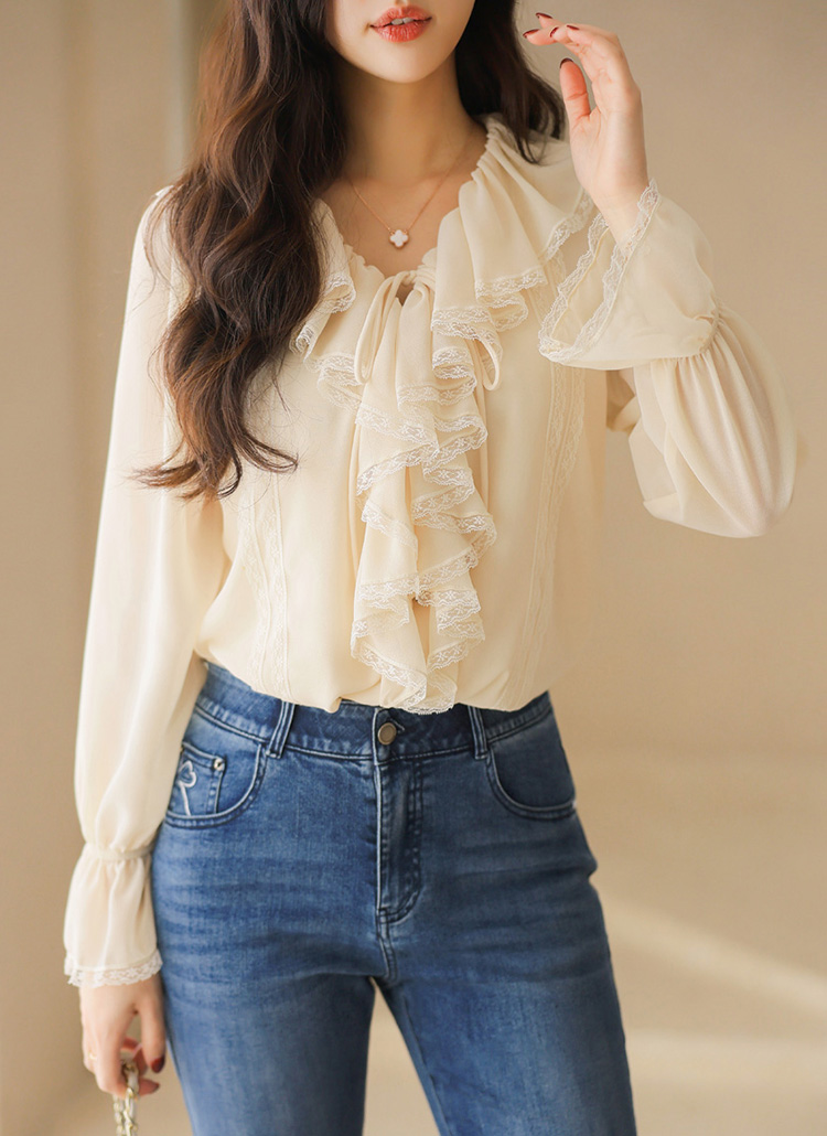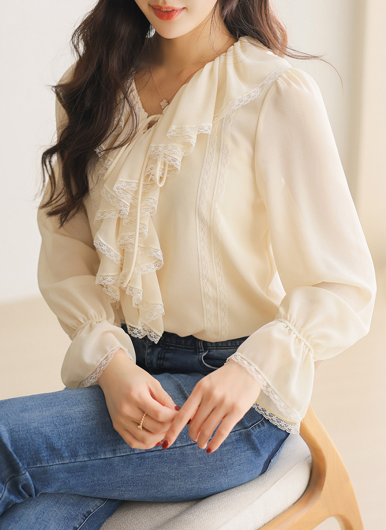 Romantic Lace Ruffle Neck Chiffon Blouse