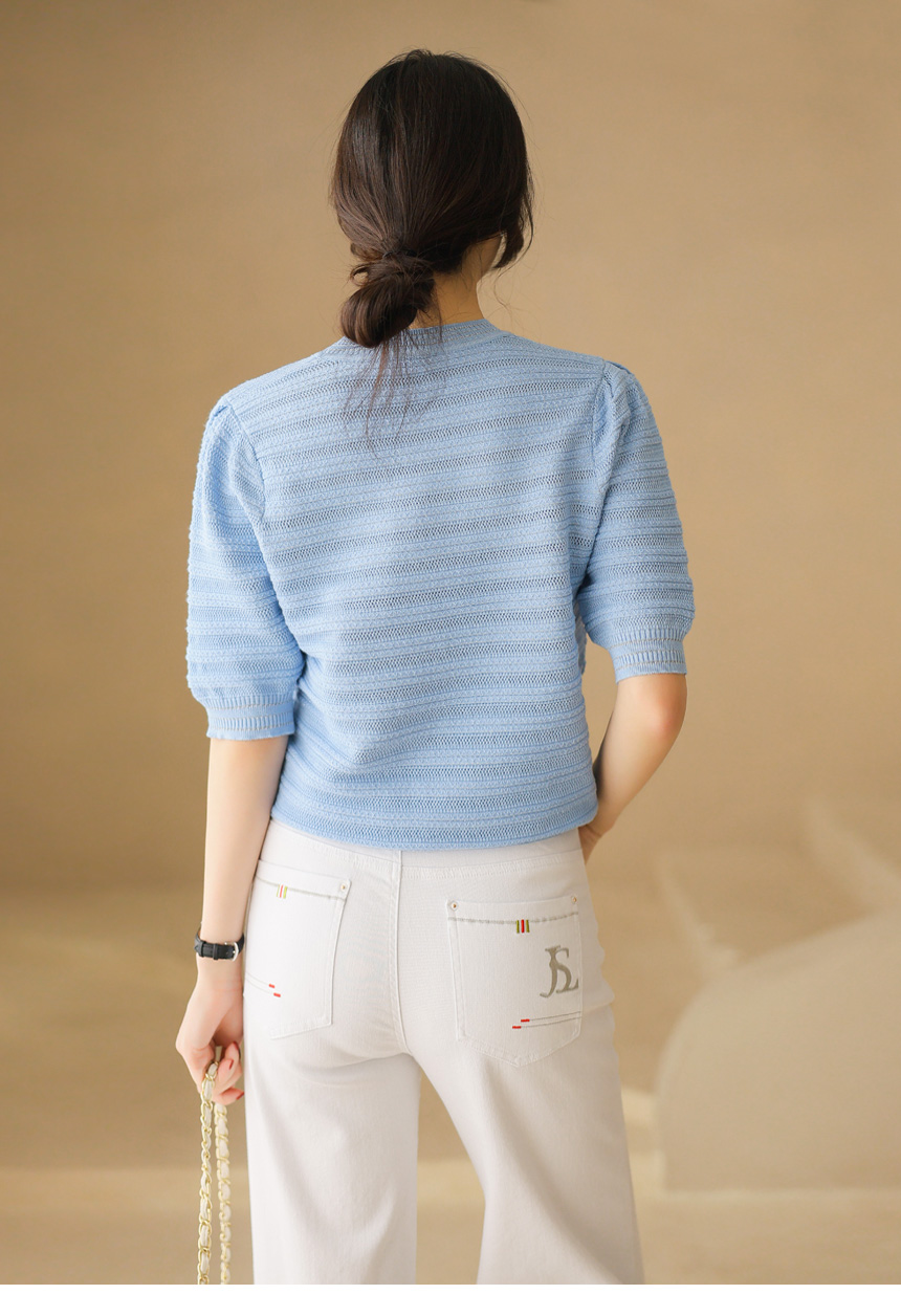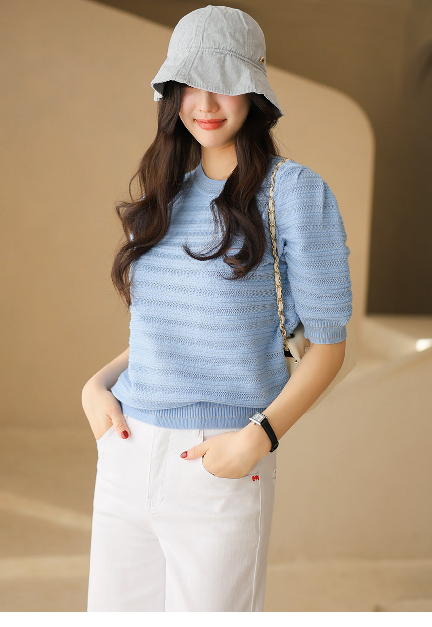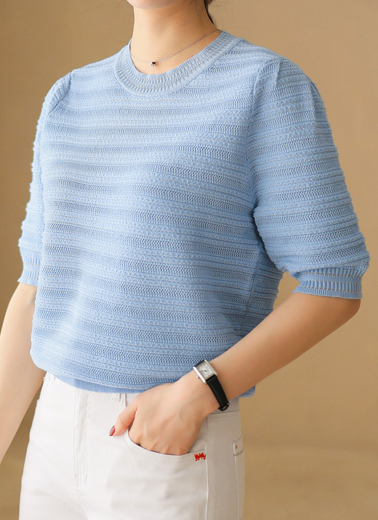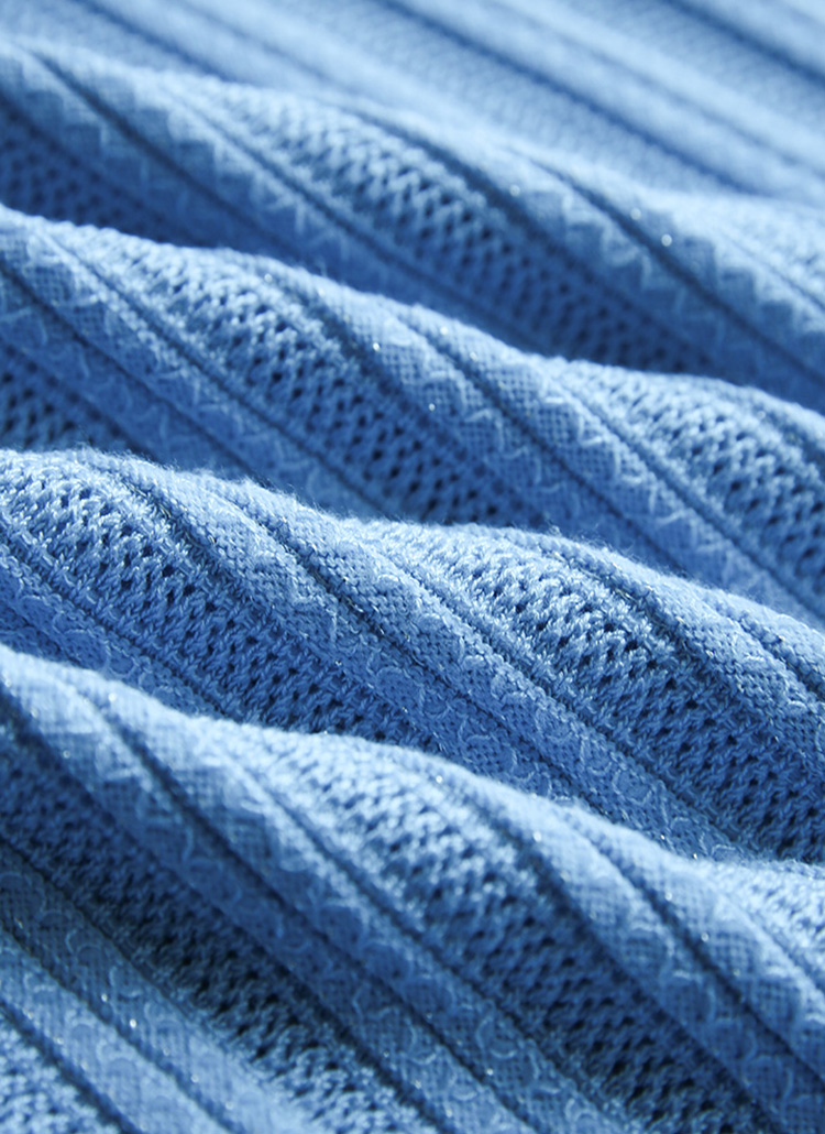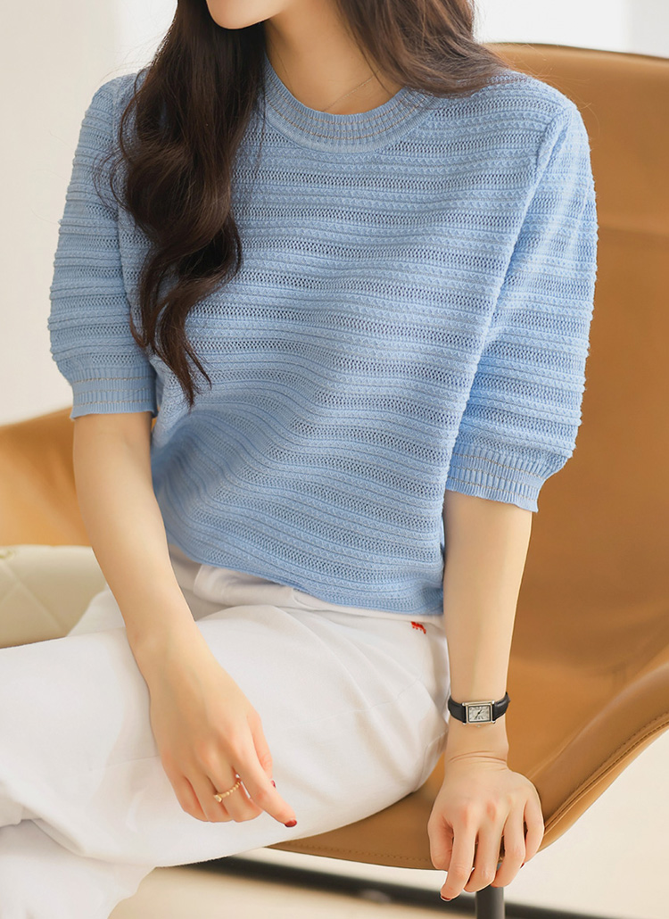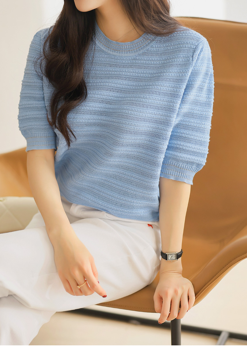 [Textured jacquard stripes and breezy open knit deliver a polished yet relaxed look. The smooth rayon blend feels soft on skin, offering comfort and a naturally elegant drape.]