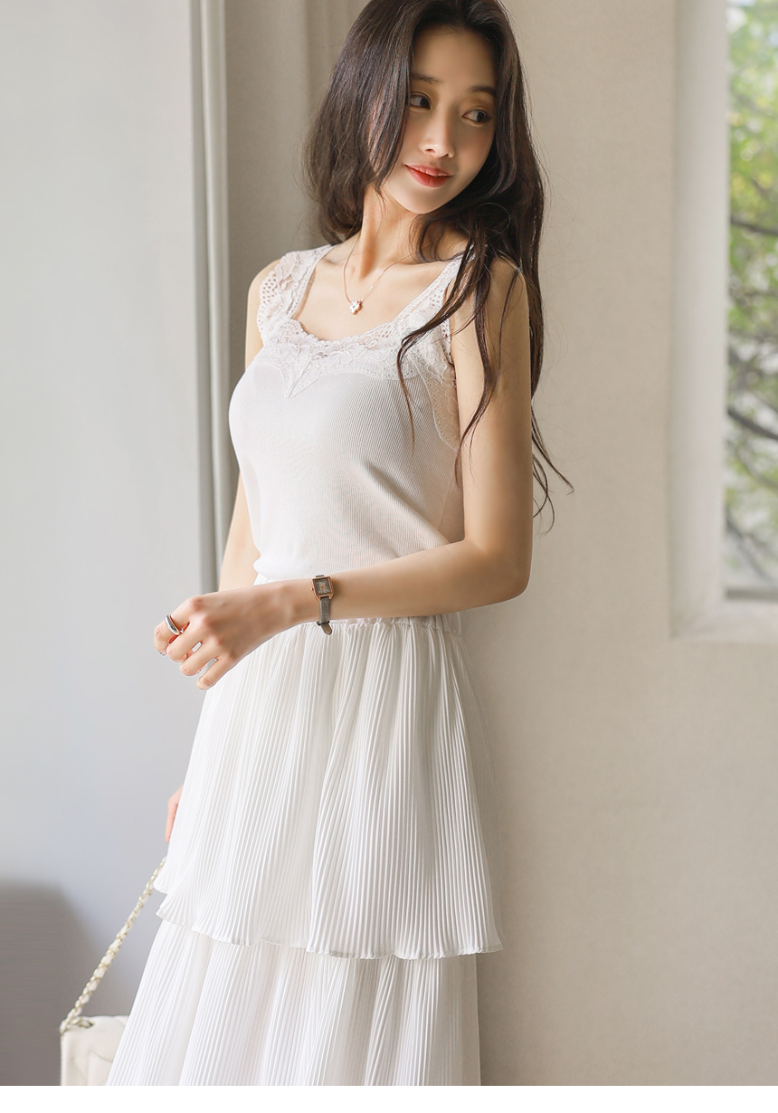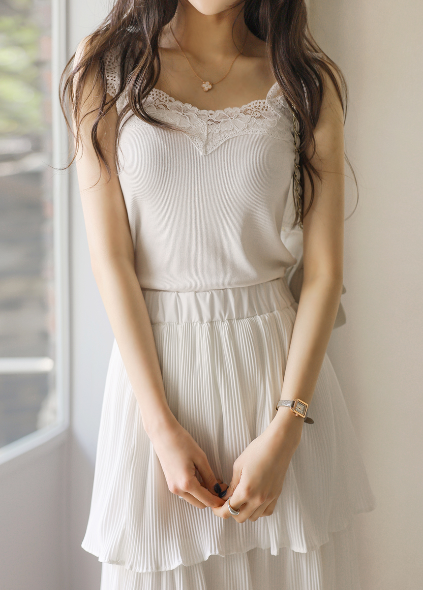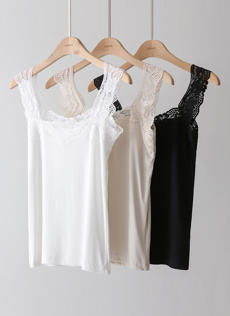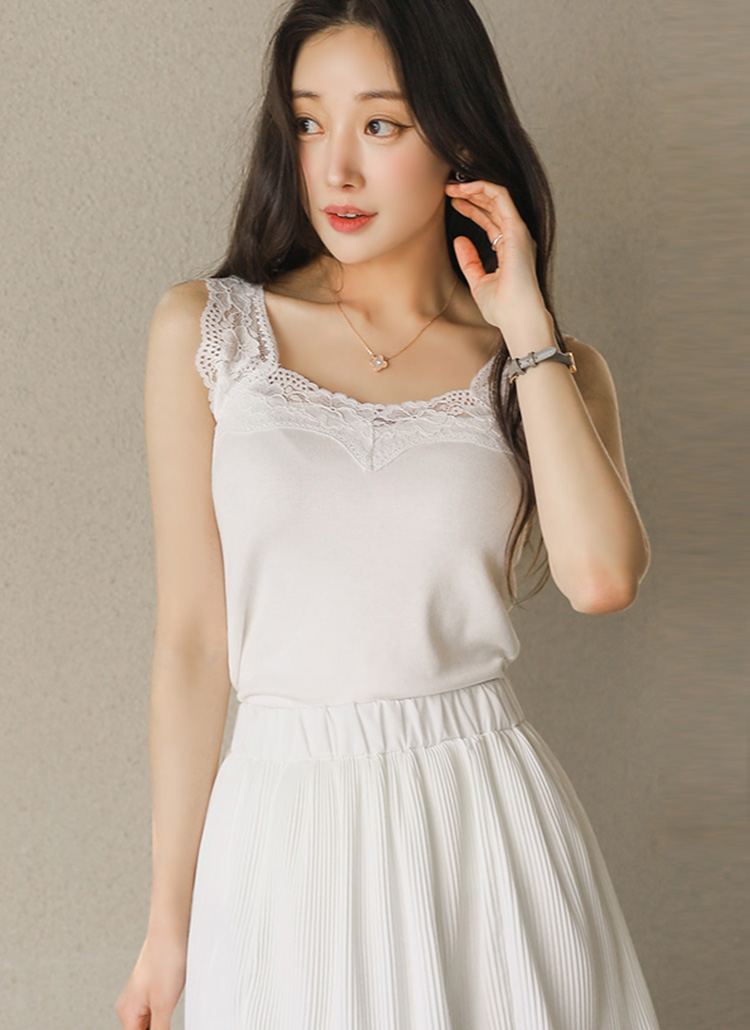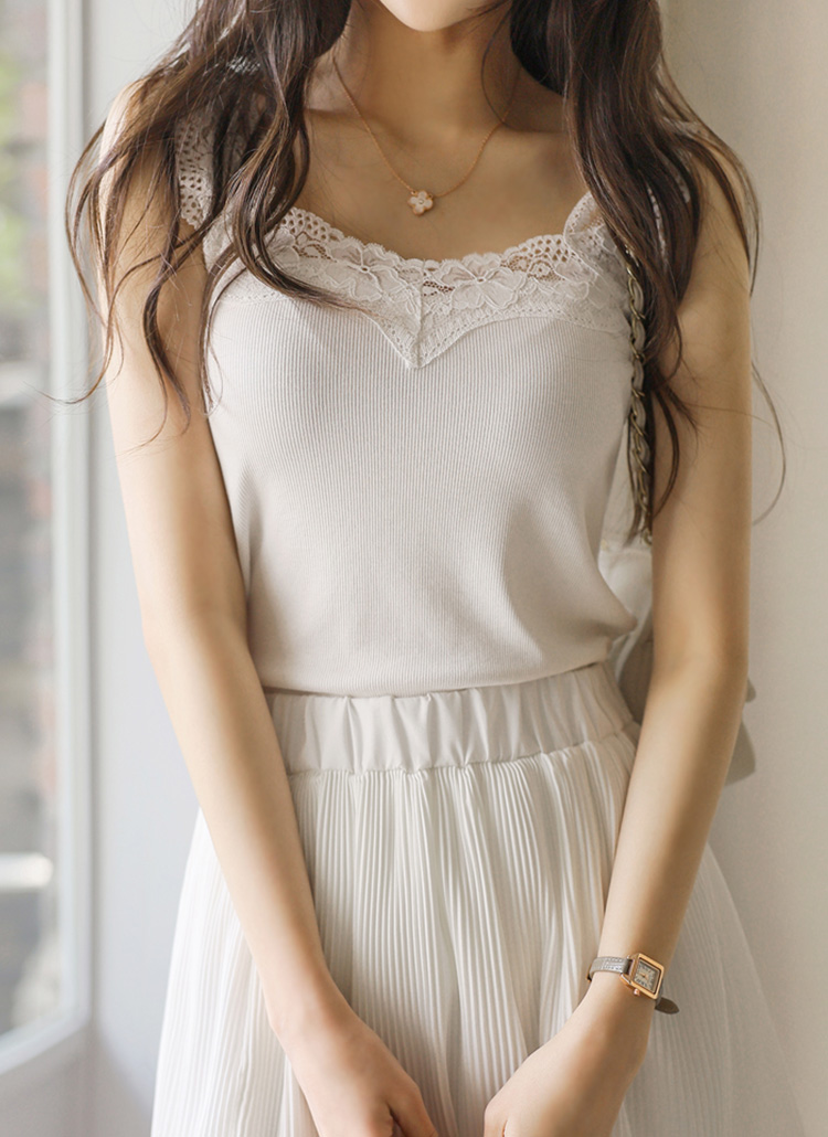 [Lace-detailed straps and neckline bring refined charm to this slim cami. Crafted from flexible fabric, it moves with you while maintaining a sleek, flattering silhouette.]