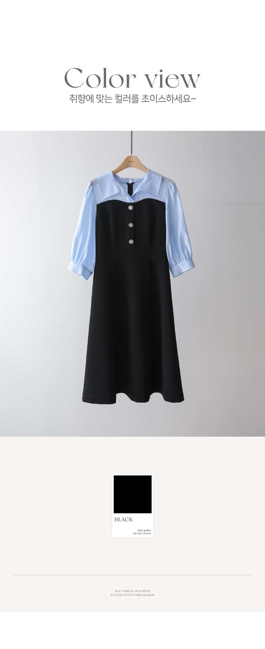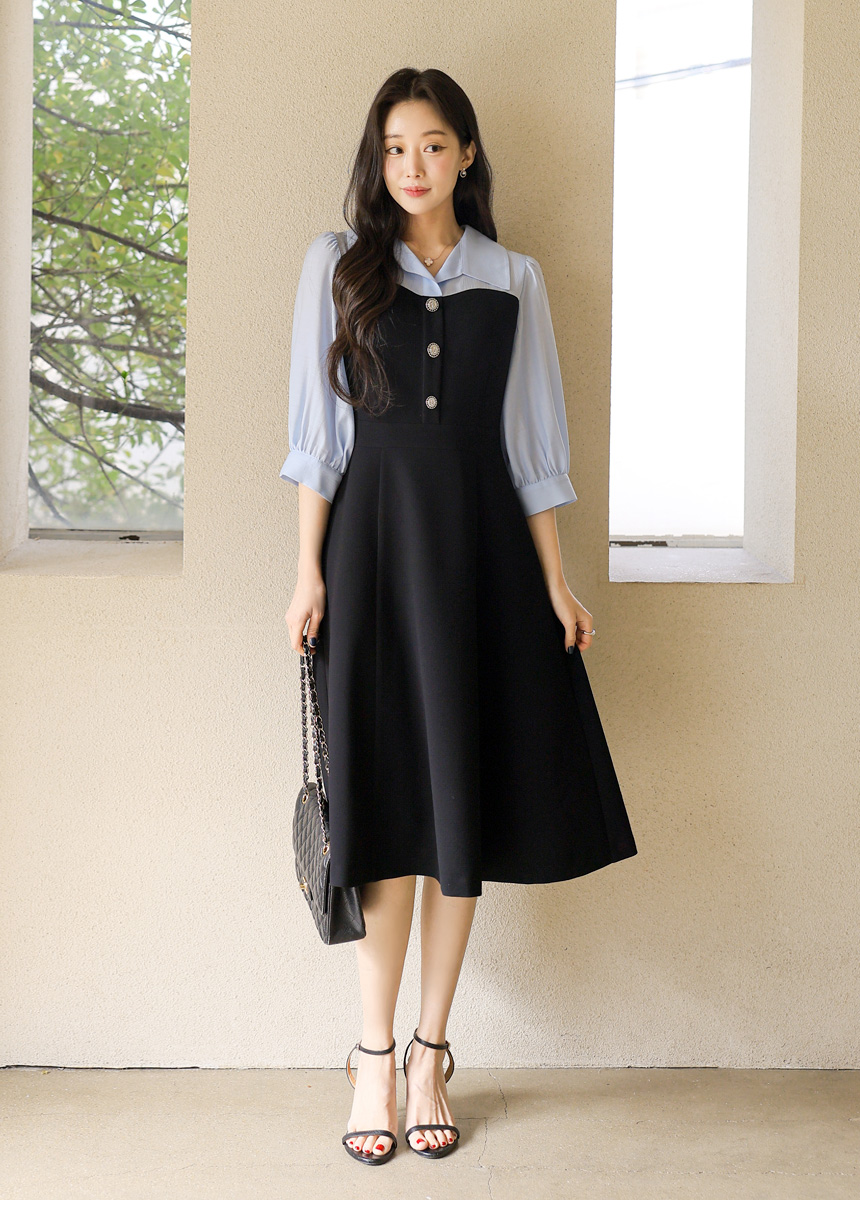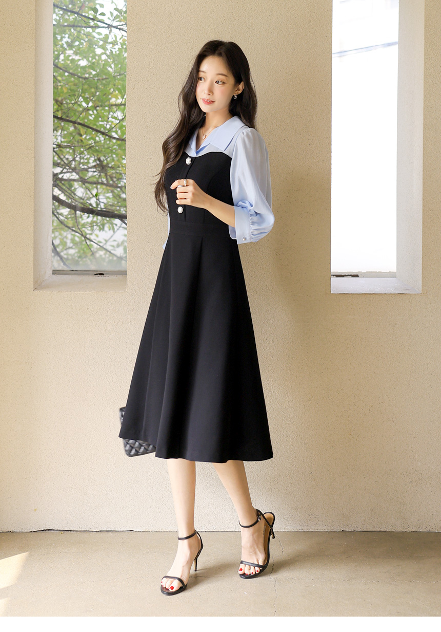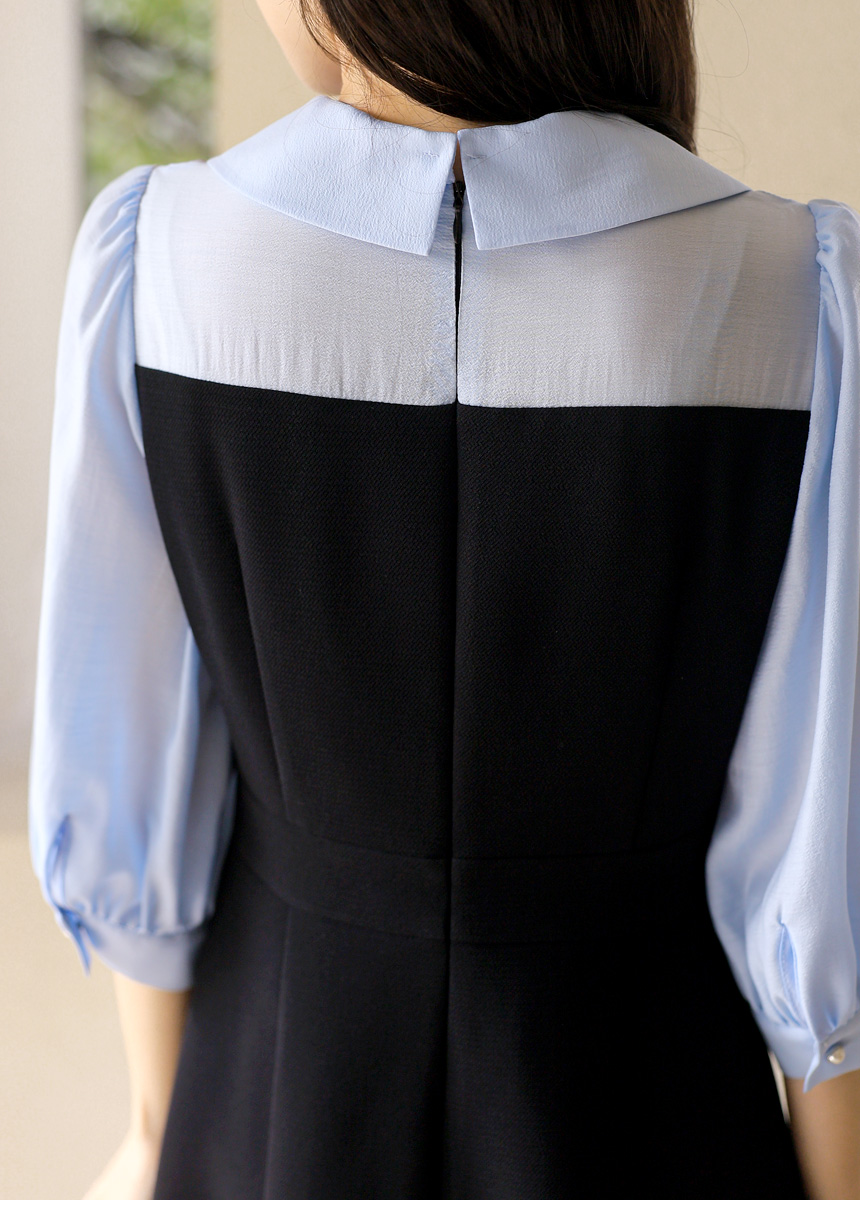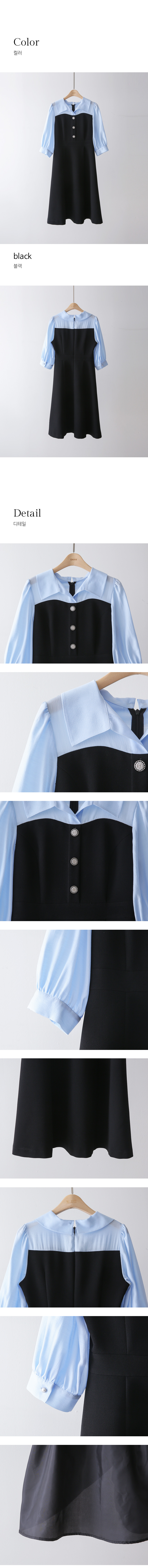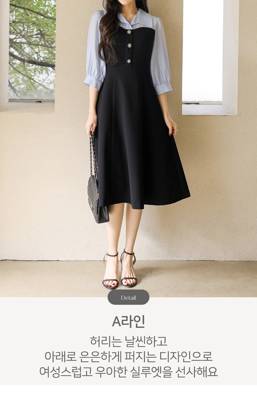 [LouisAngel] A라인 플레어 하트라인 배색 카라 퍼프 7부소매 롱 원피스