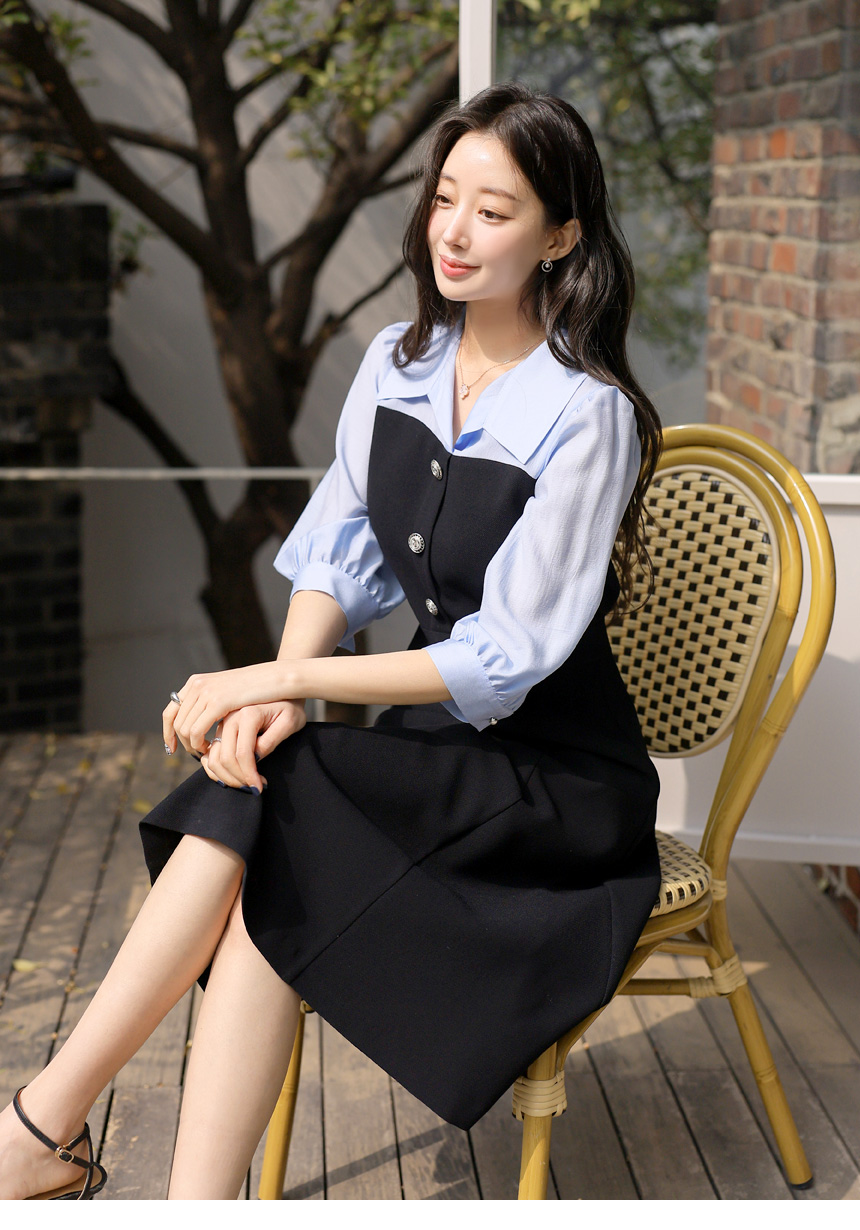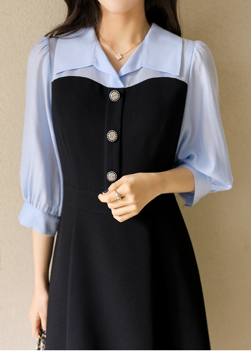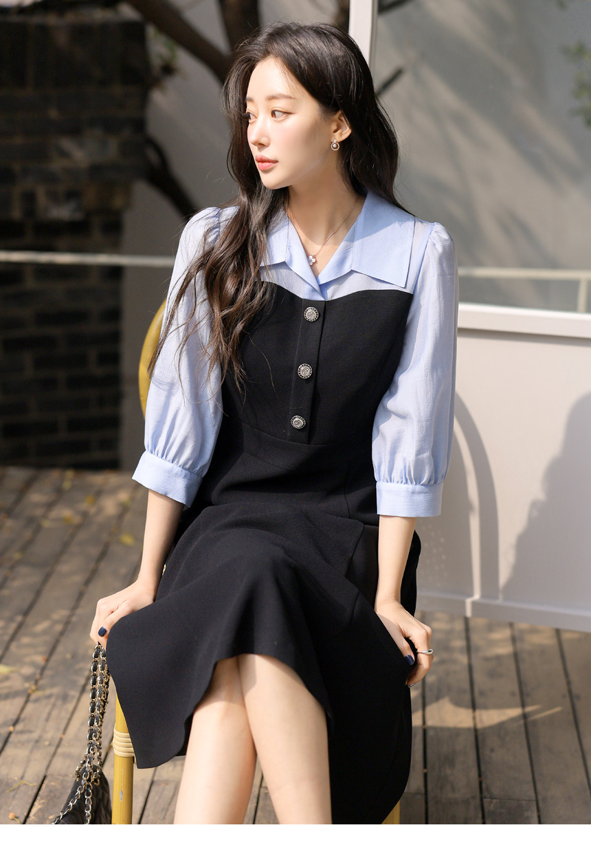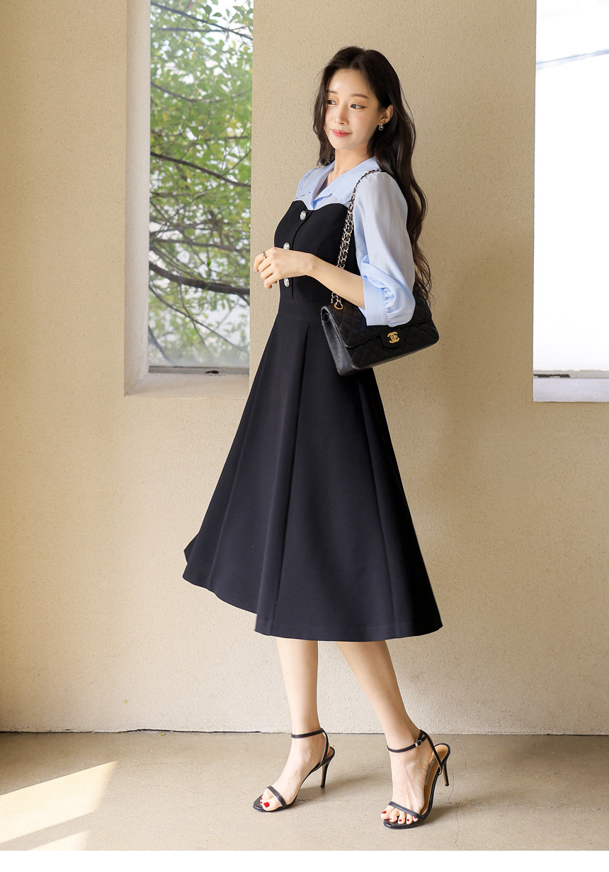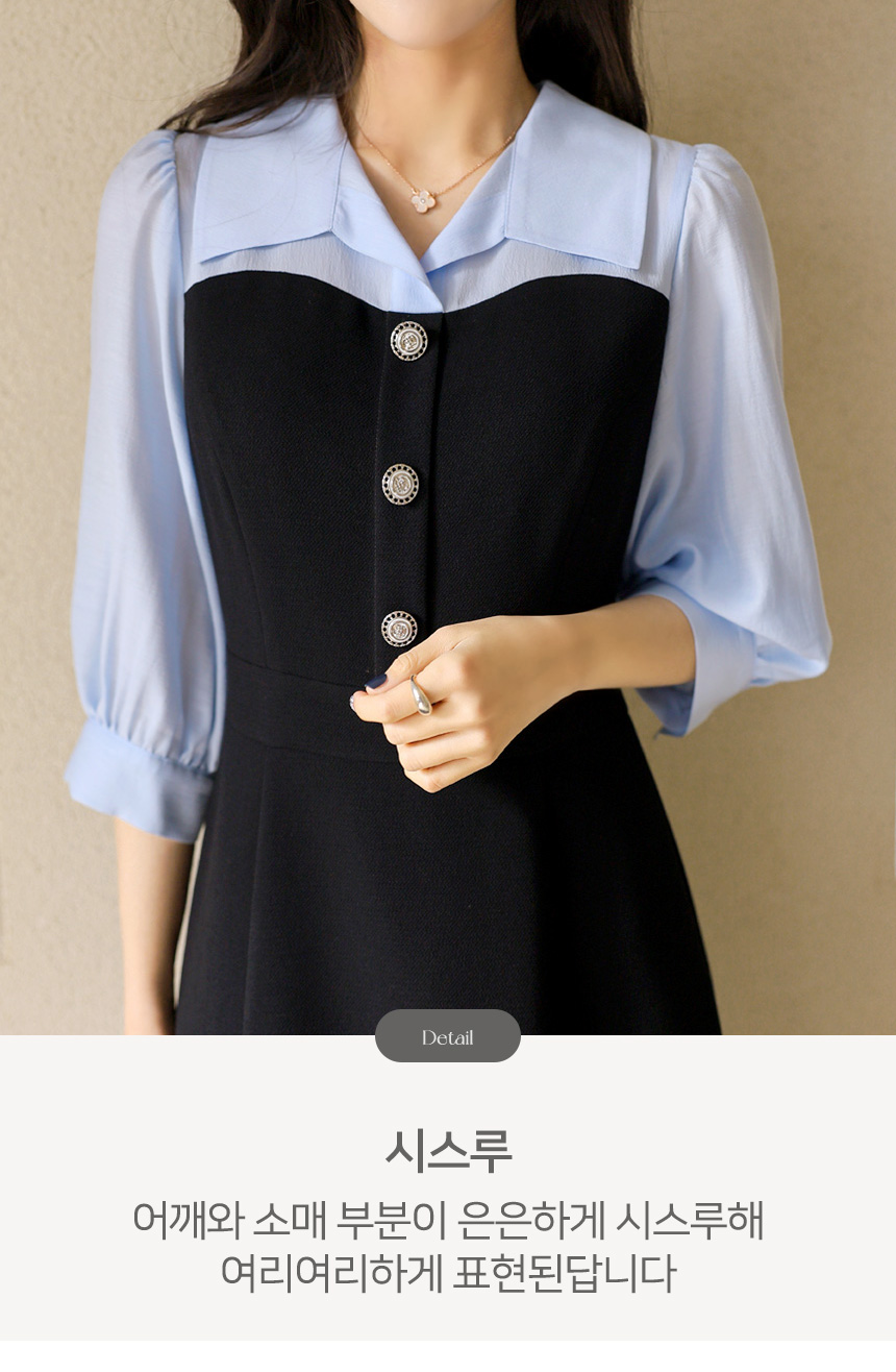 [LouisAngel] A라인 플레어 하트라인 배색 카라 퍼프 7부소매 롱 원피스