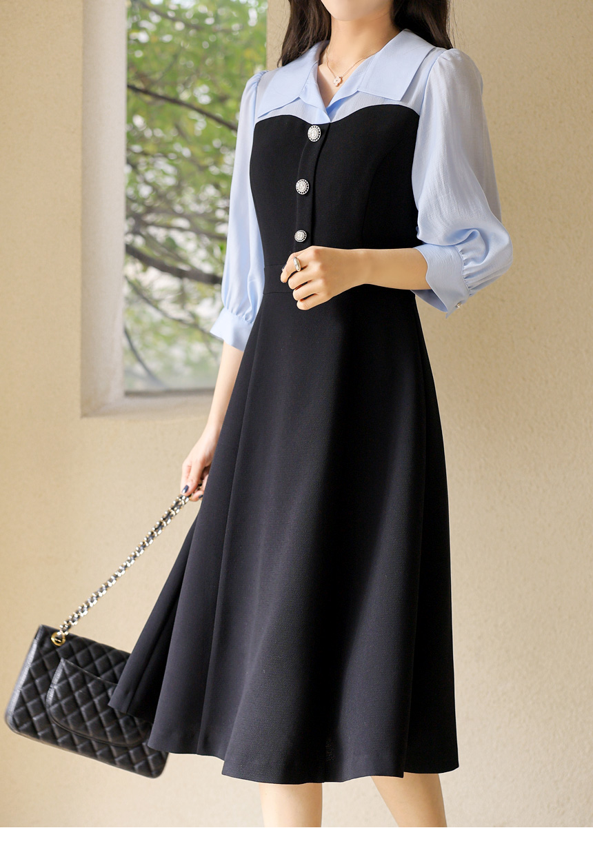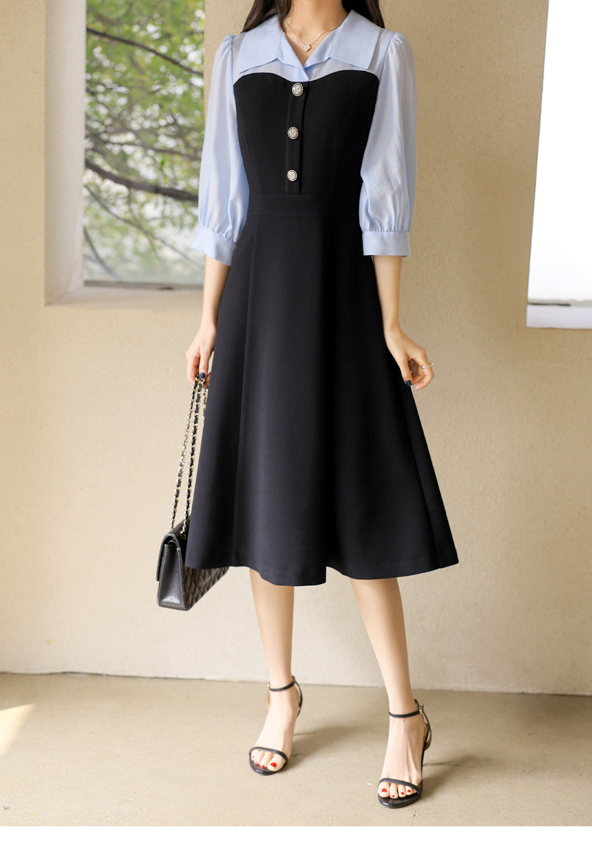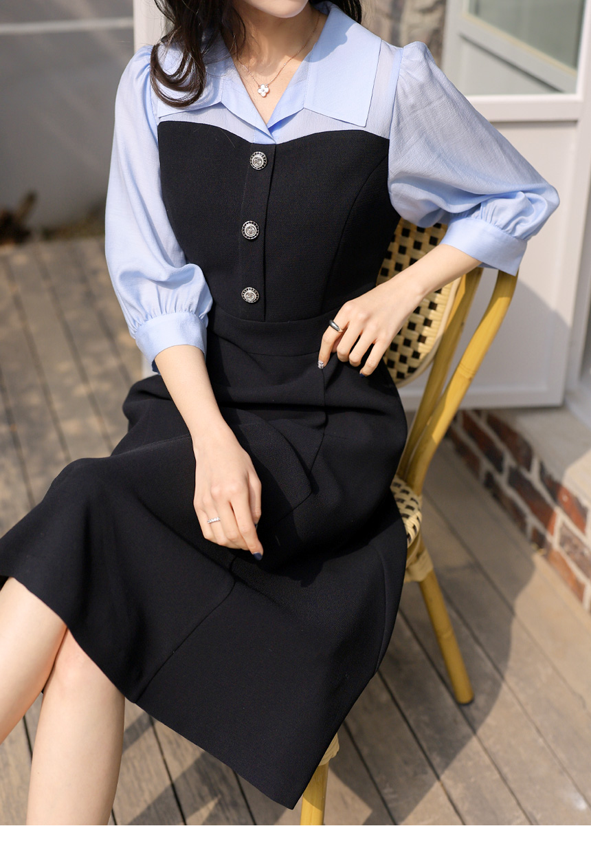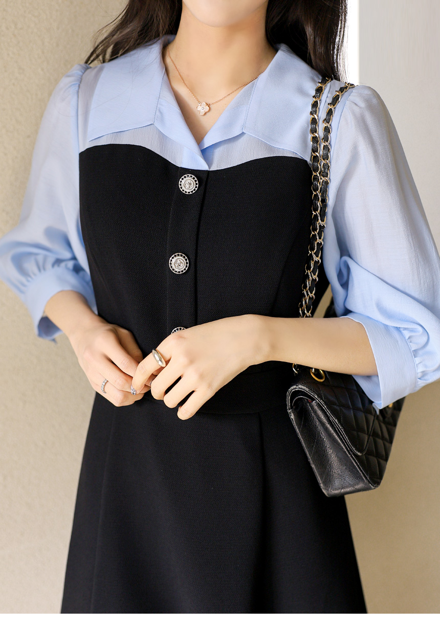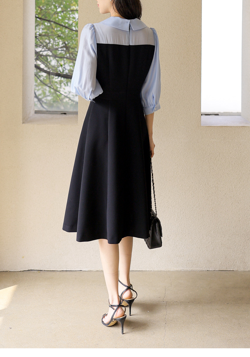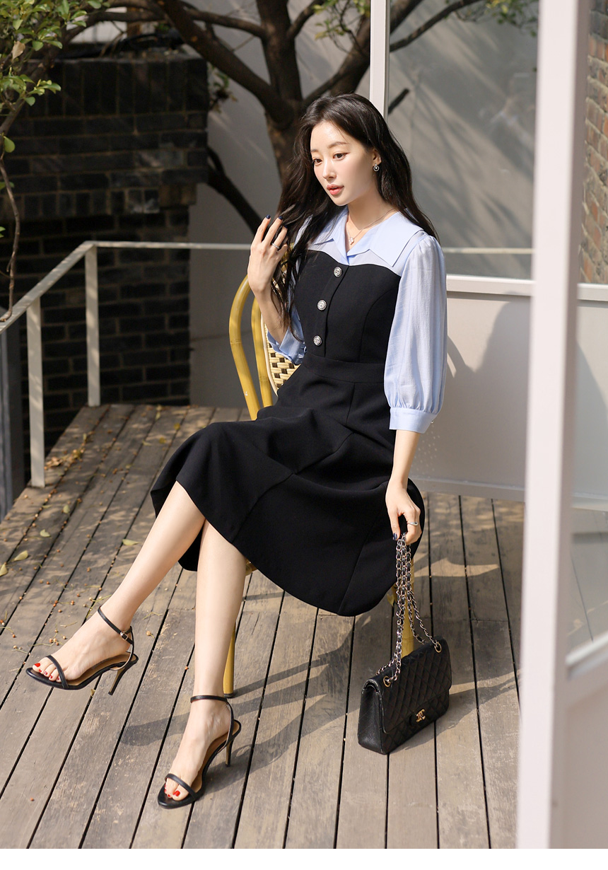 [LouisAngel] A라인 플레어 하트라인 배색 카라 퍼프 7부소매 롱 원피스