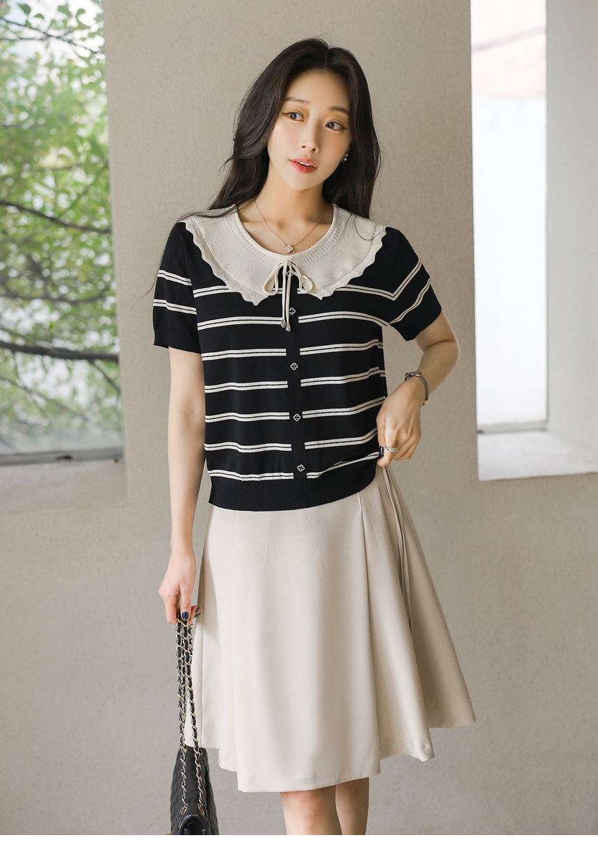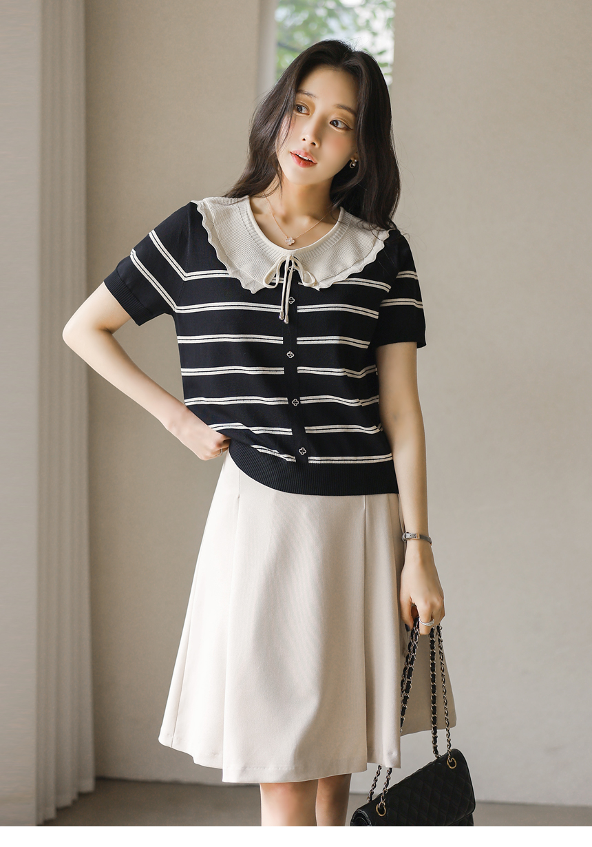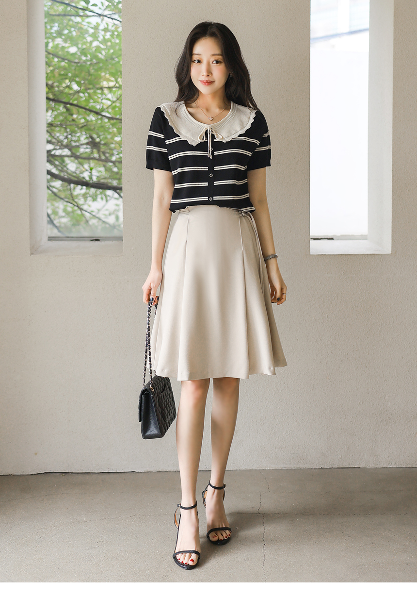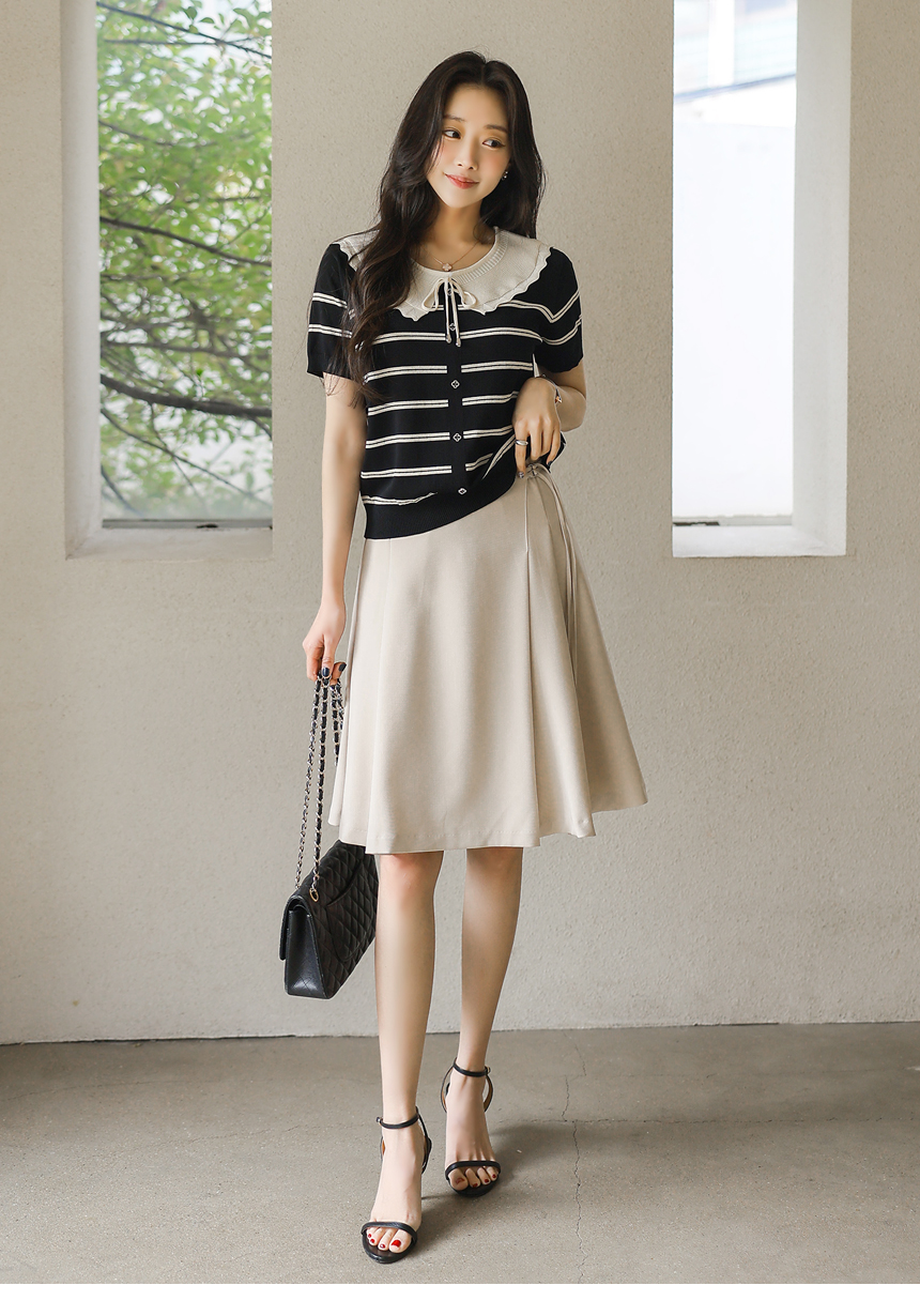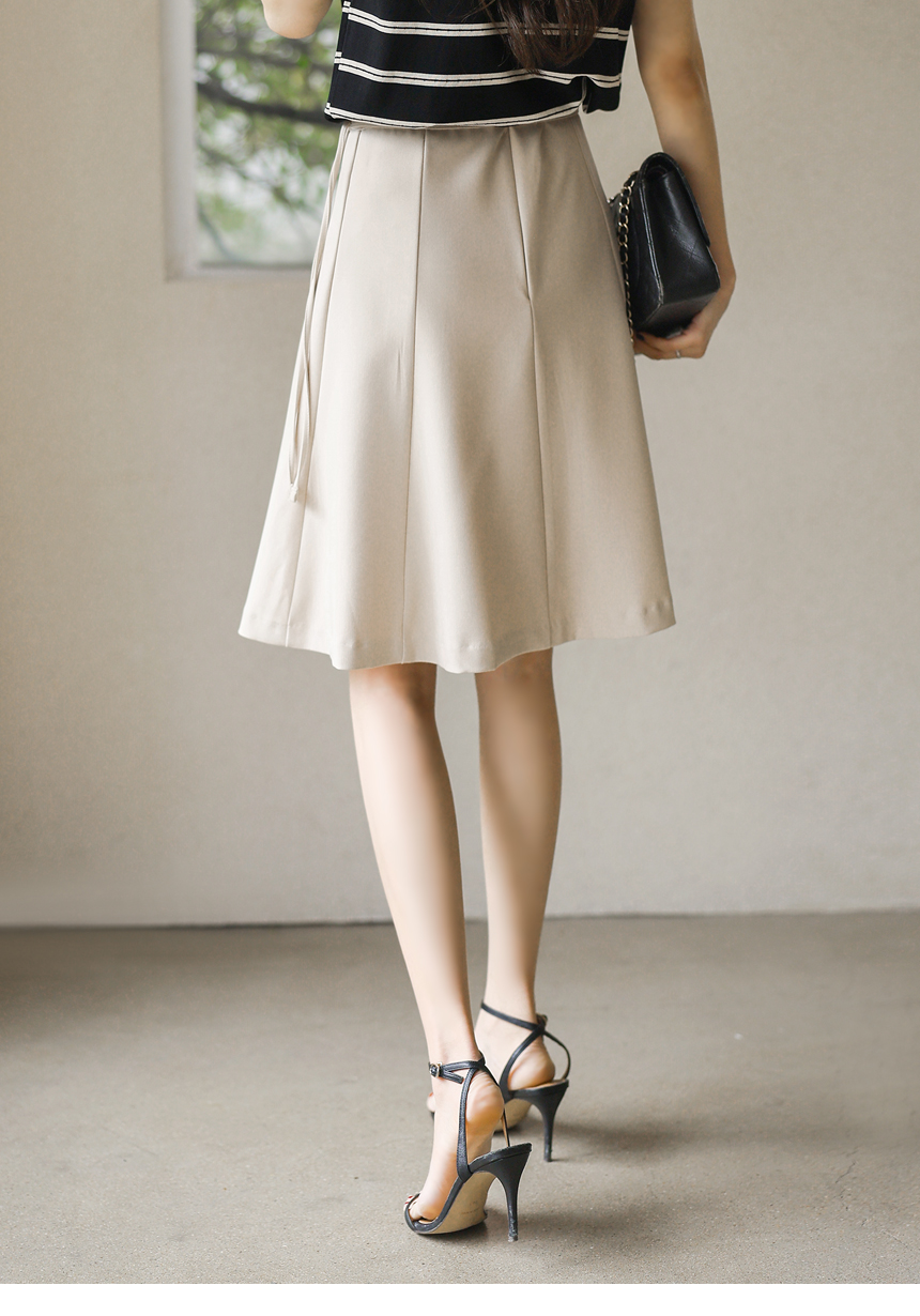 우아하게 퍼지는 A라인 실루엣이 돋보이는 플레어 미디 스커트로