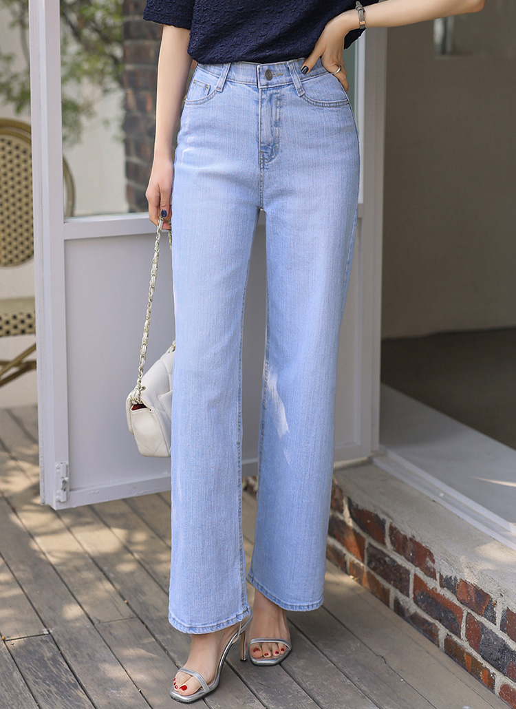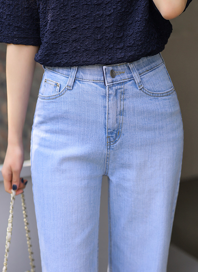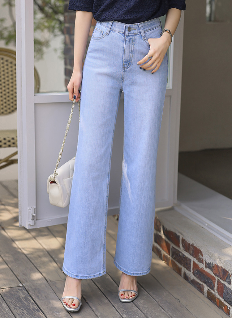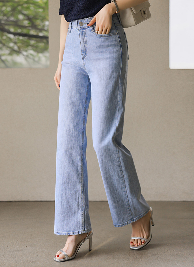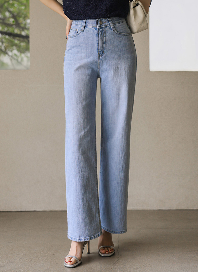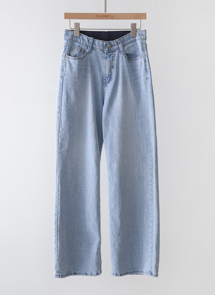 [Clean light wash denim with a semi-wide straight fit creates a long, streamlined silhouette, while stretch-infused fabric and hidden waistband ensure all-day comfort and ease.]