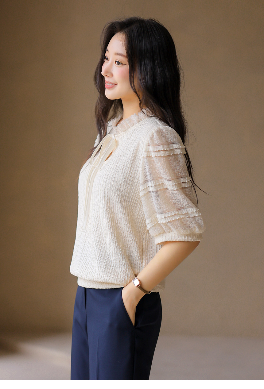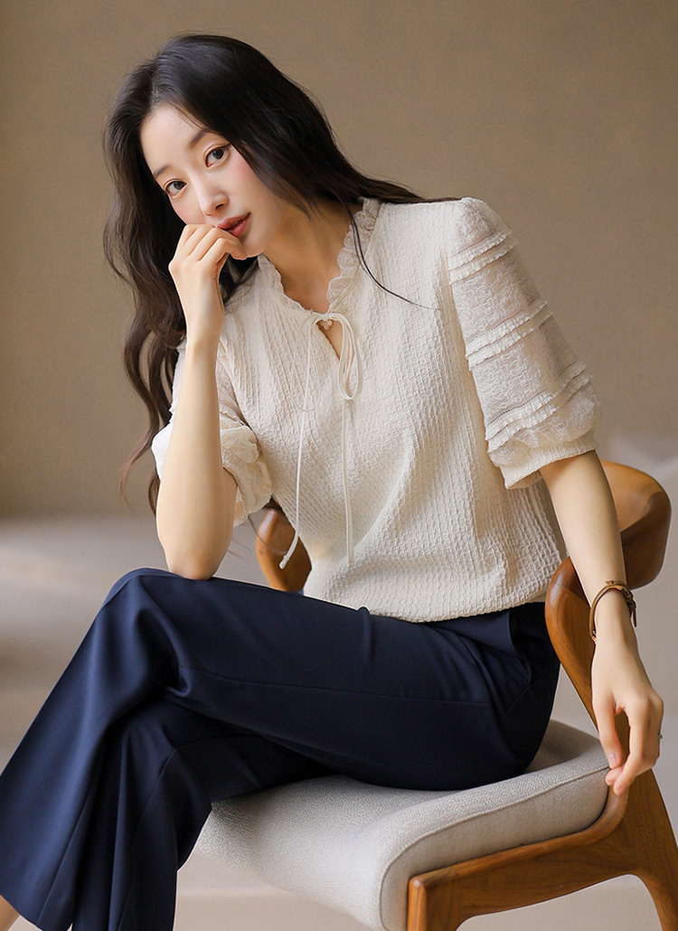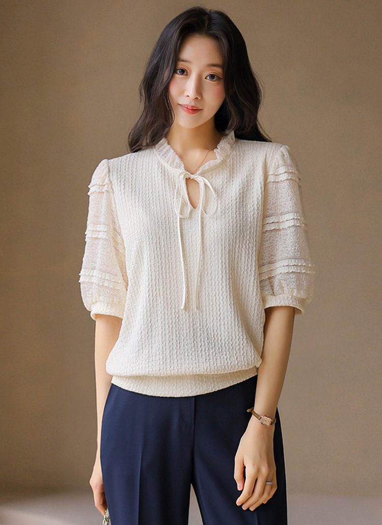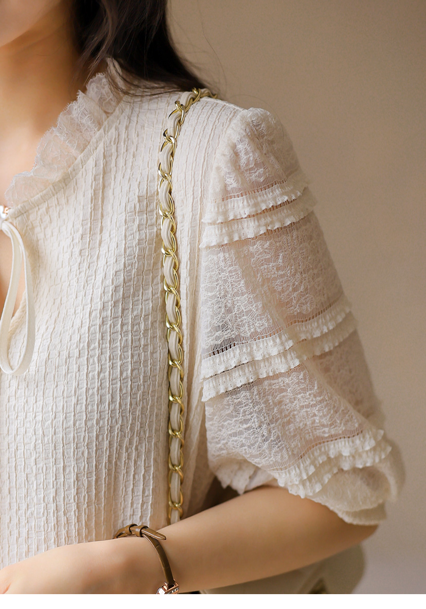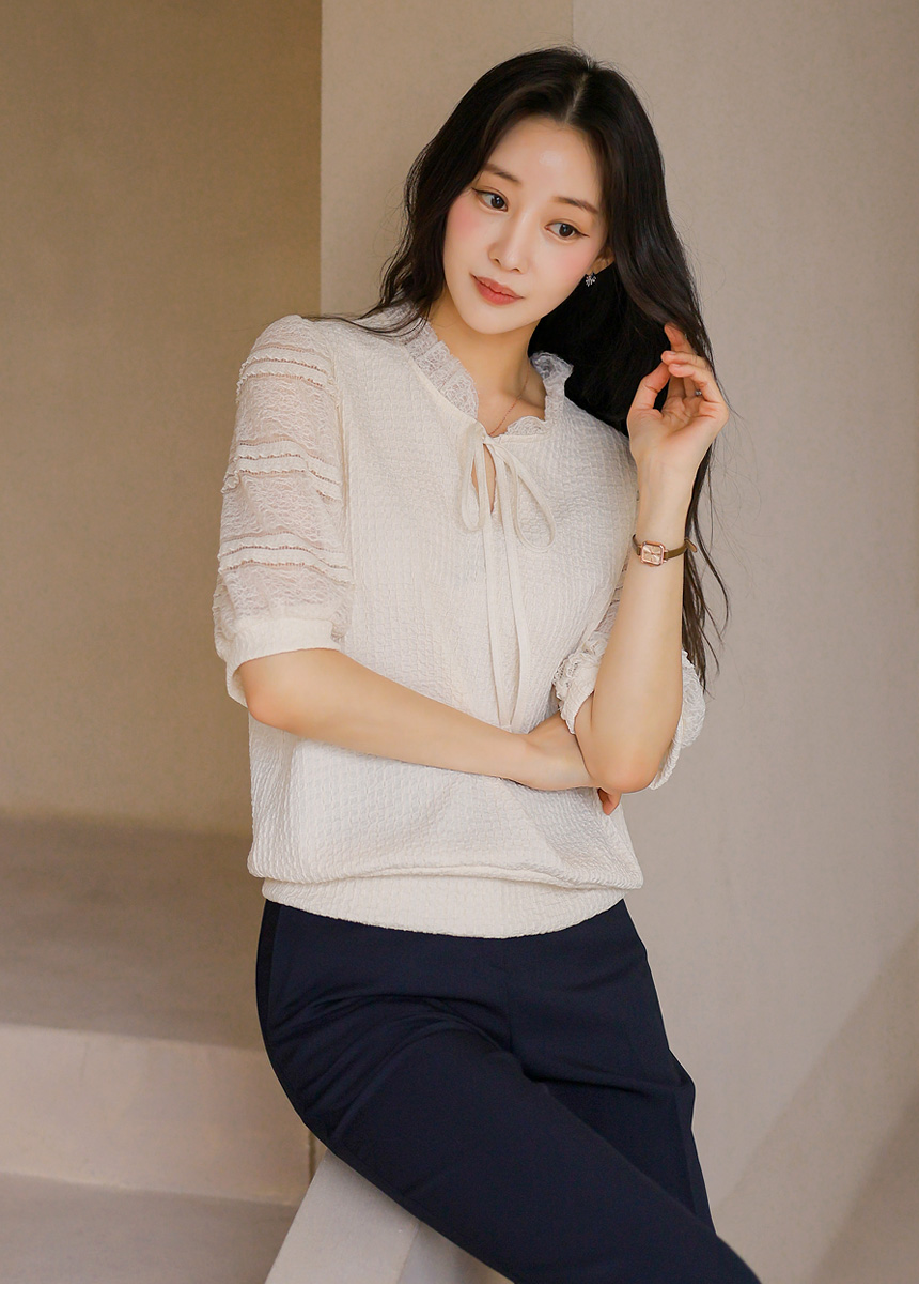 [LouisAngel] 시스루 레이스 배색 프릴 쟈가드 블라우스 티