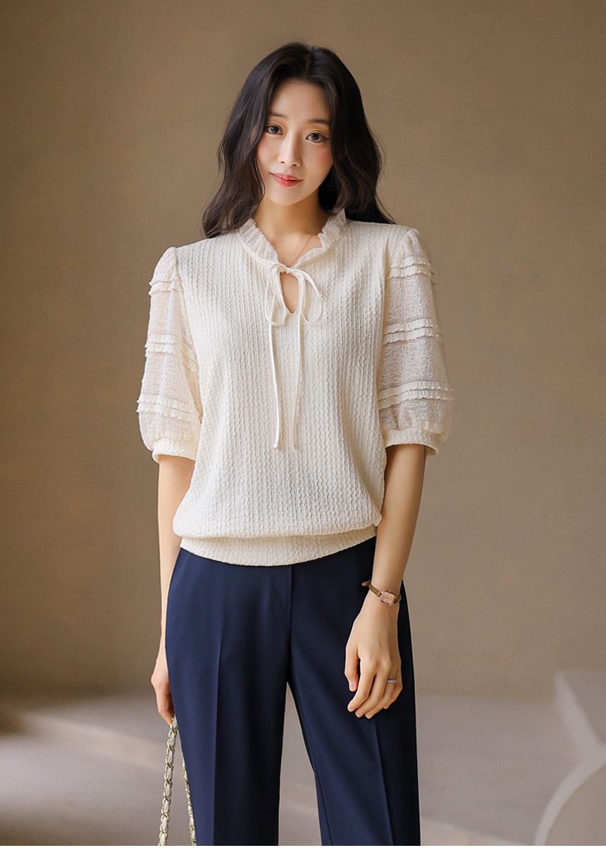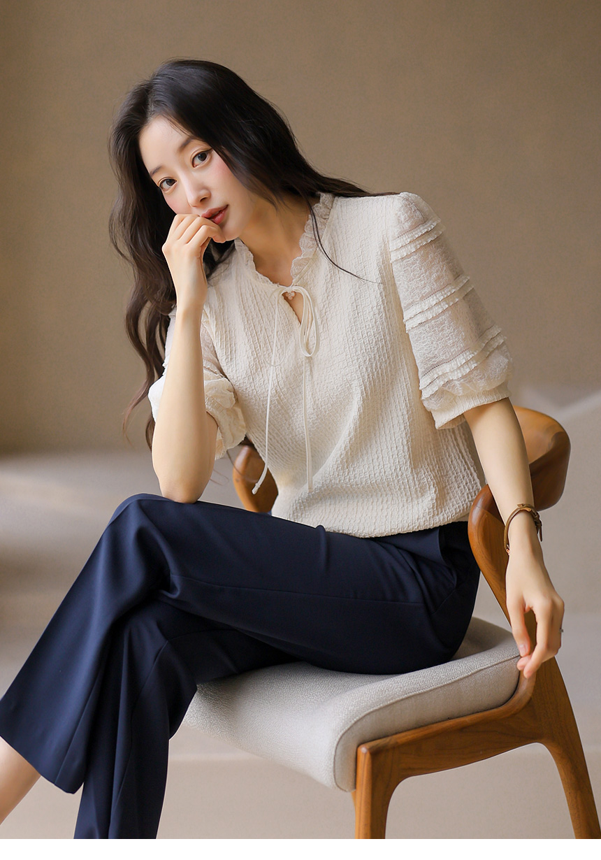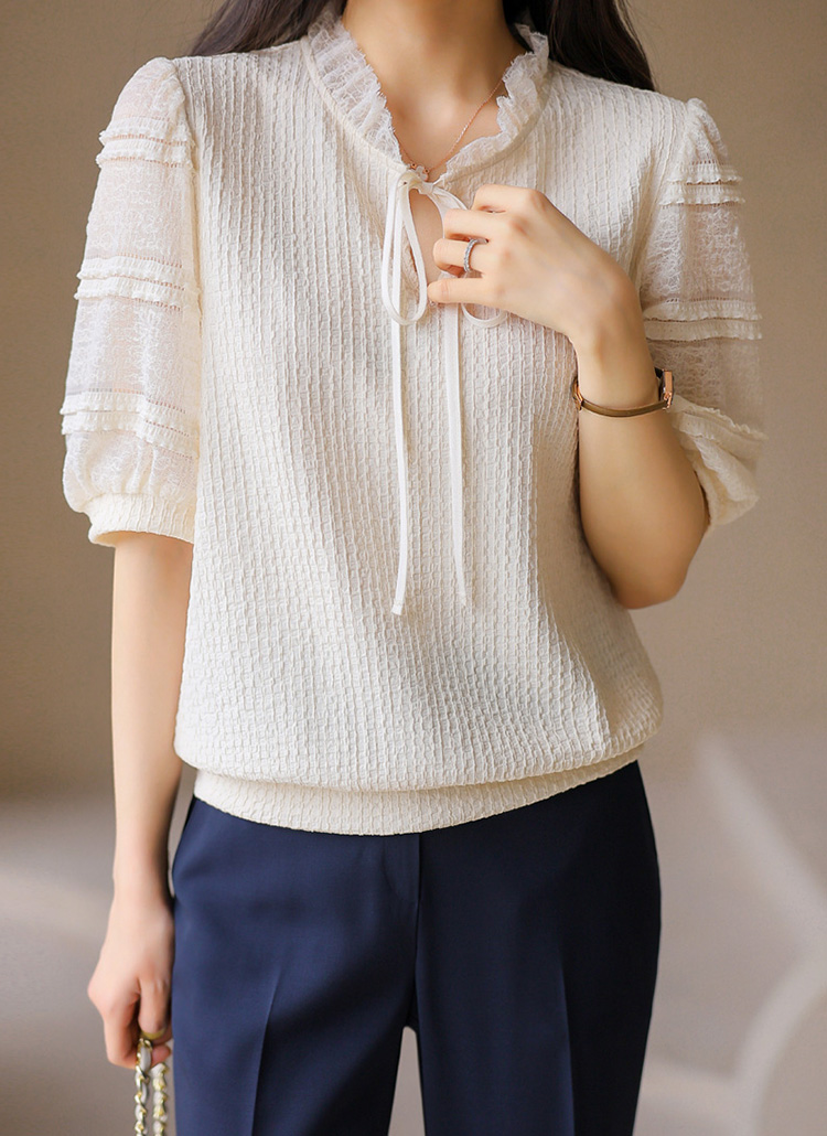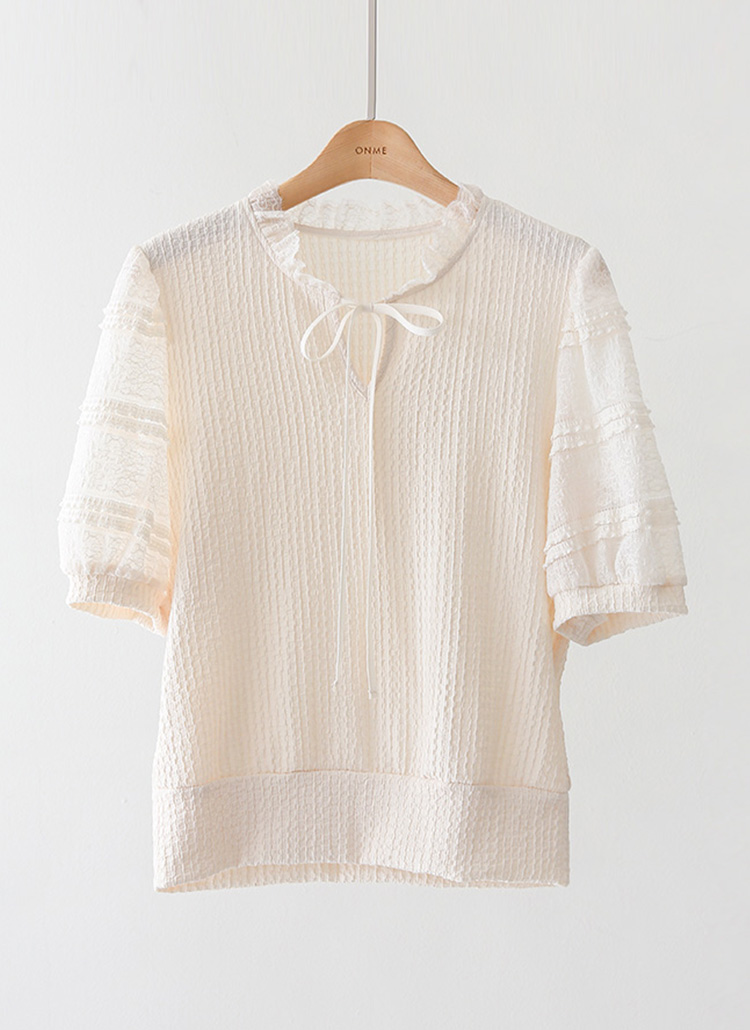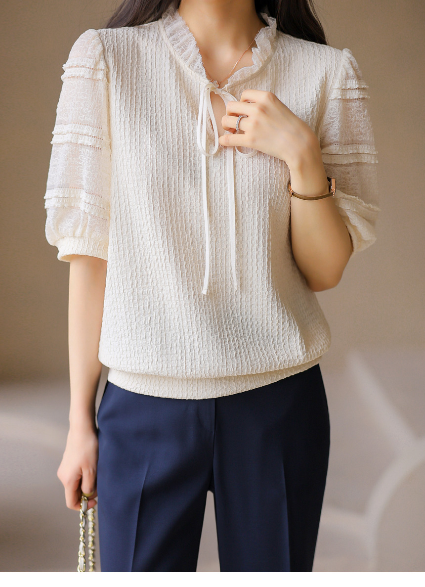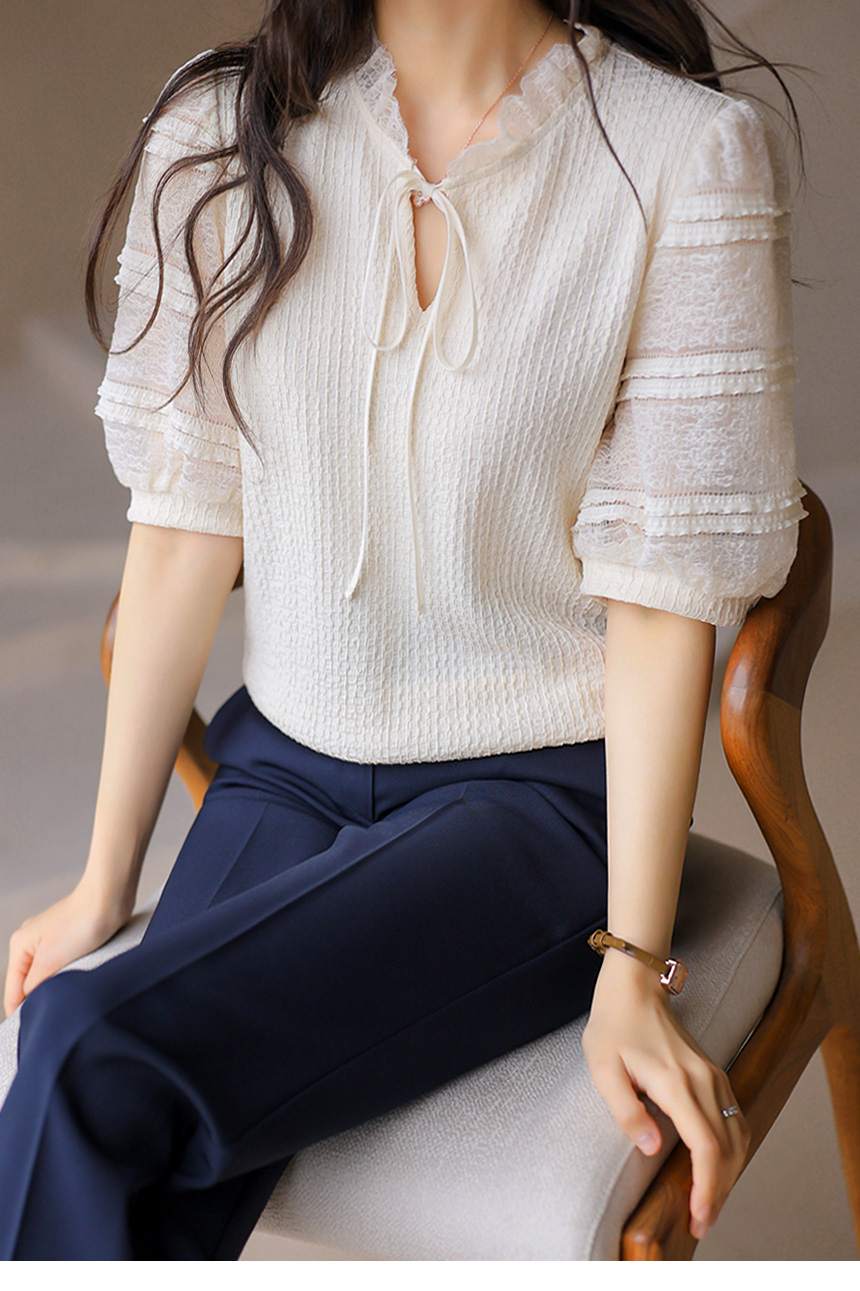 [LouisAngel] 시스루 레이스 배색 프릴 쟈가드 블라우스 티