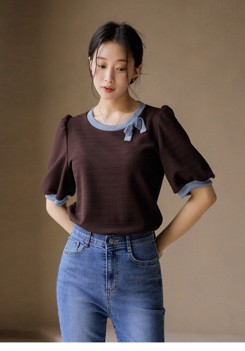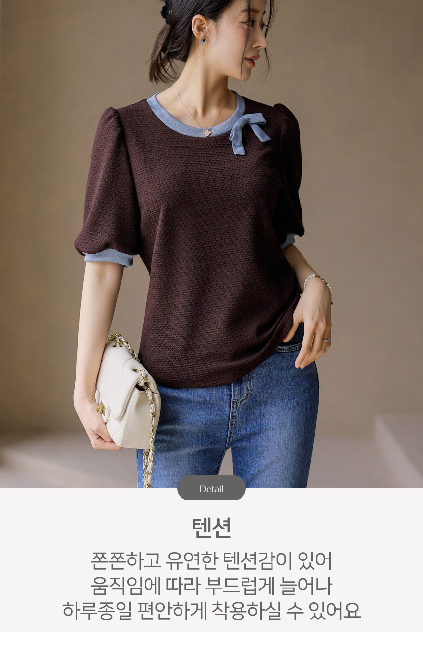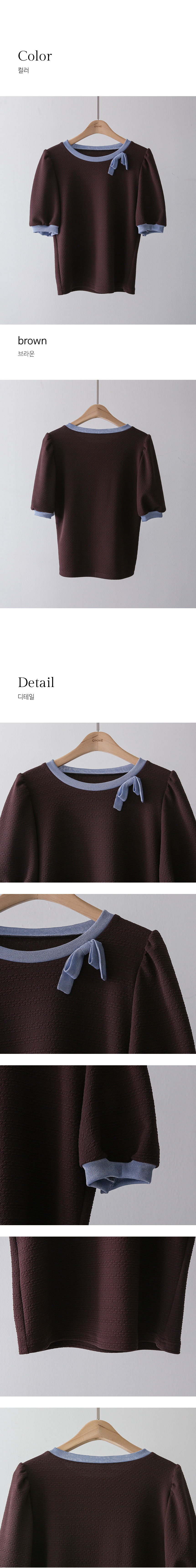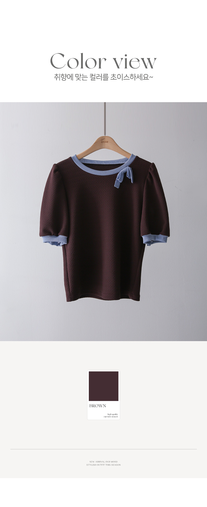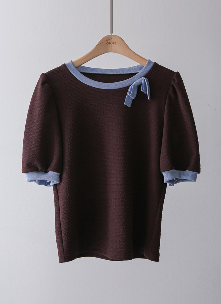 [LouisAngel] 펄 라인 리본 배색 쟈가드 퍼프 소매 블라우스 티