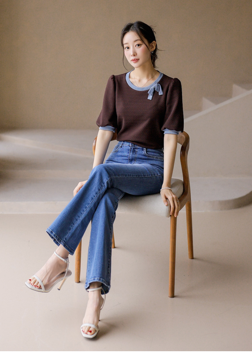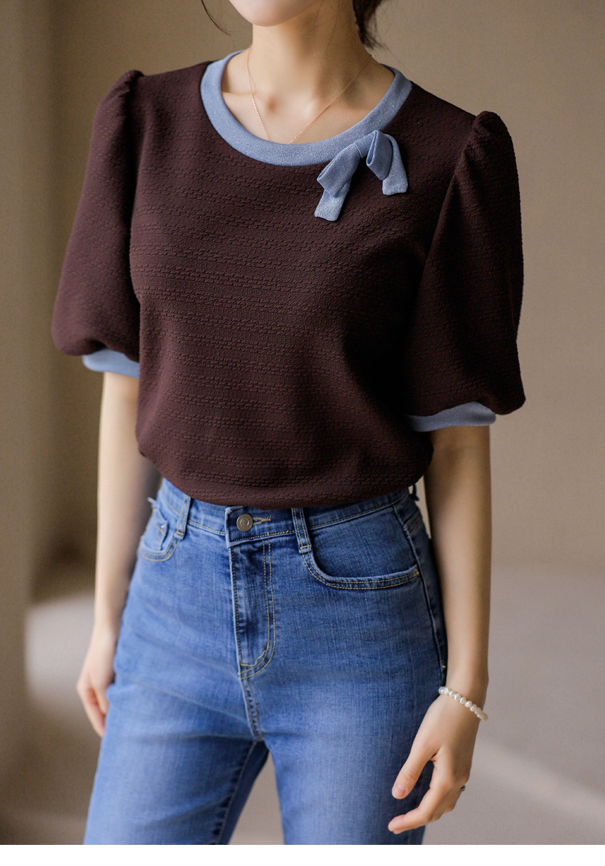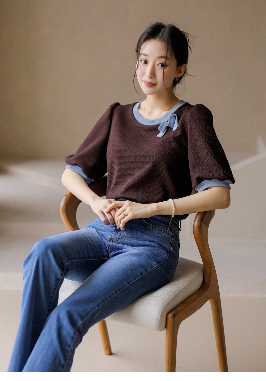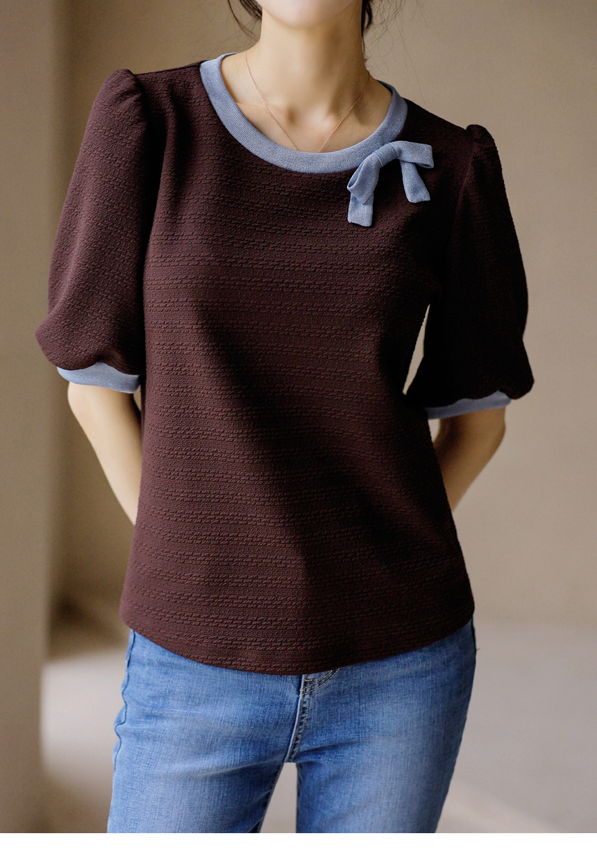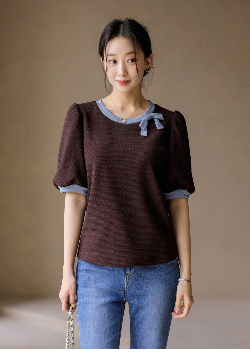 [LouisAngel] 펄 라인 리본 배색 쟈가드 퍼프 소매 블라우스 티